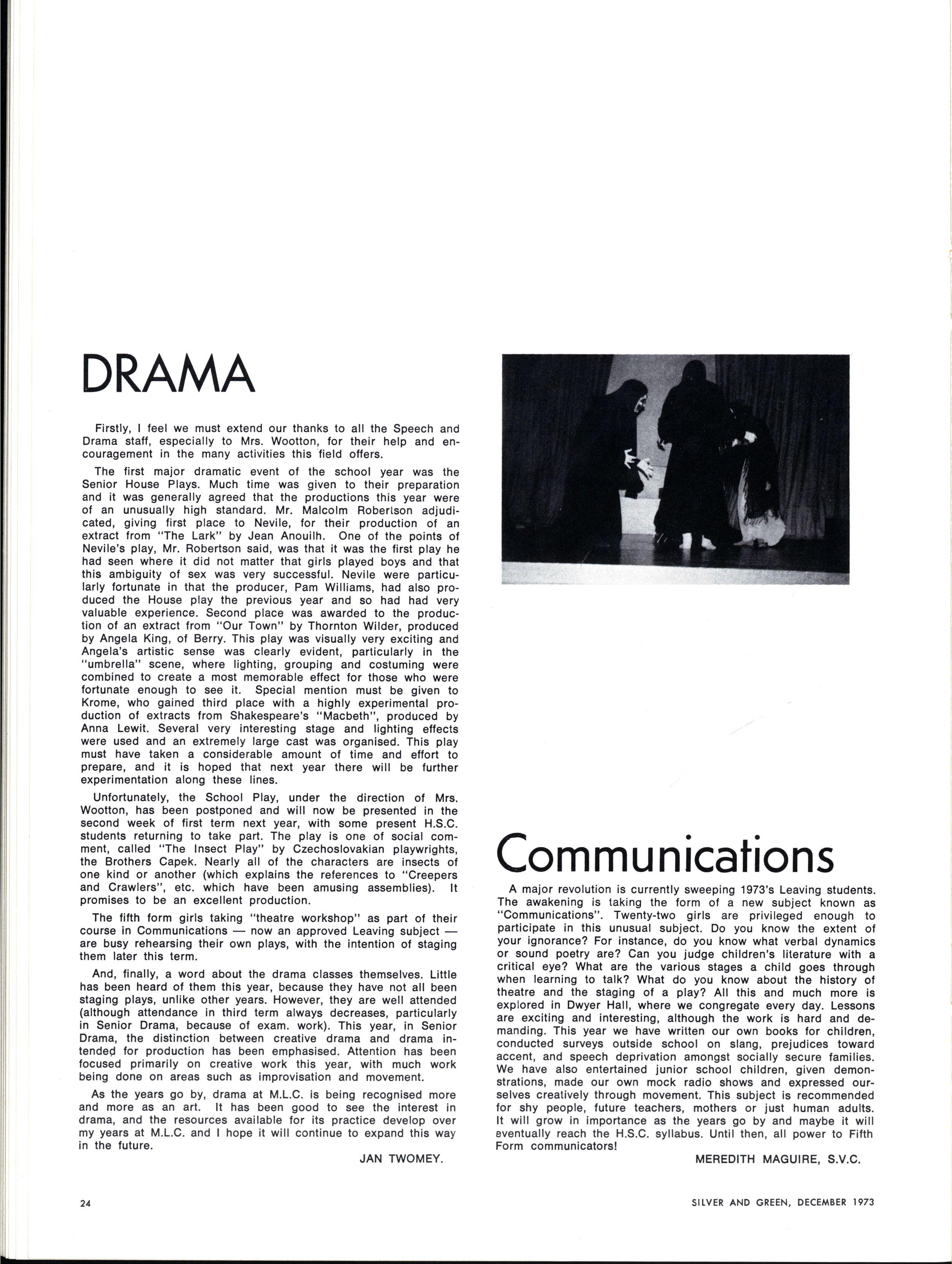 Those who have left M.L.C would remember Miss Sutton mainly as a teacher She enjoyed Literature and History very much and was able to communicate this to her students The excellent results her students gained indicates some of their excitement in the subject. Miss Sutton has very interesting ideas on education She welcomes new methods and enjoys adapting herself to different areas of knowledge and different educational ideas. She has taught many subjects at all levels of the school It was very illuminating that in her final year at M.L.C she chose to teach History to first form. The change from H.S.C. classes to Form I must have been colossal: yet both she and the students enjoyed the lessons enormously