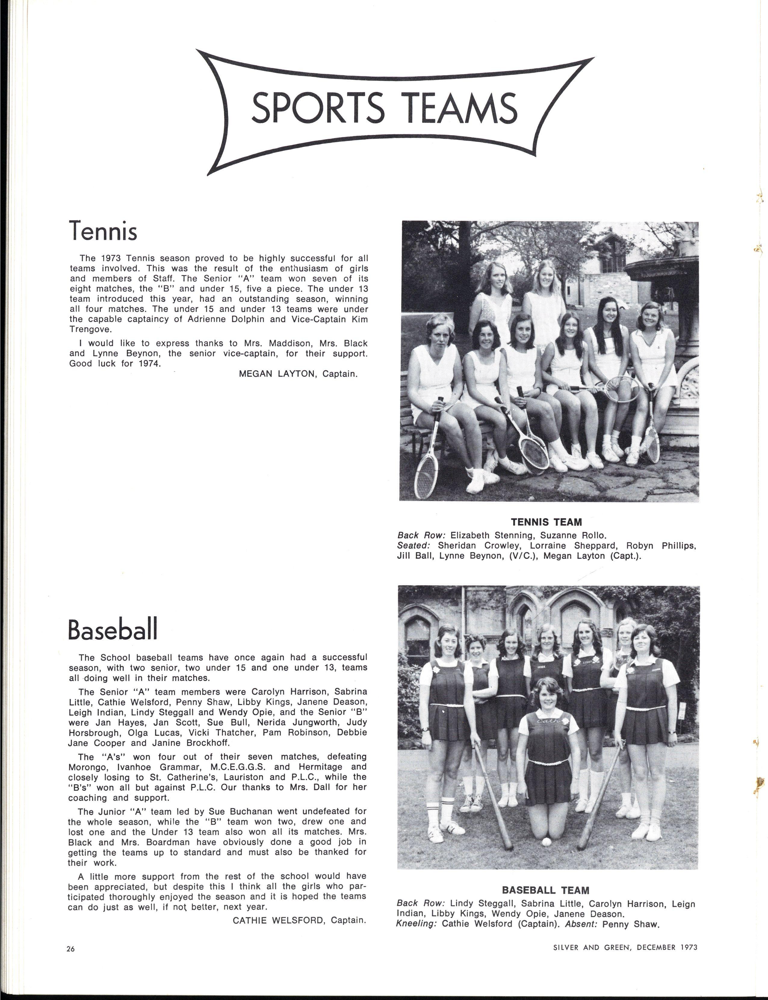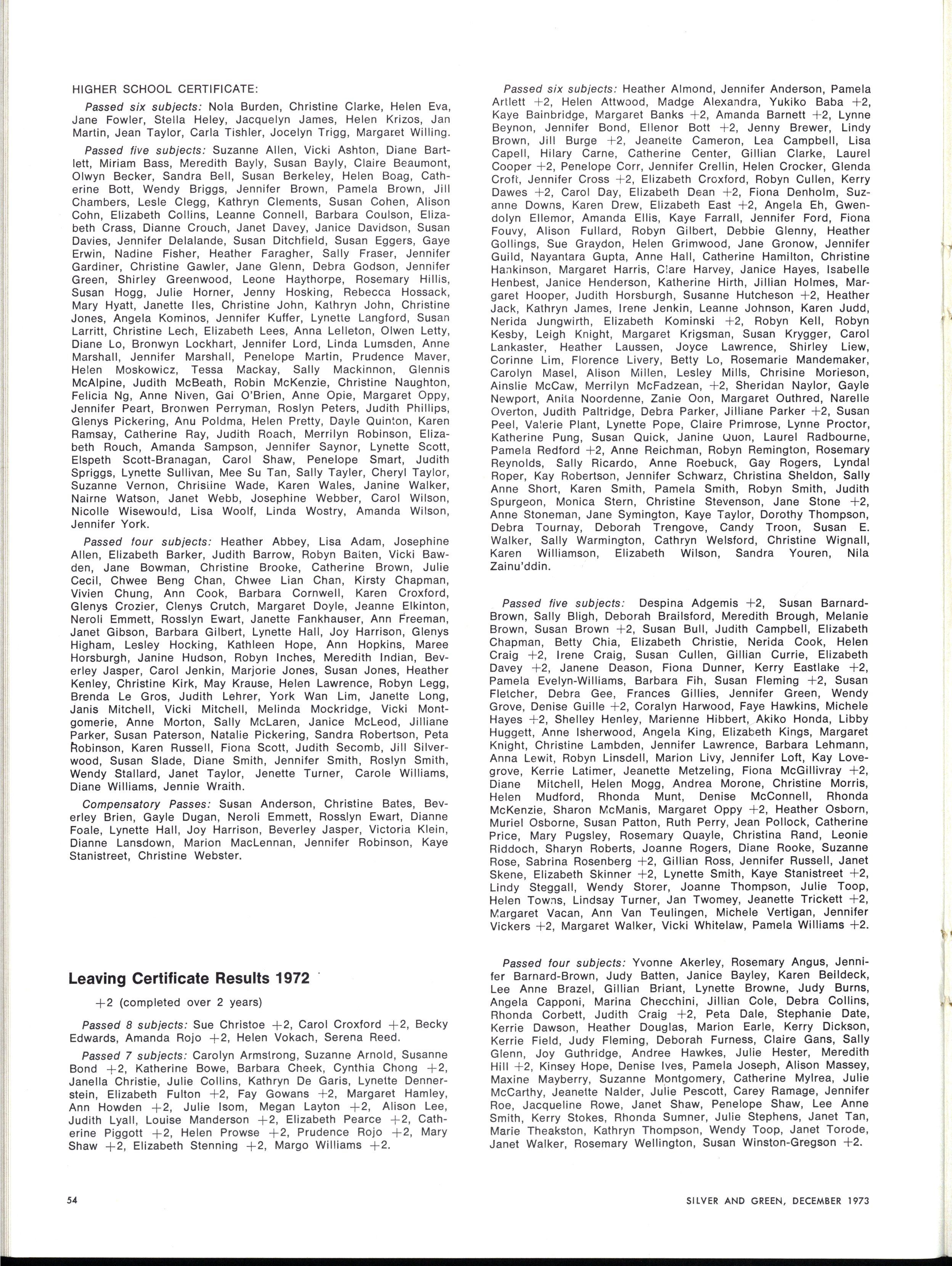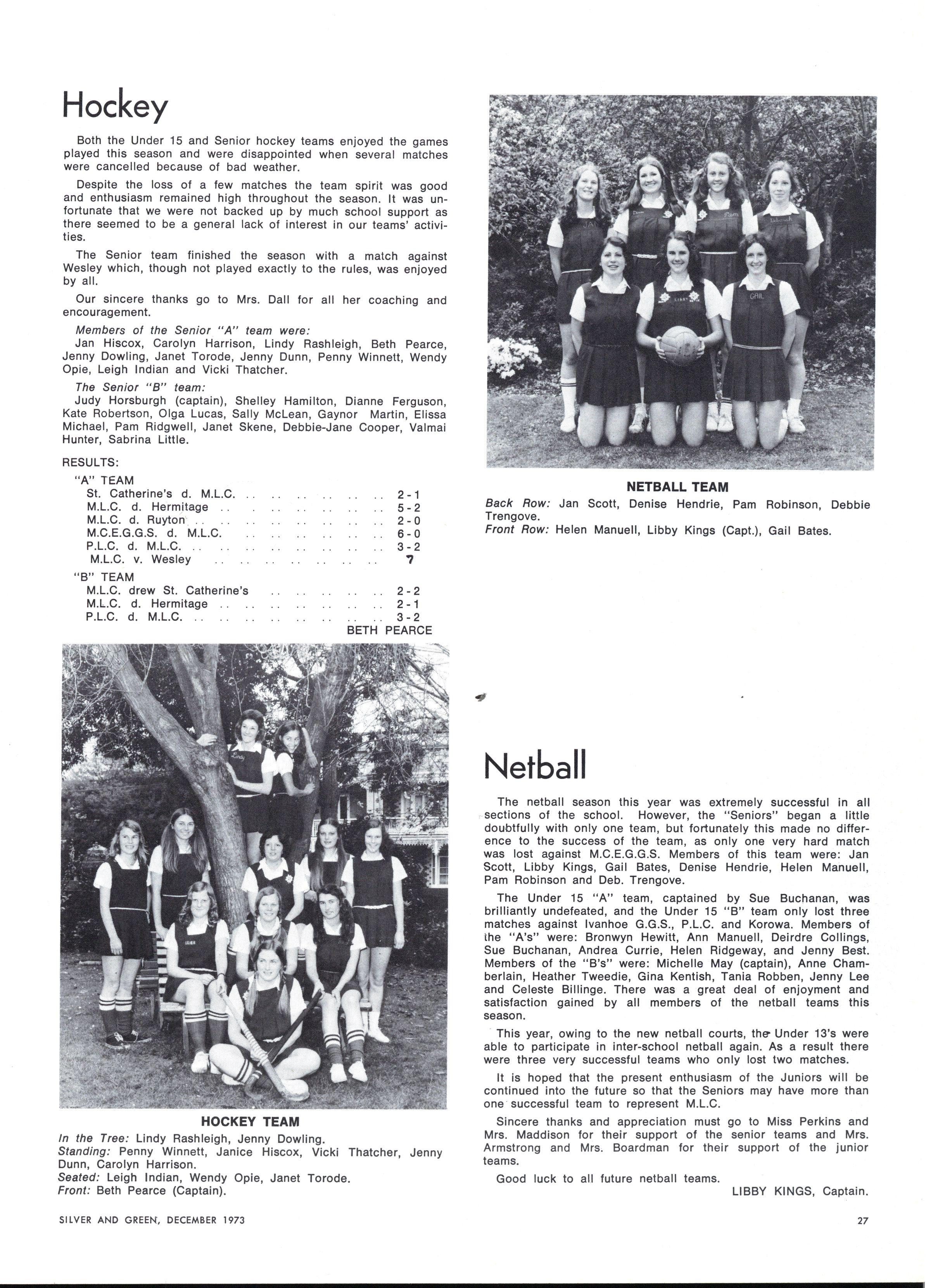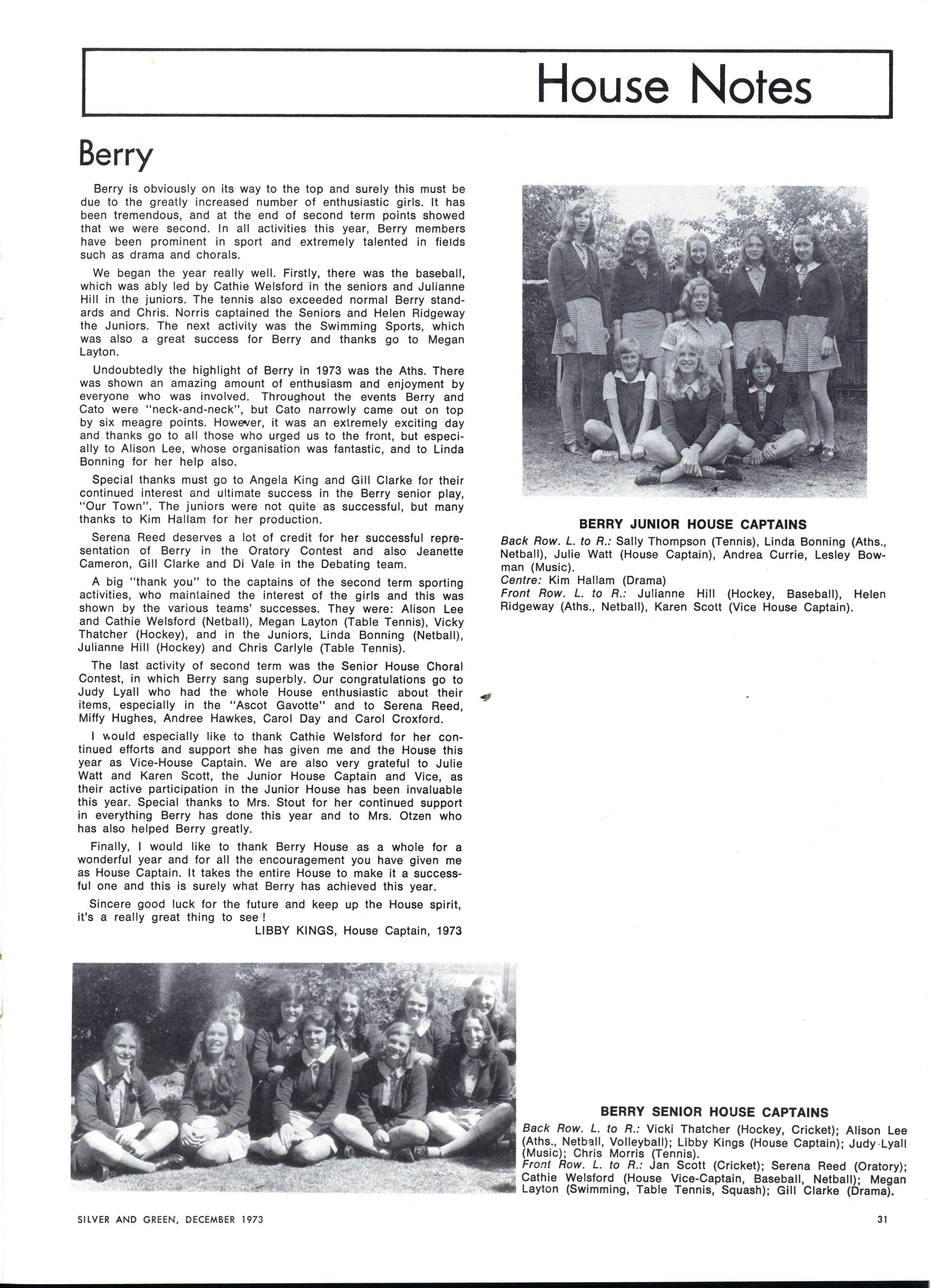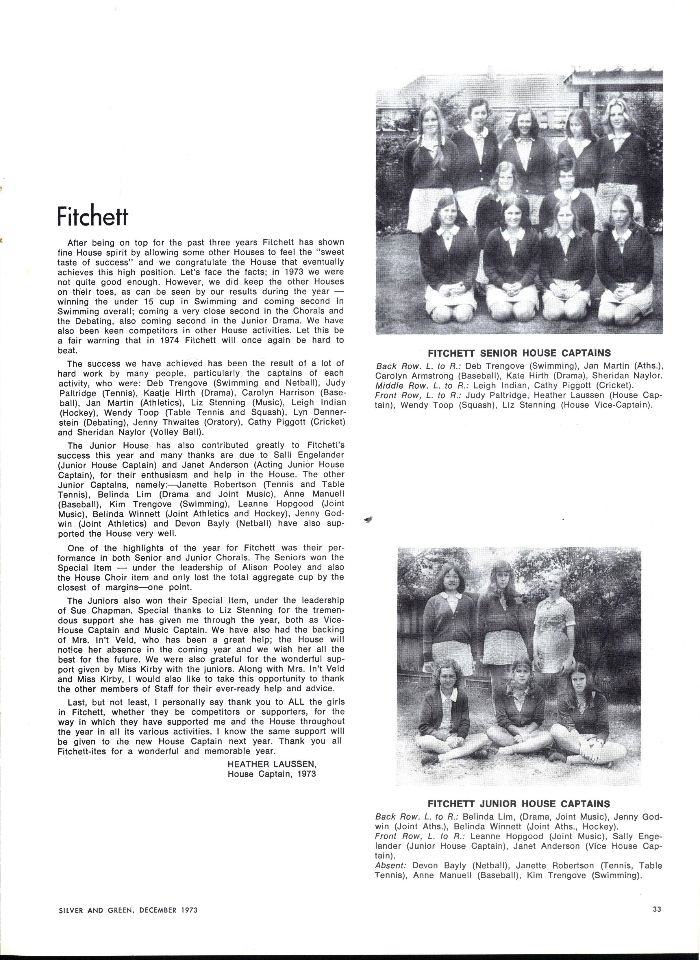 Honours: Linnell Barelli, Elizabeth Bennett, Janet Briggs, Jennifer Bradshaw, Jean Christie, Susa n Coleman, Elizabeth Doxey, Janet Fletcher, Caroline Fry, Lynda Hall, Rosemary Harriss , Robyn Keller Wendy Lambourne Susa n Lyons Elizabeth Nevile Deborah Parr Janet Pinnell Elizabeth Segal Paula Troup Jan Yeoman Jennie Kerr