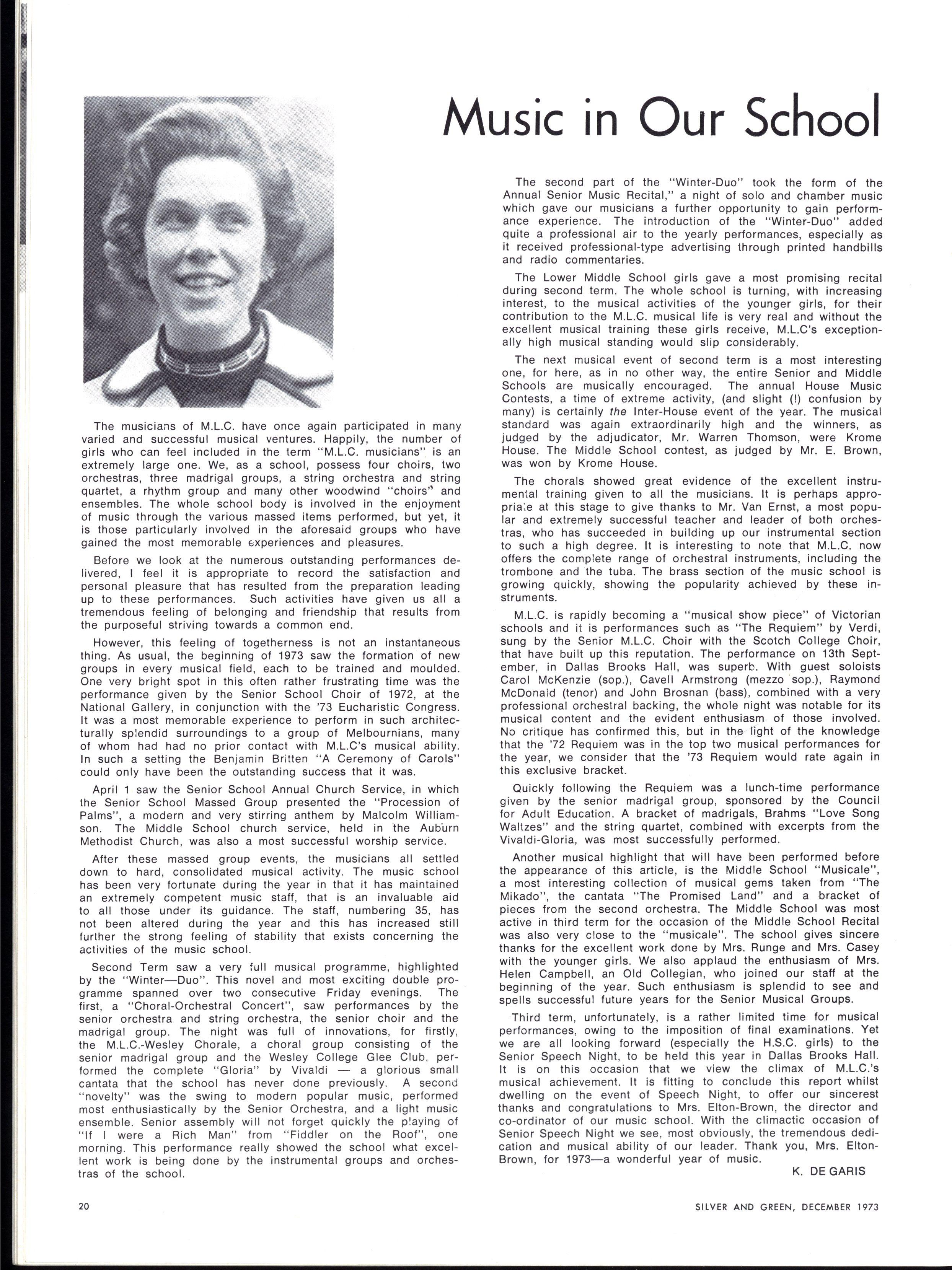 During her long association with the school, Miss Kerr has been a student as well as a member of Staff and after Miss Sutton's appointment as Principal of Church of England Girls' Grammar School, M.L.C was fortunate that through her loyalty and willingness to serve the school, Miss Kerr took over the most unenviable task of being Acting Vice-Principal along with her previous role as Chief-of-Staff and co-ordinator of English At the same time she has continued her unobtrusive yet active support of all school activities such as the music festival, drama and sport.