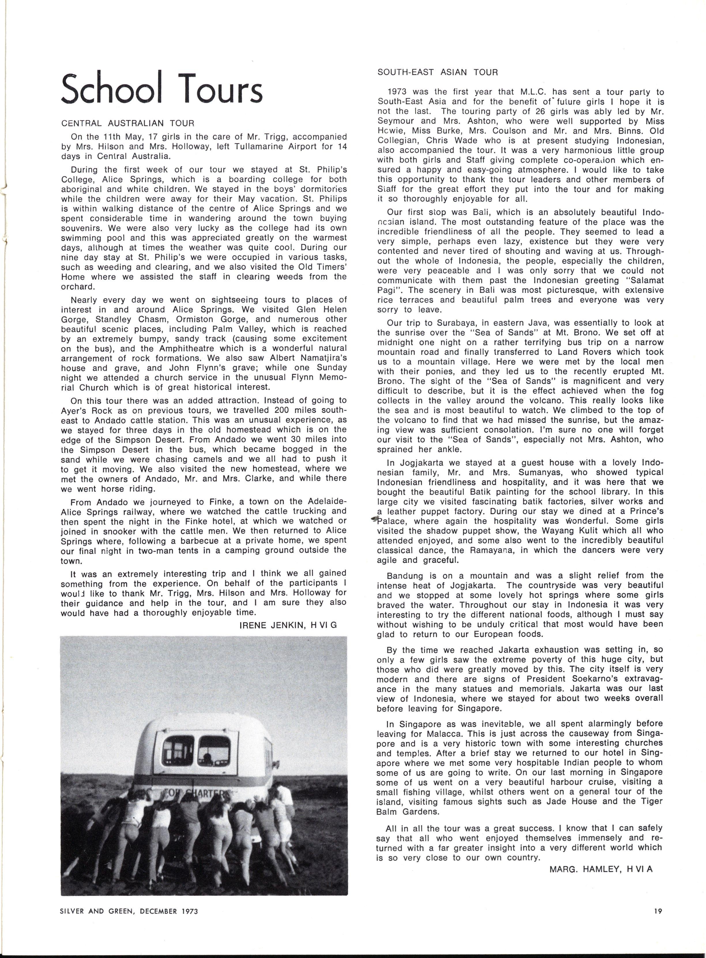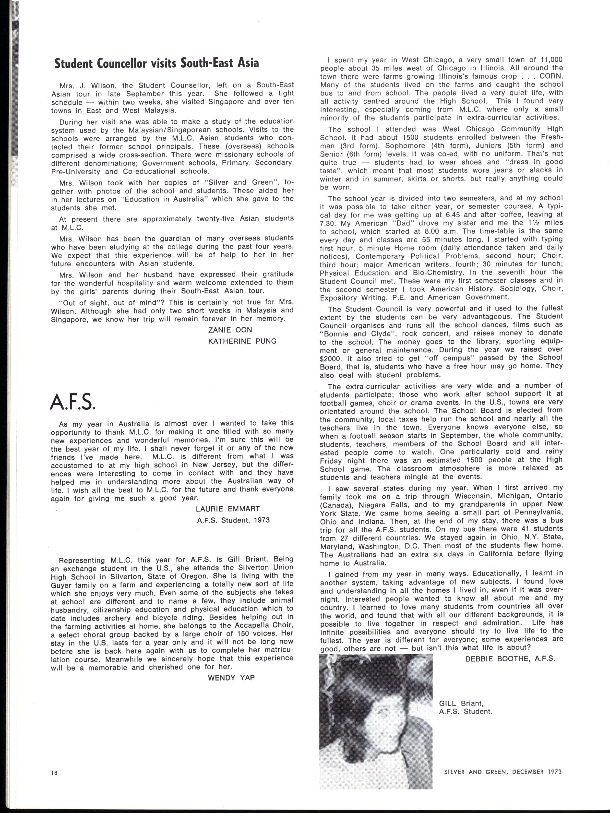 At the end of Term II our College Chaplain, the Rev Wesley Trigg, B.A., B.D., with Mrs Trigg and their daughters, Stephanie and Fiona, left for England on Long Service Leave Mr Trigg intends to stay overseas during 1974 to undertake further studies in Religious Education We wish this M.L.C family every success during their time overseas and we are glad to hear that their eldest daughter, Jocelyn, will join them at the end of the year