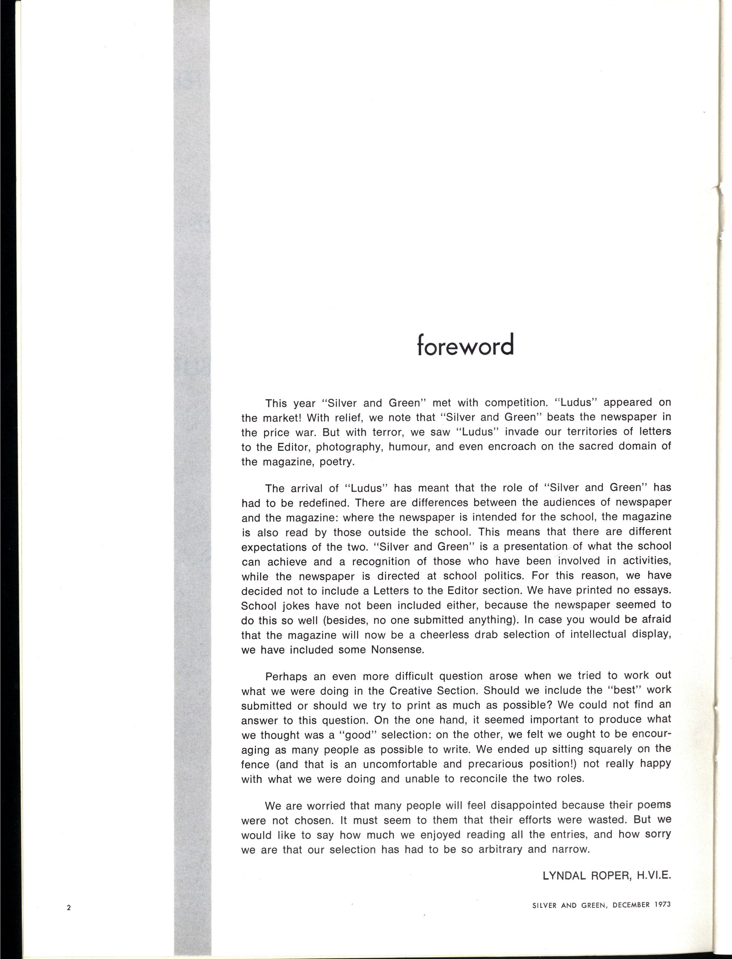 The arrival of "Ludus" has meant that the role of "Silver and Green" has had to be redefined There are differences between the audiences of newspaper and the magazine: where the newspaper is intended for the school, the magazine is also read by those outside the school This means that there are different expectations of the two "Silver and Green" is a presentation of what the school can achieve and a recognition of those who have been involved in activities, while the newspaper is directed at school politics For this reason, we have decided not to include a Letters to the Editor section We have printed no essays School jokes have not been included either, because the newspaper seemed to do this so well (besides, no one submitted anything) In case you would be afraid that the magazine will now be a cheerless drab selection of intellectual display, we have included some Nonsense