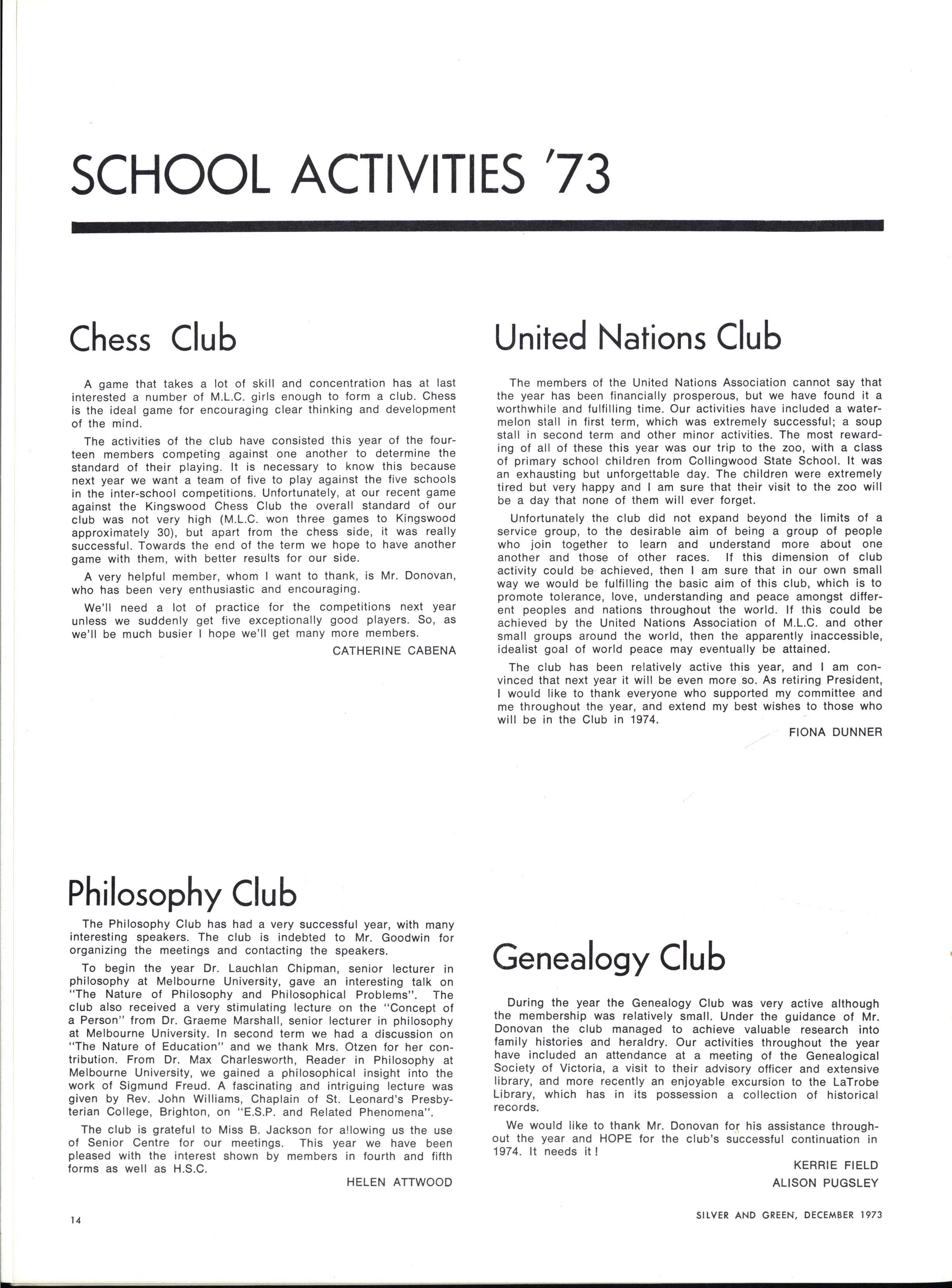 The activities of the club have consisted this year of the fourteen members competing against one another to determine the standard of their playing It is necessary to know this because next year we want a team of five to play against the five schools in the inter-school competitions Unfortunately at our recent game against the Kingswood Chess Club the overall standard of our club was not very high (M.L.C won three games to Kingswood approximately 30), but apart from the chess side, it was really successful Towards the end of the term we hope to have another game with them, with better results for our side