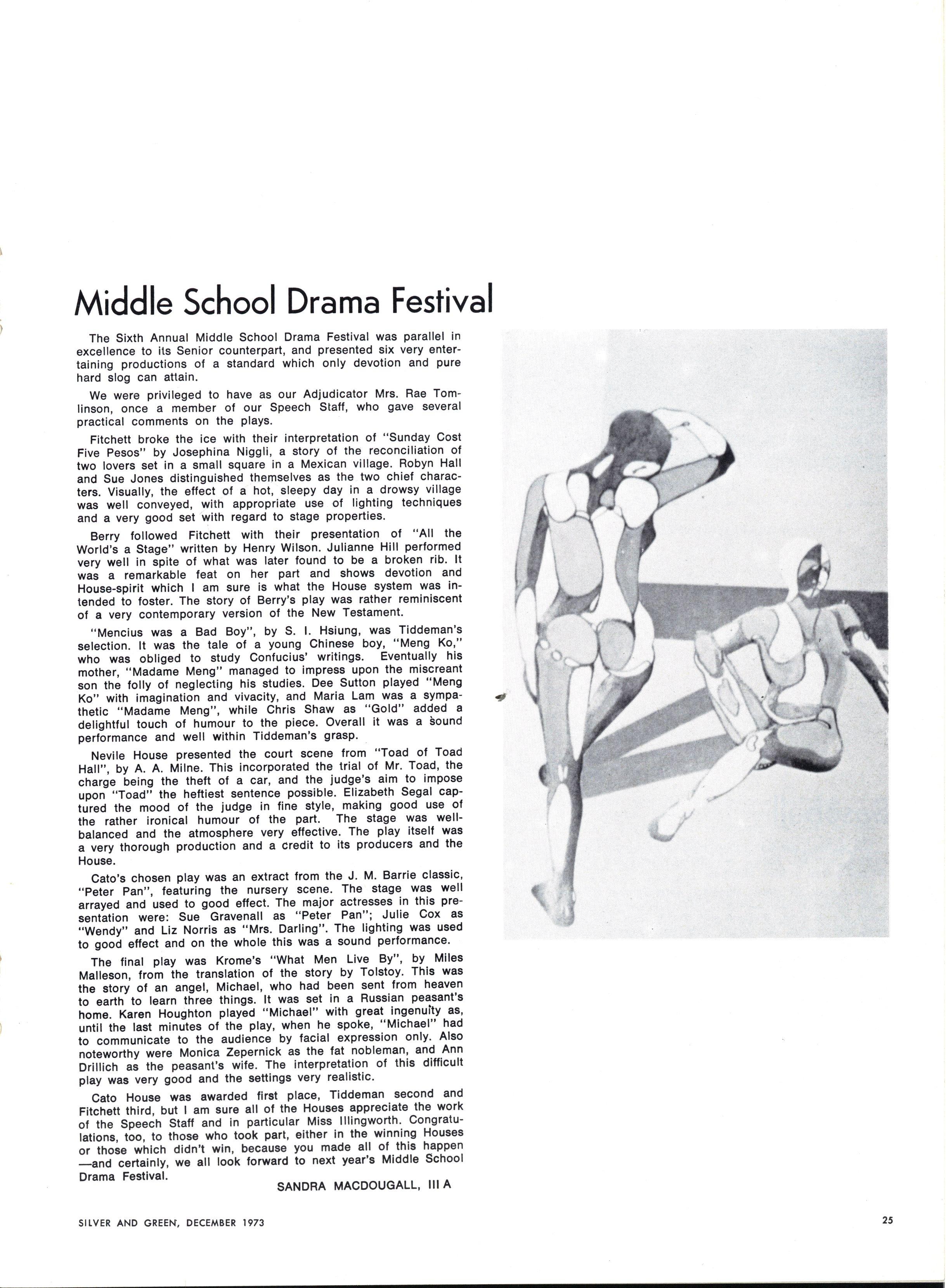 But perhaps more important than any of these abilities was her interest in her students They always felt that she had time for them She was mild, too, to those who disobeyed school rules. As one firstformer put it: "She didn't tick you off" She had the ability to make people feel they were important to her.