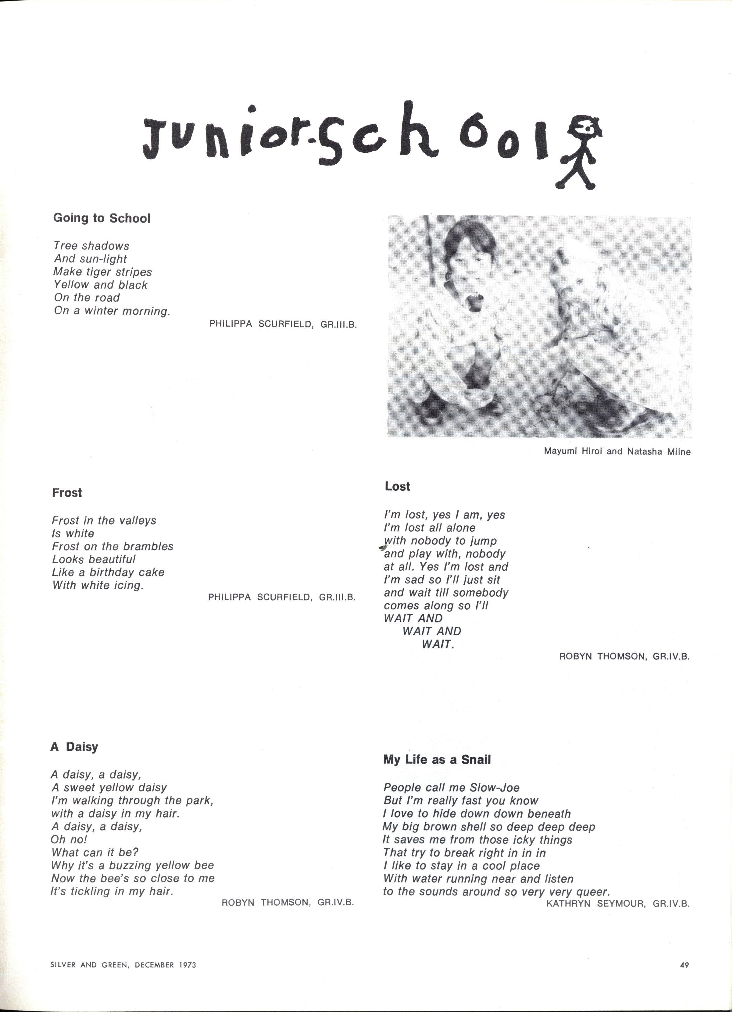 However, our attempts to lessen the isolation which so often exists between different levels of a school as large as M.L.C have been more successful A number of the Prefects have adopted forms in Middle and Lower Middle school in addition to their senior forms Although this involves only one roll-call each week, it has been instrumental in developing friendships and, speaking personally, a very enjoyable experience Kathy and I also achieved this result in a memorable visit to Junior School when we participated in two assemblies