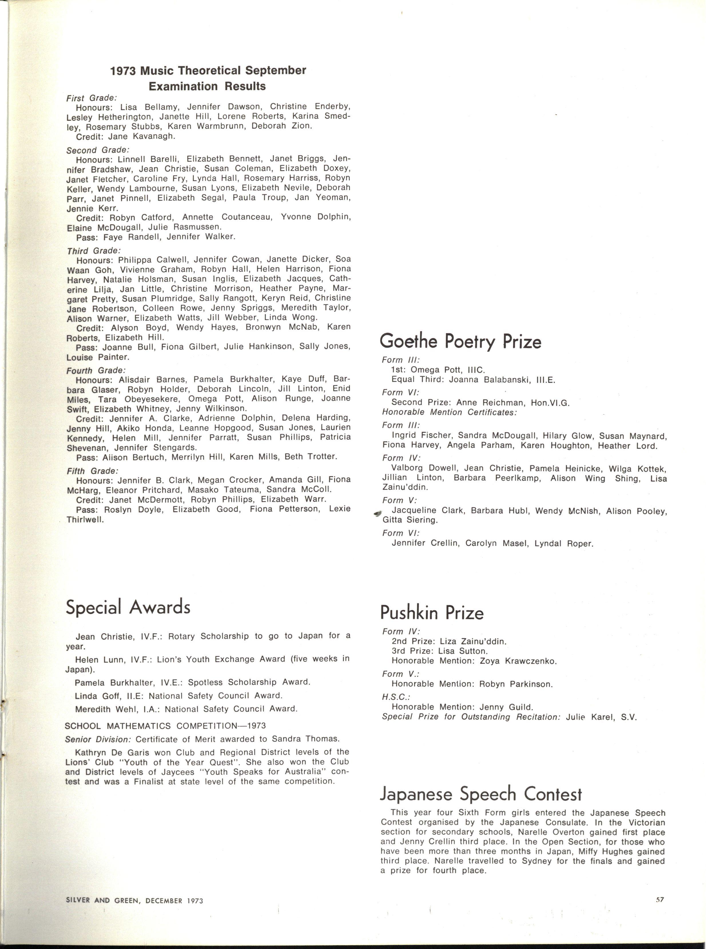 Thi s year four Sixt h Form girl s entered the Japanese Speech Contest organised by the Japanese Consulate In the Victorian section for secondary schools, Narelle Overton gained first place and Jenny Crellin third place In the Open Section, for those who have been more than three months in Japan, Miffy Hughes gained third place Narelle travelled to Sydney for the finals and gained a prize for fourth place