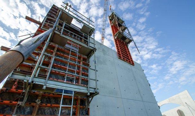 Beim Umsetzen der Schalelemente wird die „Gerüst-Schalungs-Kombi“ einfach im Ganzen per Kran versetzt. „Die Arbeitsbühnen lassen sich mit wenigen Handgriffen an den Schalelementen befestigen. Einmal erledigt, erspart uns das während des Betonierens das Ab- und Anmontieren. So können wir mit Hilfe der Multip noch schneller einund ausschalen“, bestätigt Jungmichel. ra