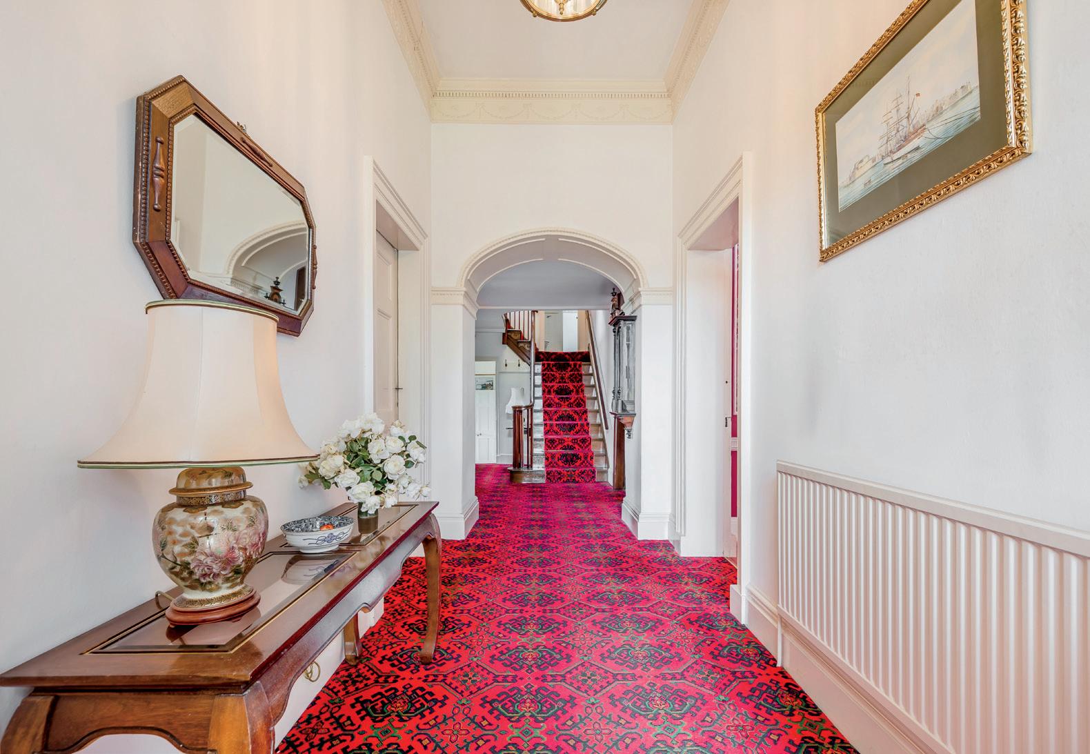 Step through the entrance porch and into the spacious entrance hall, which immediately sets the tone with its period doors, soaring ceilings, and grand staircase ahead. The previous owners enjoyed a multi-generational living arrangement, comfortably occupying separate halves of the house, which accounts for the unique feature of having two kitchens and separate services. The layout is wellsuited for multi-generational living, should that be desired.