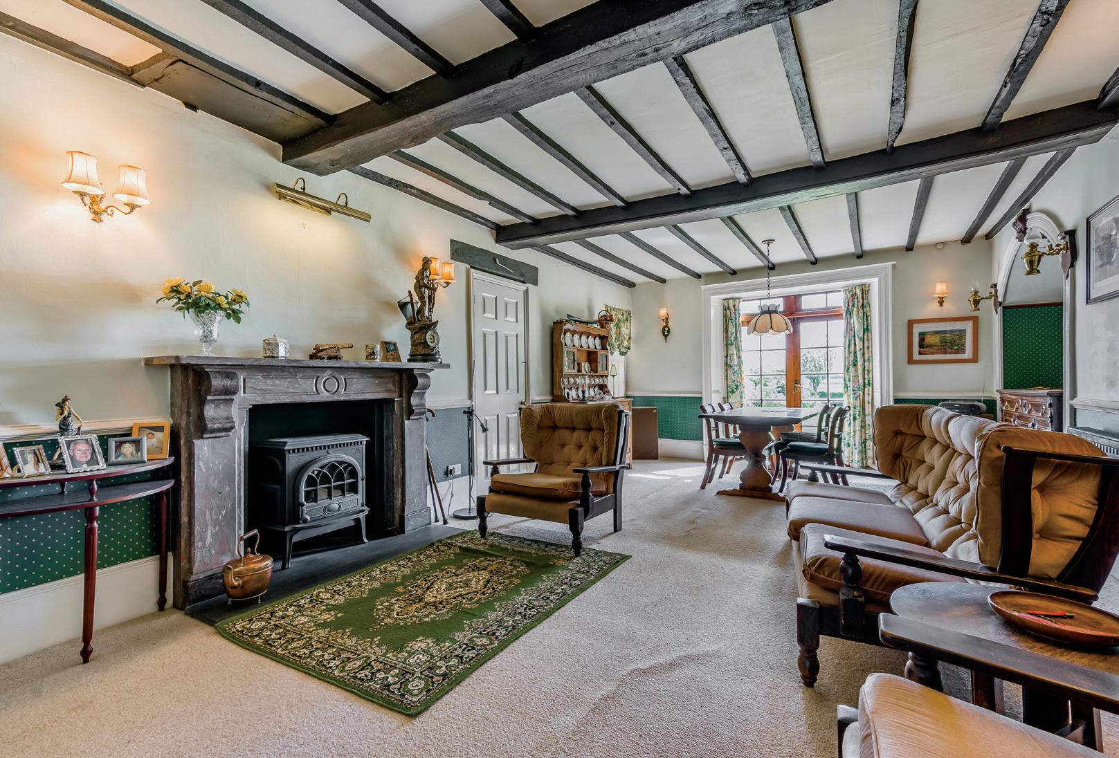 At the rear of the property are two additional reception rooms, including a formal dining room with a recessed crockery display case and a glass wall that separates it from the entrance hall—a striking feature. The main lounge also boasts character, with ceiling beams, a beautiful inset feature archway, and French doors opening out to the garden.