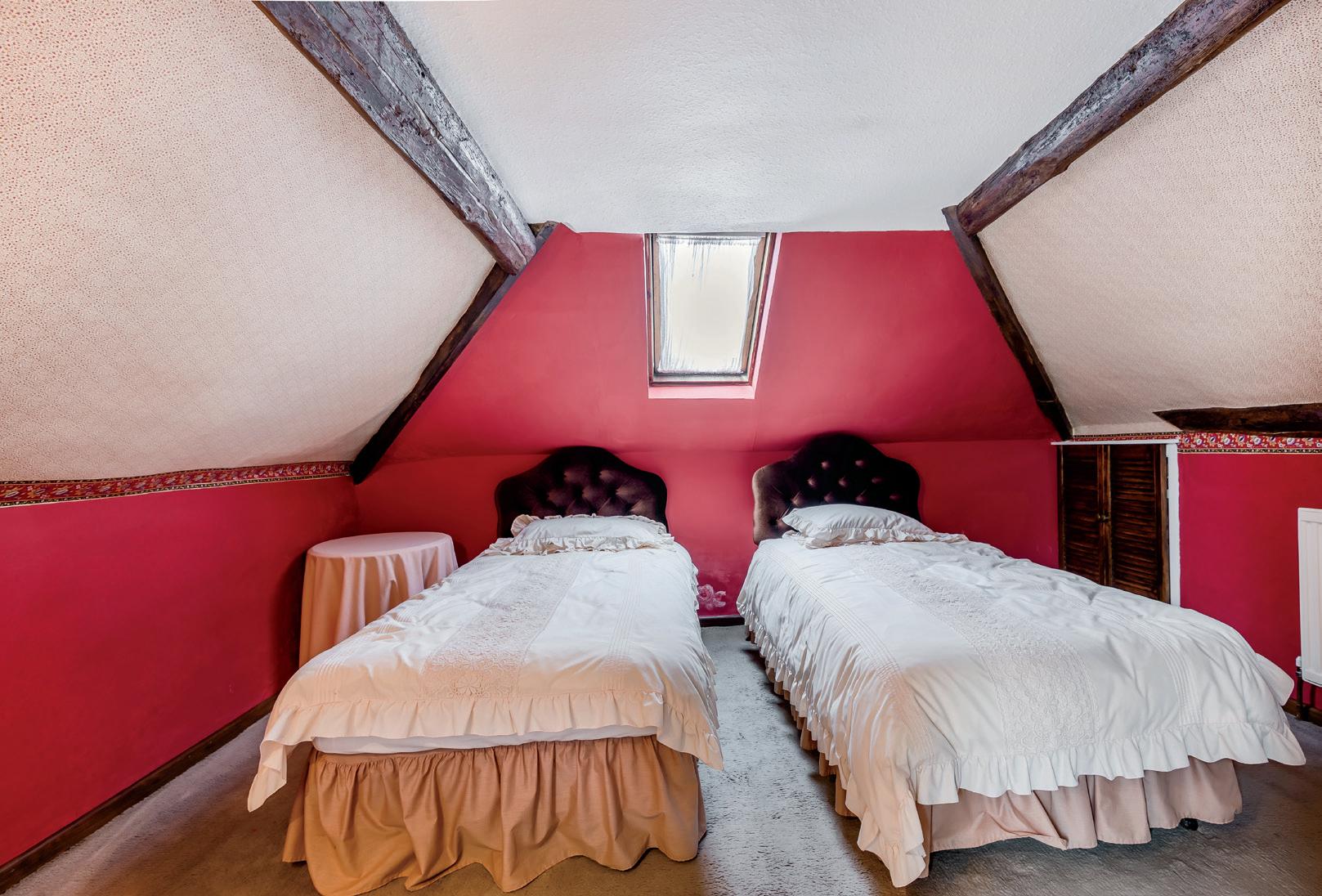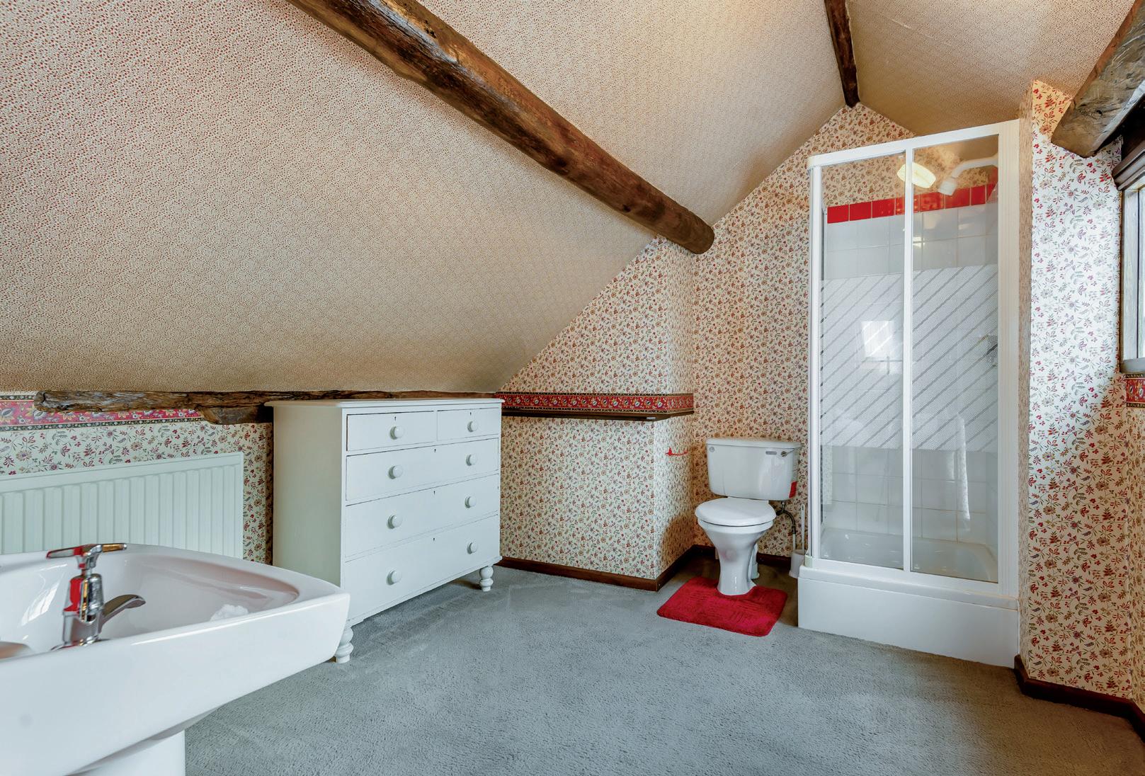 The staircase continues upwards to three further bedrooms and a Jack-and-Jill shower room. The second floor reveals more of the property’s history as a school, with visible markings where the children once etched their names into the staircase banister.