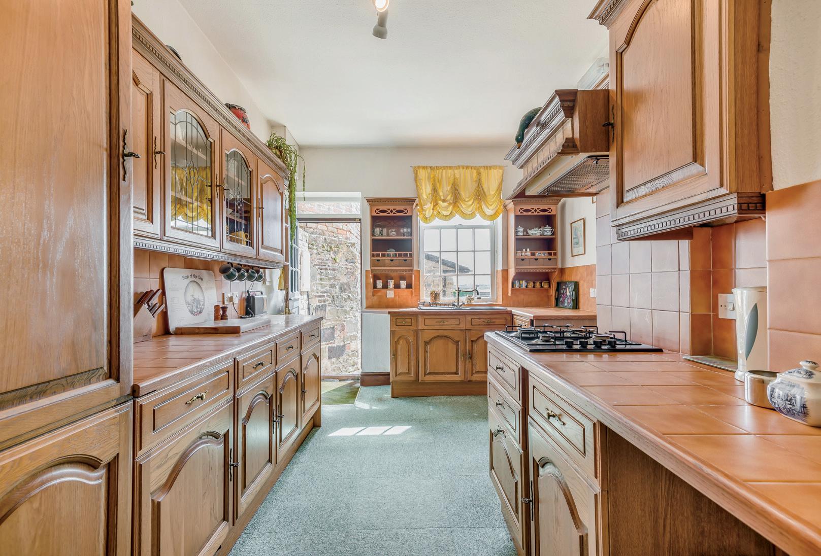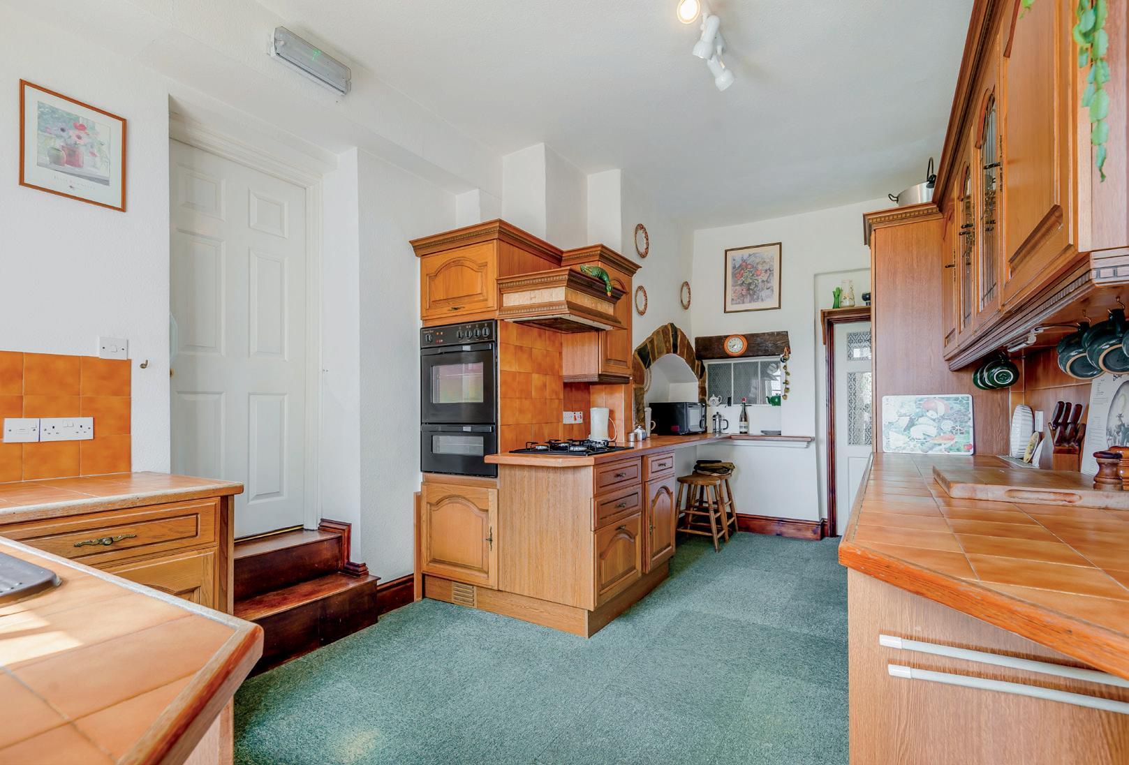 Step down into the first of two kitchens, which features wooden units, integrated appliances, and a door leading to the garden. There’s also a rear door that opens into an inner hallway, providing access to a cloakroom, storage, and a door leading to the cellar. Another door leads into the second kitchen, which also includes wooden units and connects back to the entrance hall.