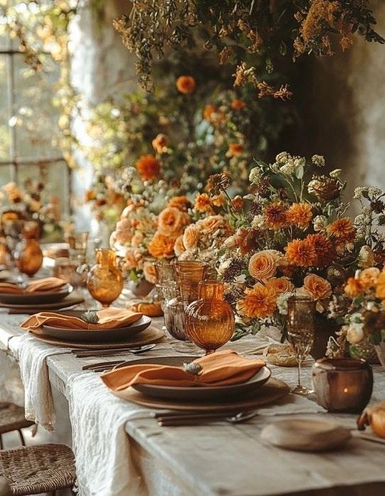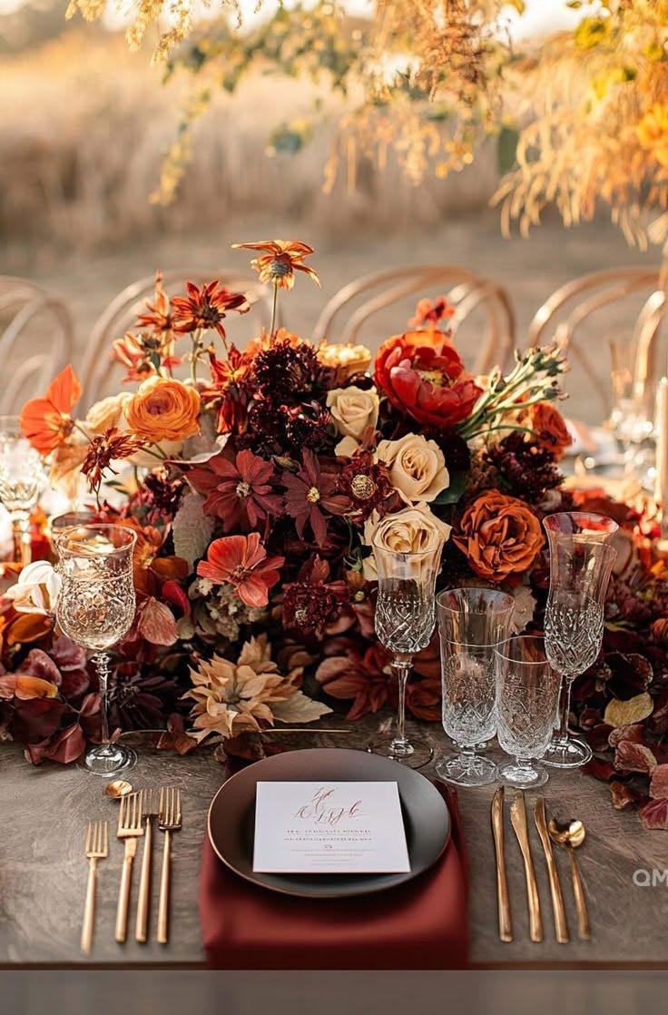 This look captures the essence of fall through a vibrant tapestry of seasonal colors; burnt orange, golden yellow, deep burgundy , rustic browns, and forest greens. This theme evokes the warmth of harvest time, the coziness of crisp evenings, and the joy of gathering together.
