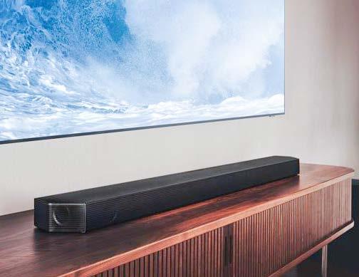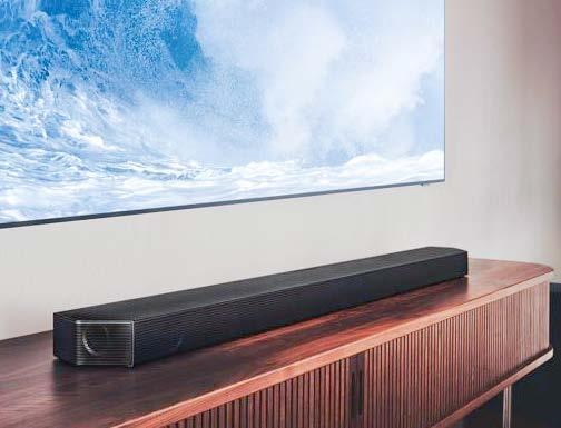 Soundbar with Wireless Dolby Atmos is the latest offering in their line of premium sound experiences. The Q990B effortless ly integrates with Samsung’s TVs to provide an immersive sound experience across a variety of content including TV, music, and gaming. The Q990B is equipped with premium features, in Dolby Atmos, true 11.1.4ch sound, Auto EQ, smart integration and more. For the first time, this soundbar wirelessly incorpo rates Dolby Atmos, allowing for a smooth, cable-free setup with Samsung’s 2022 TVs. The soundbar syncs with Samsung TVs to create immersive 360-sound, combining and enhancing sound through the soundbar’s front, side, and up-firing speakers as well as the TV’s speakers. The result is a new level of acoustic immersion to experience like never before. The setup process is quick and easy thanks to Wi-Fi and Bluetooth connec tivity and the soundbar supports lossless 3D surround sound thanks to HDMI eARC. With 11 front and surround channels, 1 subwoof