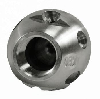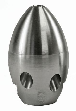 ▲ THE TOILET TAMER NOZZLE from KEG Technologies is designed specifically to dramatically reduce the amount of airflow being pulled through the pipe. The precisely engineered water jet angles are incorporated into the nozzle. It virtually eliminates the amount of pressurized air present as the operator passes by a home’s service line and prevents any sewer material from being blown up and out of residential toilets. It is tapered like a football on both ends; the streamlined design eliminates “hang-ups” and ensures smooth passage through even misaligned or separated pipe.