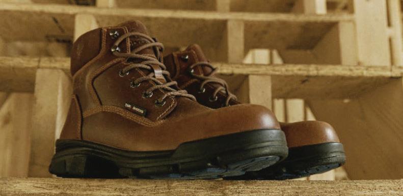 ▲ THE DURASHOCK SR ICON BOOT brings athletic tech to the job site, helping reduce fatigue during long hours on your feet. The boot features shock absorbing ompression pads in the heel and forefoot to minimize impact. A cradle-like heel offers a steady base on uneven ground. The CarbonMax composite toe protects on the job site without the weight of steel.