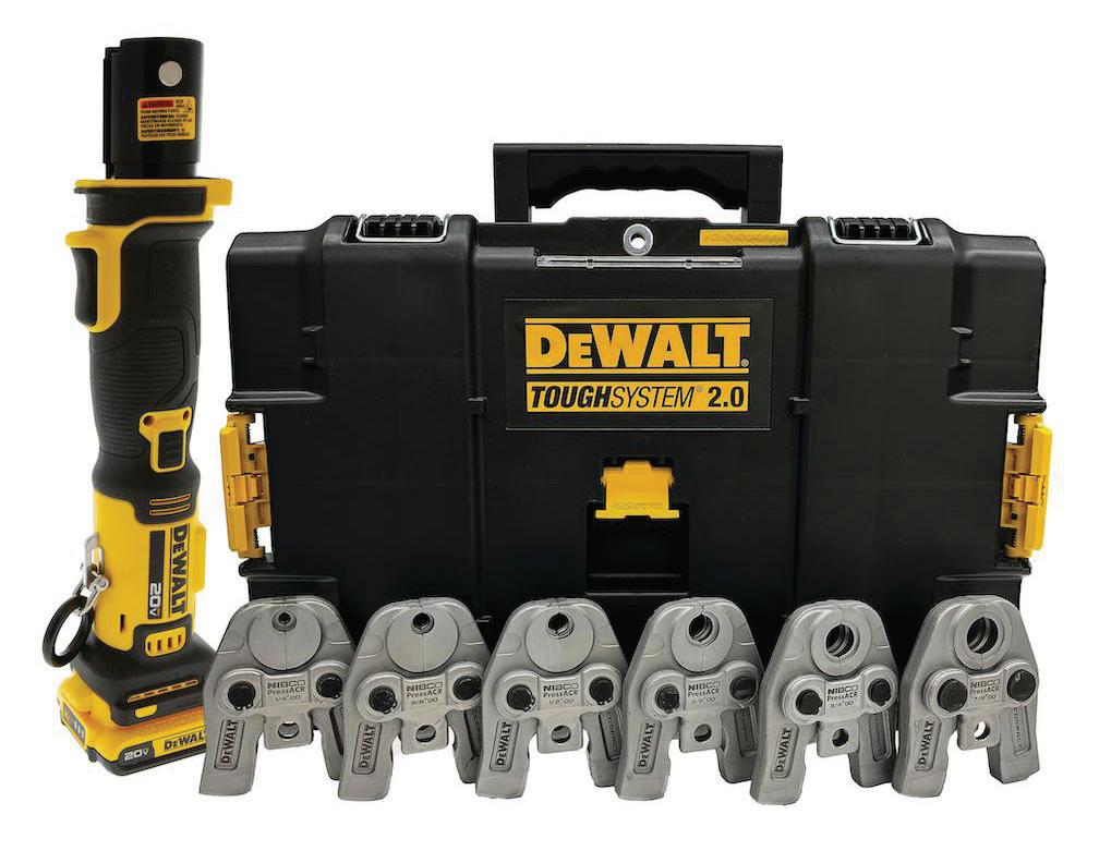 ▲ THE 24KN TOOL AND JAW KIT produced in parnership with DeWalt is designed to crimp NIBCO PressACR fittings. The tool has been optimized for one-handed use and the jaws have a gray galvanized coating to provide corrosion protection. The tool kit includes the press tool (DCE210D2), with USB-C cable, shoulder strap, charger and two 20V MAX® DCB203 2.0 Ah batteries. The PressACR jaw kit (DCE214K) includes one each of the following jaws sizes: ¼", 3/8", ½", 5/8", ¾" and 7/8". PressACR end connections reduce installation time while the patented interior groove design and HNBR seal make them suitable for high pressure HVACR applications rated up to 700 psi. NIBCO