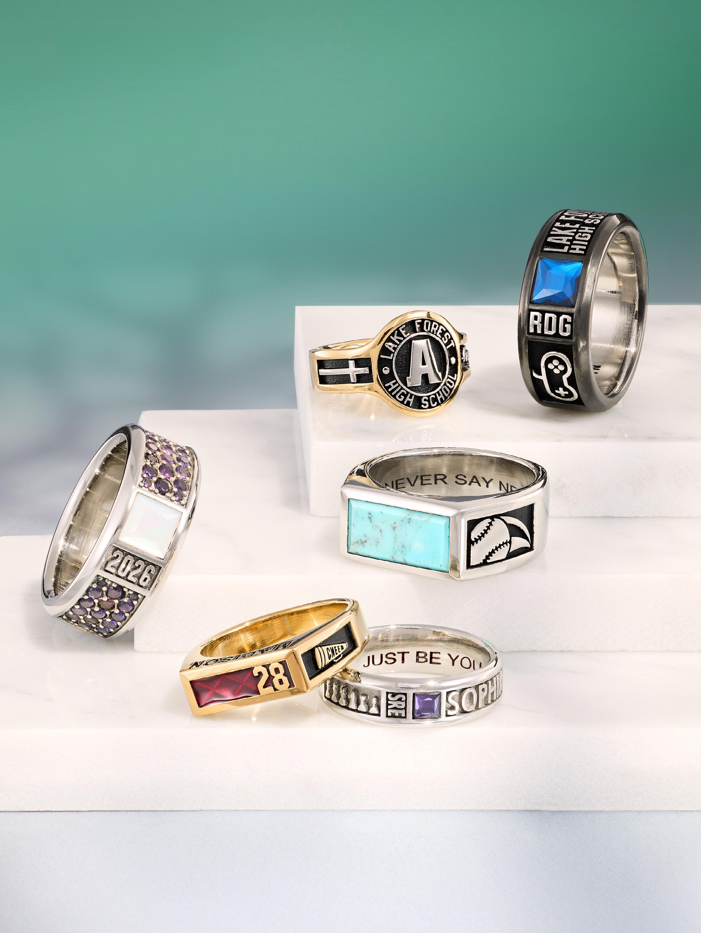 These distinctive styles have the iconic look of a traditional class ring with just a few less customization options — for those who prefer to speed up the tempo of the design process.