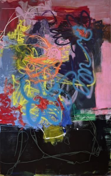 The act of creating is what Goering focuses her practice around. The physical creation process overrides any sort of narrative in the painting, thus providing the viewer strong and vivid mark-making through physical movement and impulse energy. This painting represents pure Automatism. No association is given to or by the author, and any association is inferred by the audience.