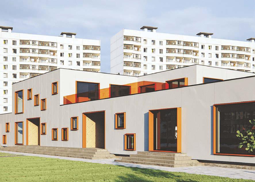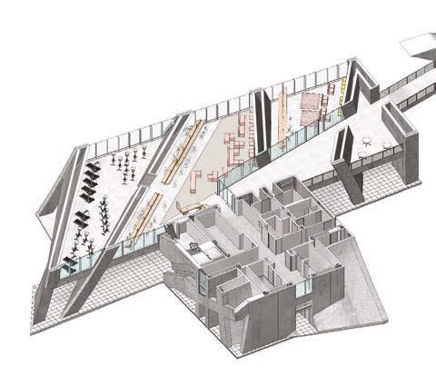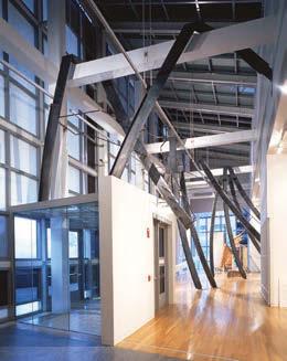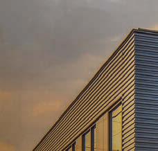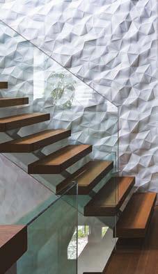 An external staircase climbs the building’s east elevation. Covered in cement plaster, this angular feature contrasts with the curvilinear nature of the building’s steel bands and abundant use of energyefficient glazing.