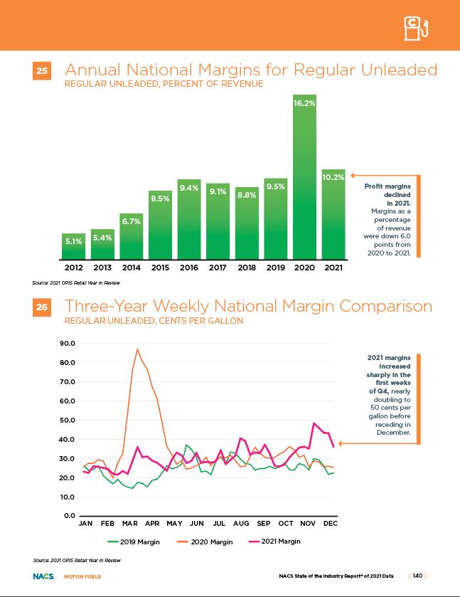Cigarettes accounted for 10.38% of in-store gross margin in 2021, ranking third in terms of gross margin contribu tion behind prepared food and packaged beverages, according to the NACS State of the Industry Report of 2021 Data. Margins decreased year over year 0.86 point from 14.40% in 2020 to 13.54% in 2021, while gross profit declined 4.8% year over year.