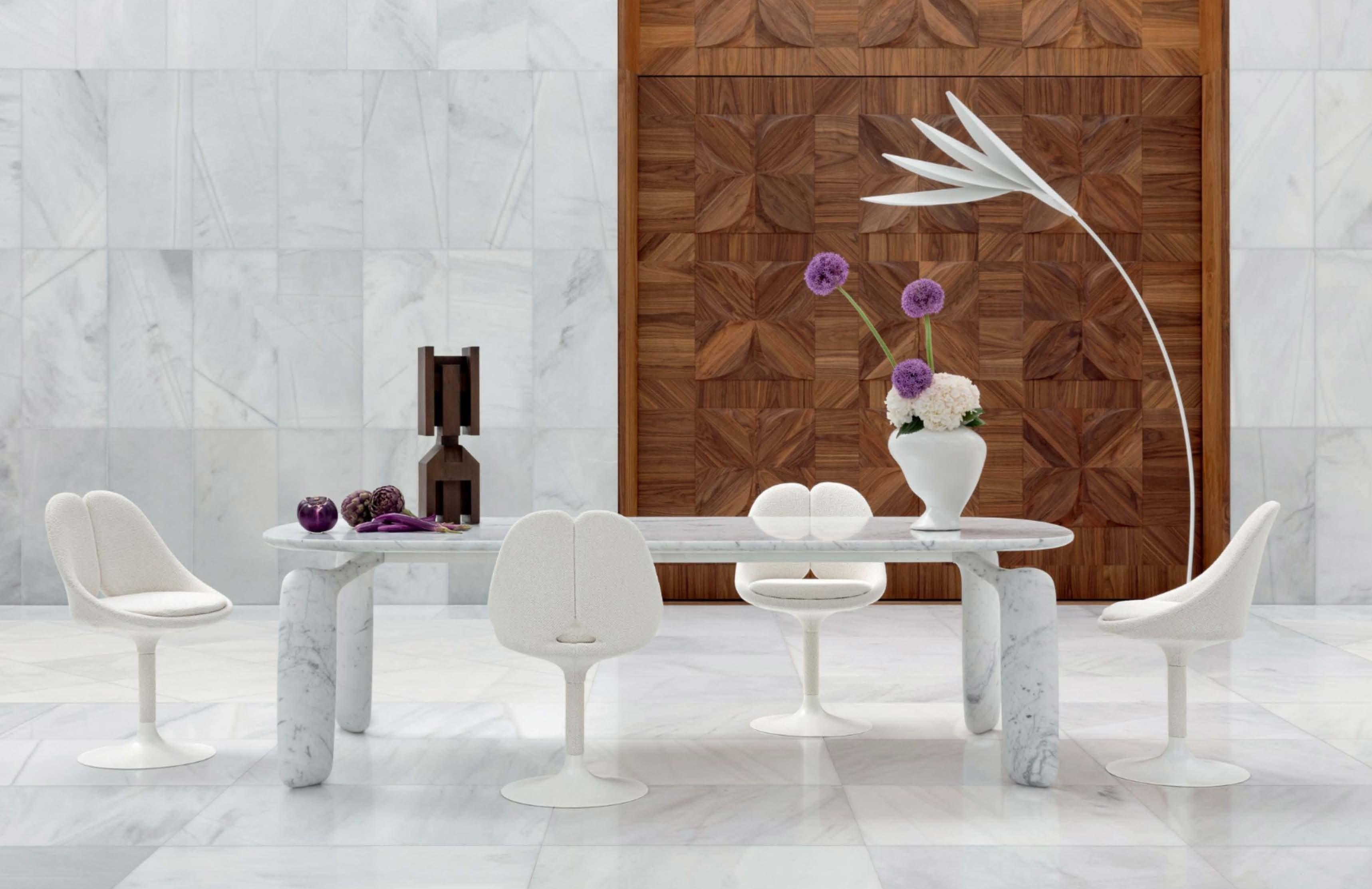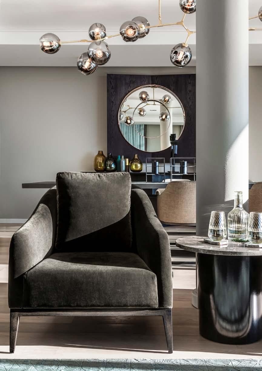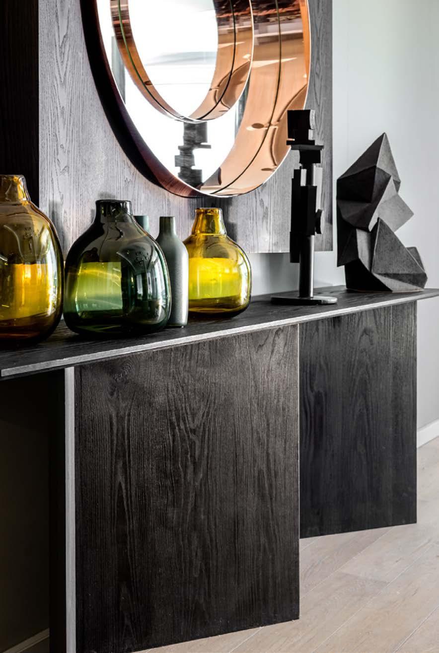Los tableros de mesa de mármol Dream Emperor y Absolute Black Granite se combinan con bases de acero en al lado, mesitas de café y balcón. La mesa de comedor, los taburetes y el servidor están tallados en madera de fresno cepillada con alambre teñido de carbono, que también se utiliza en el marco del espejo “Port” de la firma OKHA, que, con su espejo empotrado con marco de cobre, tiene un tono náutico de las ventanas circulares de un barco.