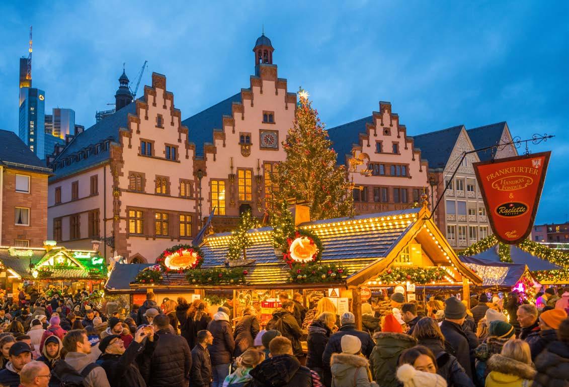 En invierno, las plazas de Frankfurt se transforman en pintorescos mercadillos navideños, que atraen a visitantes de todas partes con un ambiente festivo y los nostálgicos olores y sonidos de la época navideña.