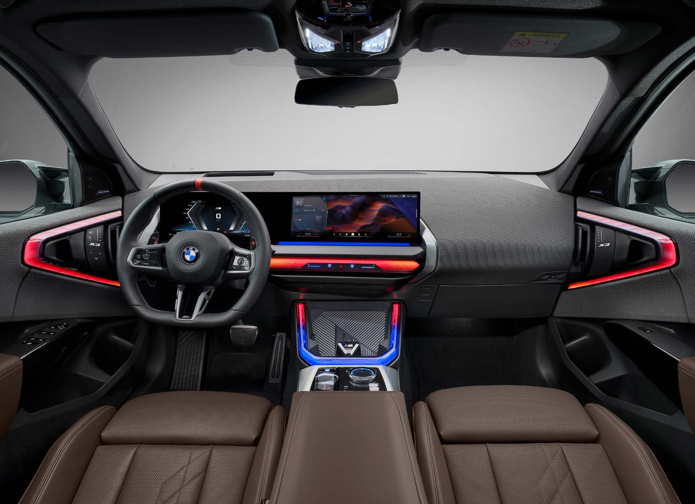 Las luces interiores LED, atractivas, hacen eco de los temas de estilo y diseño del exterior, con iluminación escondida bajo el plástico tintado, que BMW apoda interaction bar que se extiende a través del panel instrumental hasta las puertas, detrás del binaculo central y hasta la consola central. Dependiendo de My Mode, o modo de conducción, las luces pulsean y se mueven de acuerdo al input o comando que ubico y otras variables, mostrando una variedad de colores correspondientes y combinaciones multicolor. Ademas las pantallas digitales de la instrumentación de 12.3” en siamés con la de 14.9” se ve fabulosa y trabajan perfecto. El sistema permite y conlleva a opciones de la nube como navegación que se actualiza constantemente para evitar tráfico o trabajos en tu ruta y permite encontrar todo de forma fácil con efectividad e intuición con los segmentos deslizables. El estándar de la calidad del interior y diseño es uno de los puntos más impresionantes del nuevo X3 y la luz ambiental agrega mas sentido de calidad e innovación a través de la cabina con materiales muy placenteros por doquier. No me gustaron las palancas interiores de las puertas hechas de plástico duro….Sorprendente el diseño de la tobera corrida del sistema de enfriamiento,es básicamente imperceptible al ojo.