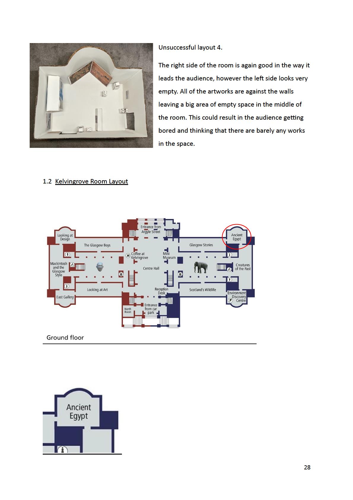 Curatorial Decisions Pg 20 CHAPTER THREE: CURATORIAL AIMS Pg 23 • Venue Pg 23 • Intended Audience Pg 24 CHAPTER FOUR: OTHER CURATORIAL ISSUES Pg 25 • Curation Influences Pg 25 CONCLUSION Pg 26 APPENDICES Pg 27 • 1.1 Unsuccessful Layouts Pg 27 • 1.2 Kelvingrove Room Layout Pg 28 REFERENCES Pg 29