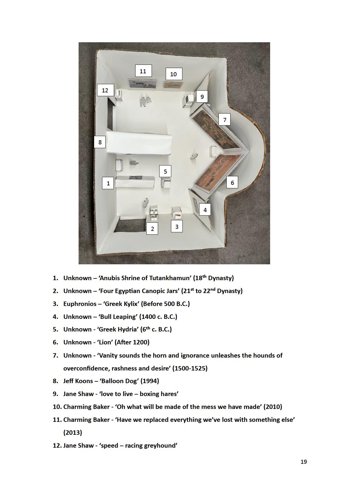 There will be 10 different artworks in my exhibition, ranging from sculpture and ceramics to paintings. The artworks that will be focused on will be from the Ancient Egyptian and Greek periods to Medieval times and finally the modern-day contemporary works.