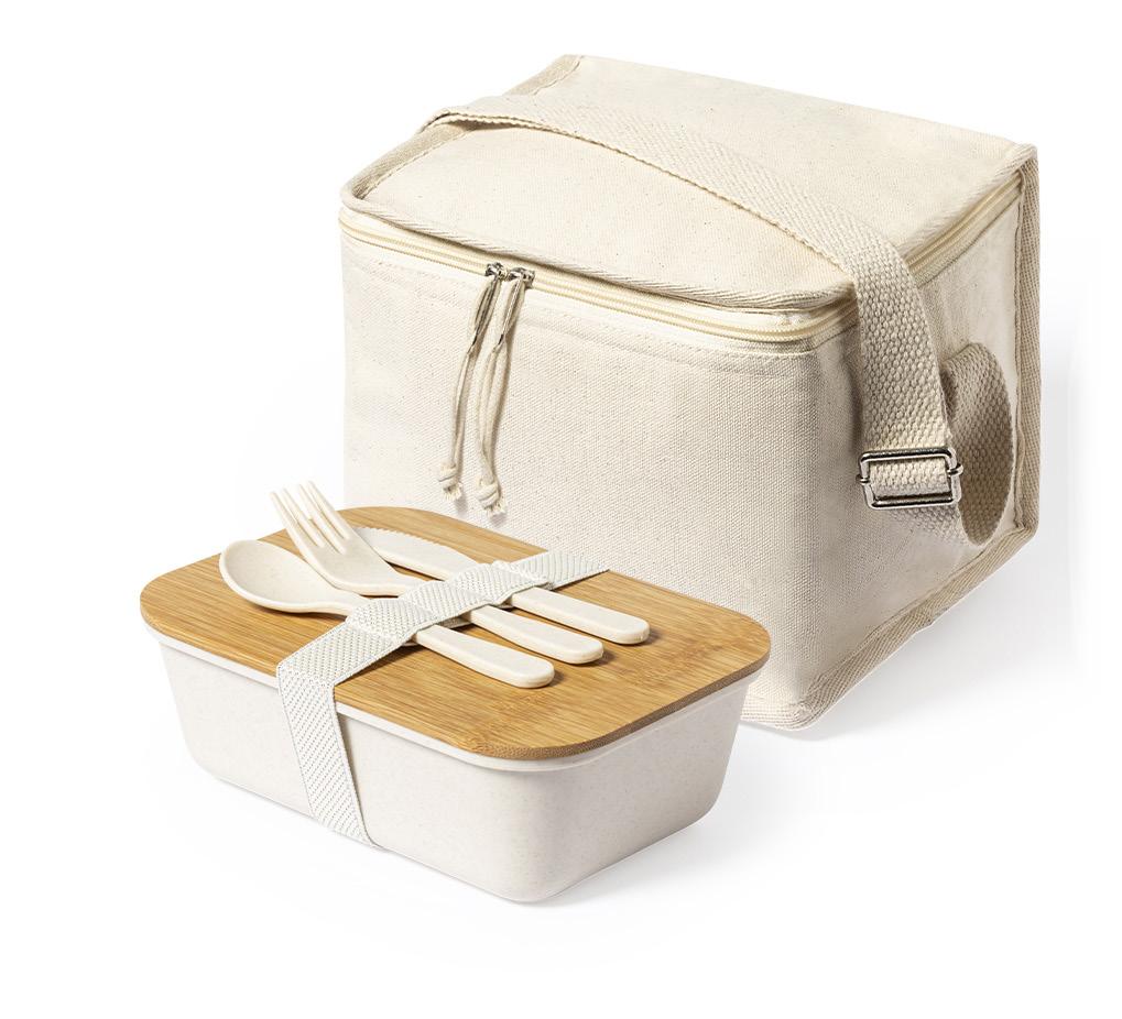 Set of nature line lunch box and cooler with Food Grade Certification, ensuring safety when food comes in contact with the material used to manufacture the product. Including: Cooler made of cotton material, with isothermal inside finished in aluminum. Zipper closure with double string puller and matching carrying handle.
