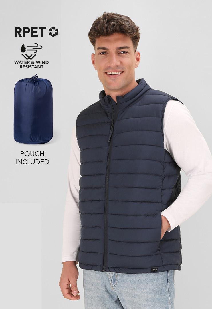 Unisex vest in warm and soft material 100% polyester RPET, made from recycled plastic to encourage the reuse of plastic waste and contribute to the sustainability of the planet. In extra light feather effect material, waterproof and windproof, with interior padding.