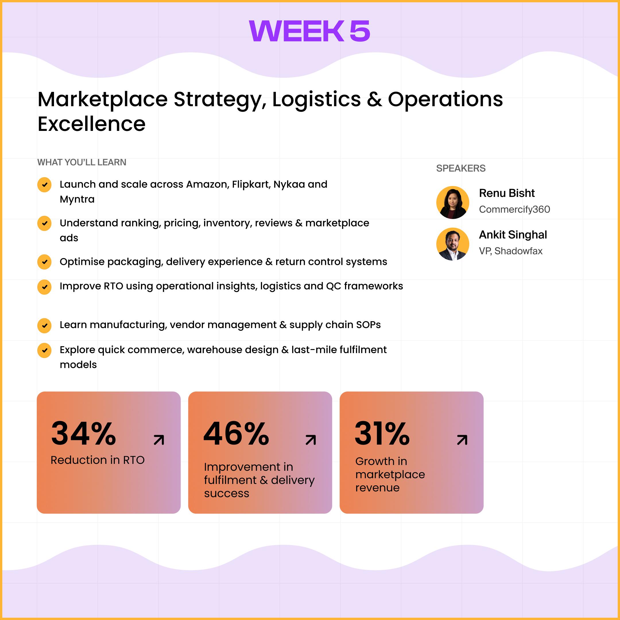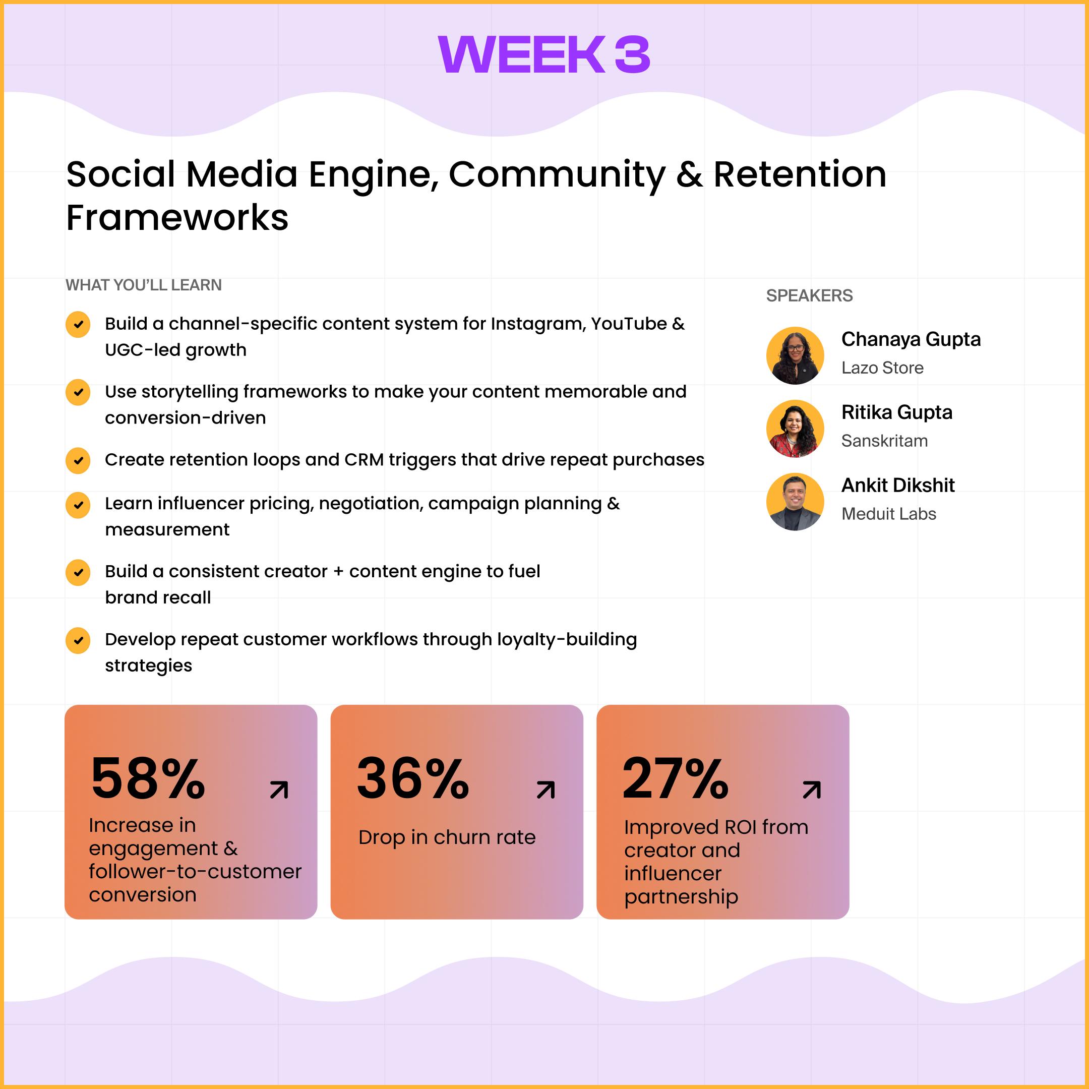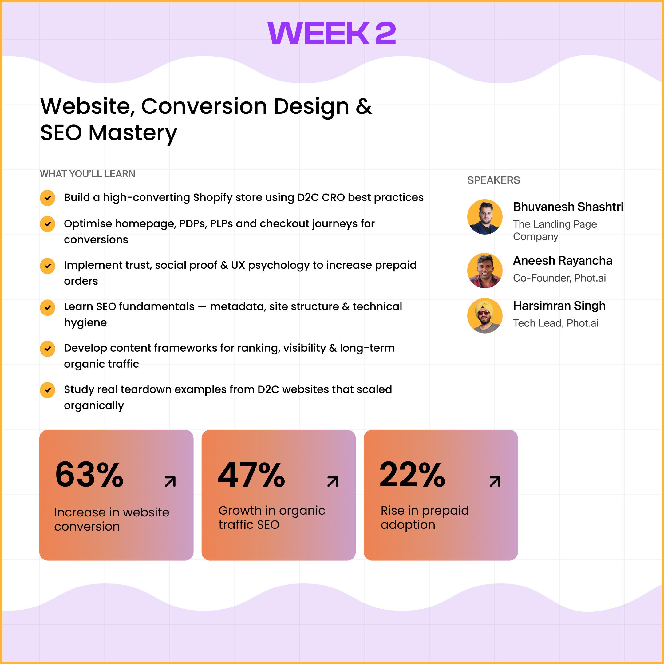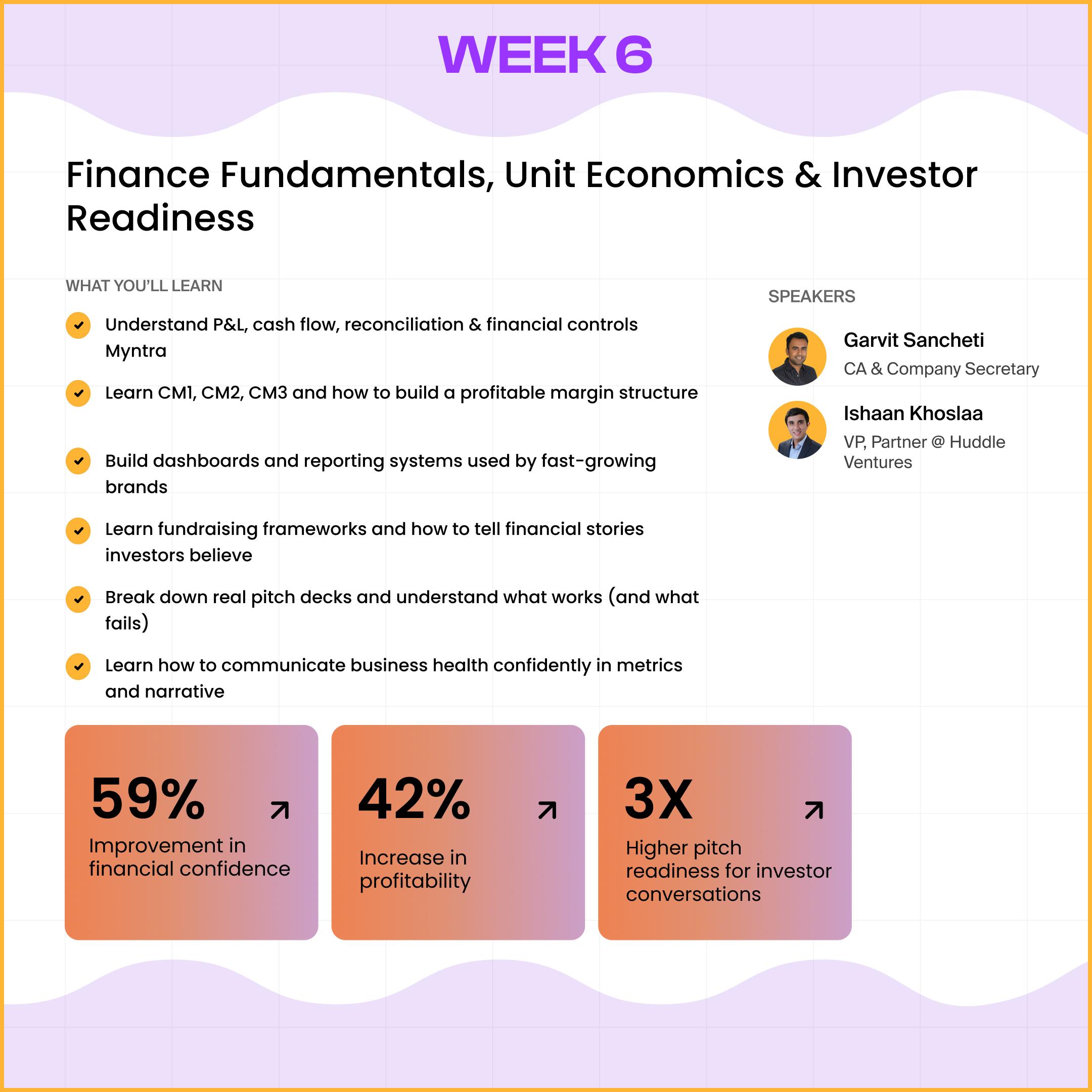 Get plugged into a curated circle of early-stage ambitious D2C founders you can learn from, lean on, and grow with, long after 6 weeks.