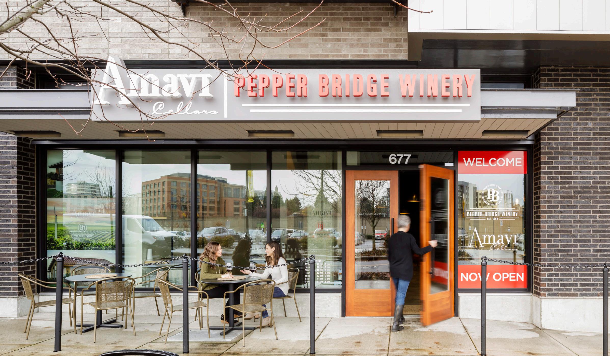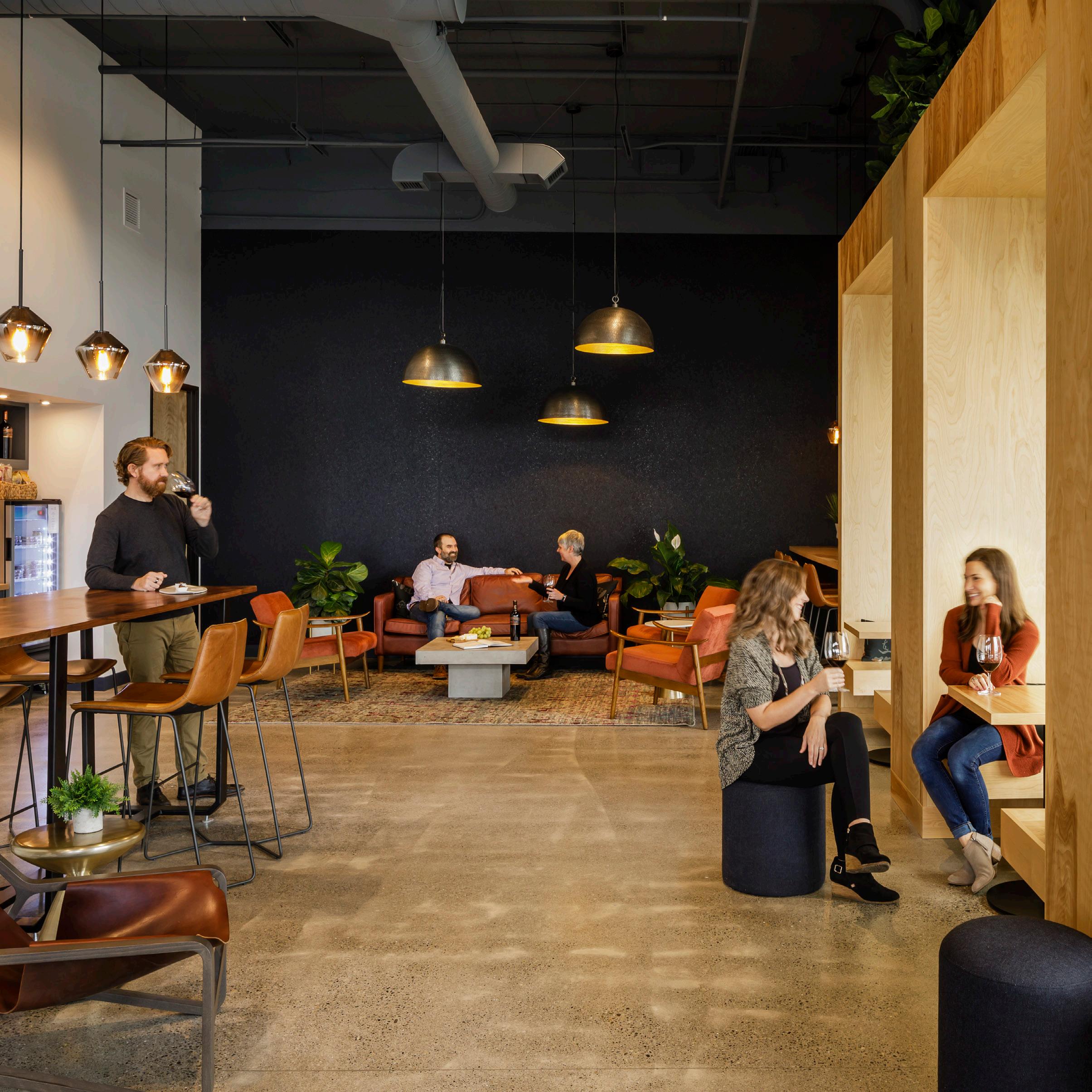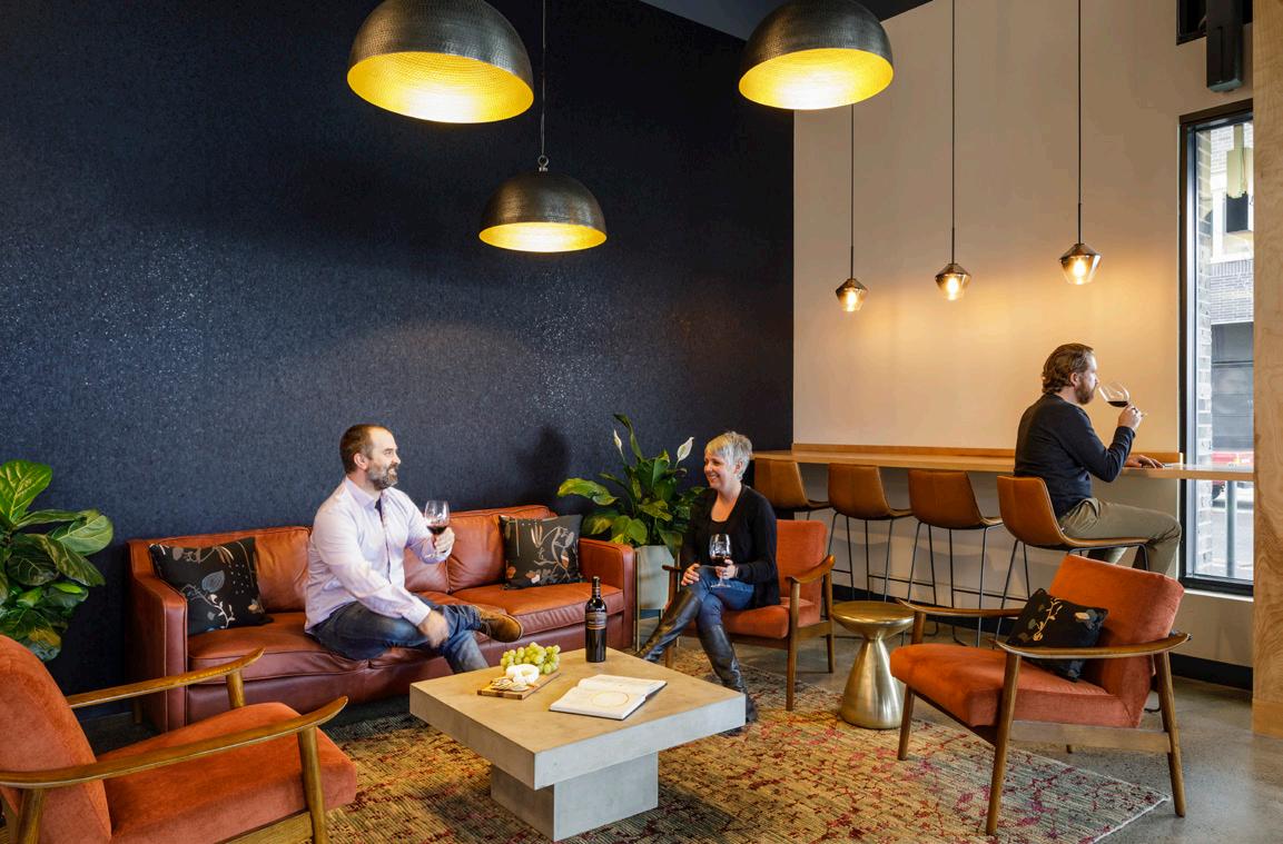 The design celebrates the wine tasting experience blending rich tones balanced with light and bright features like crisp detailing, clean lines, and a contrast of colors and textures.