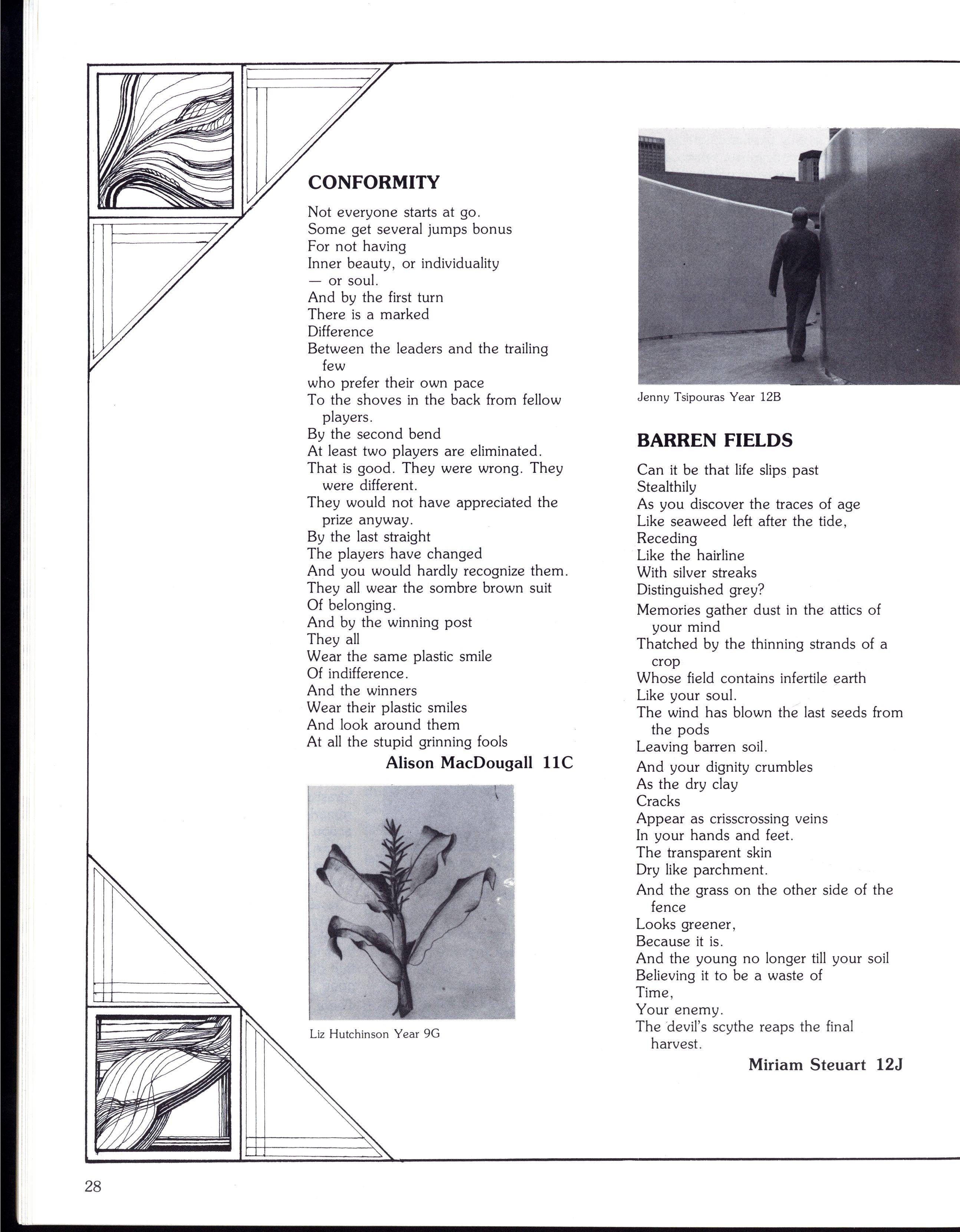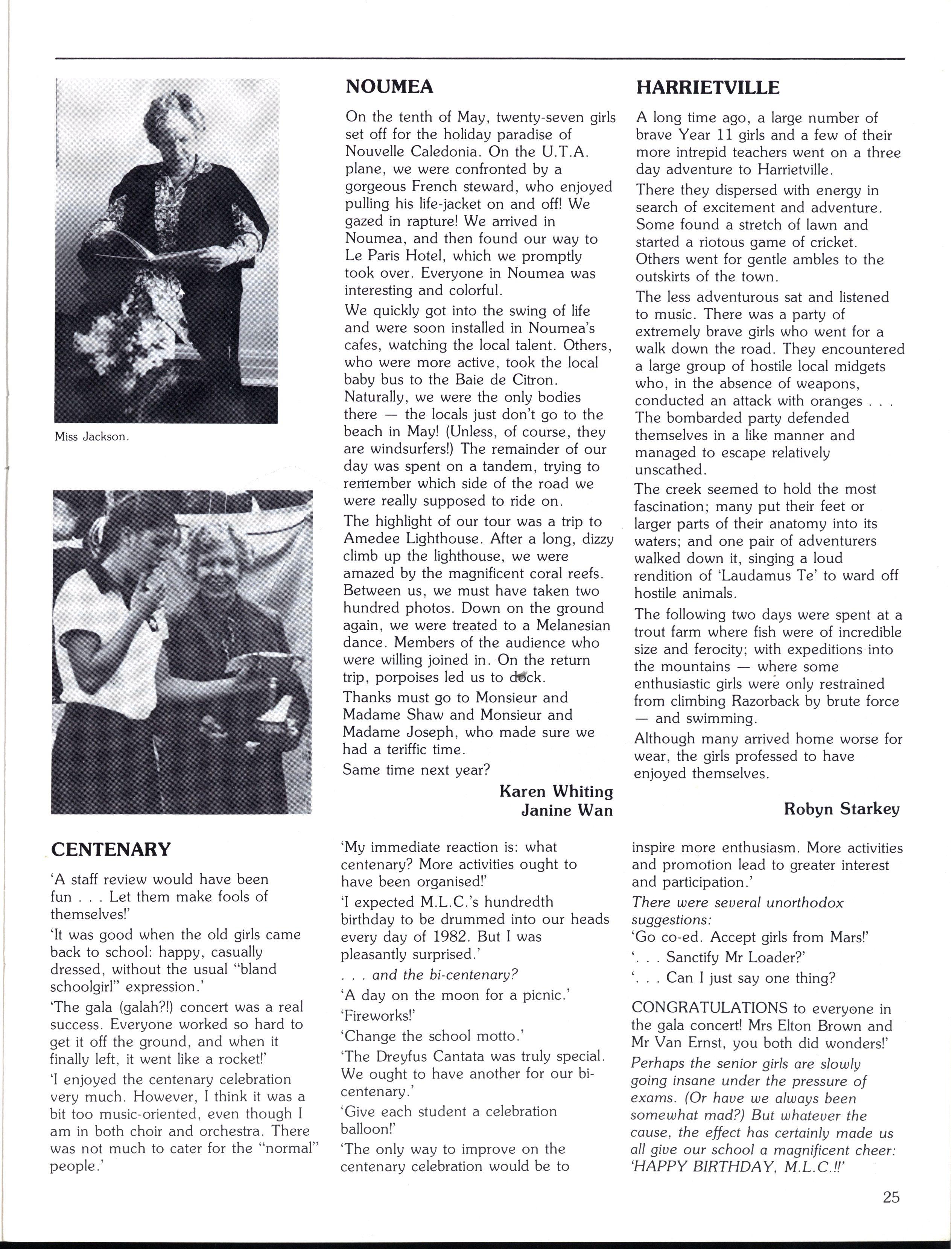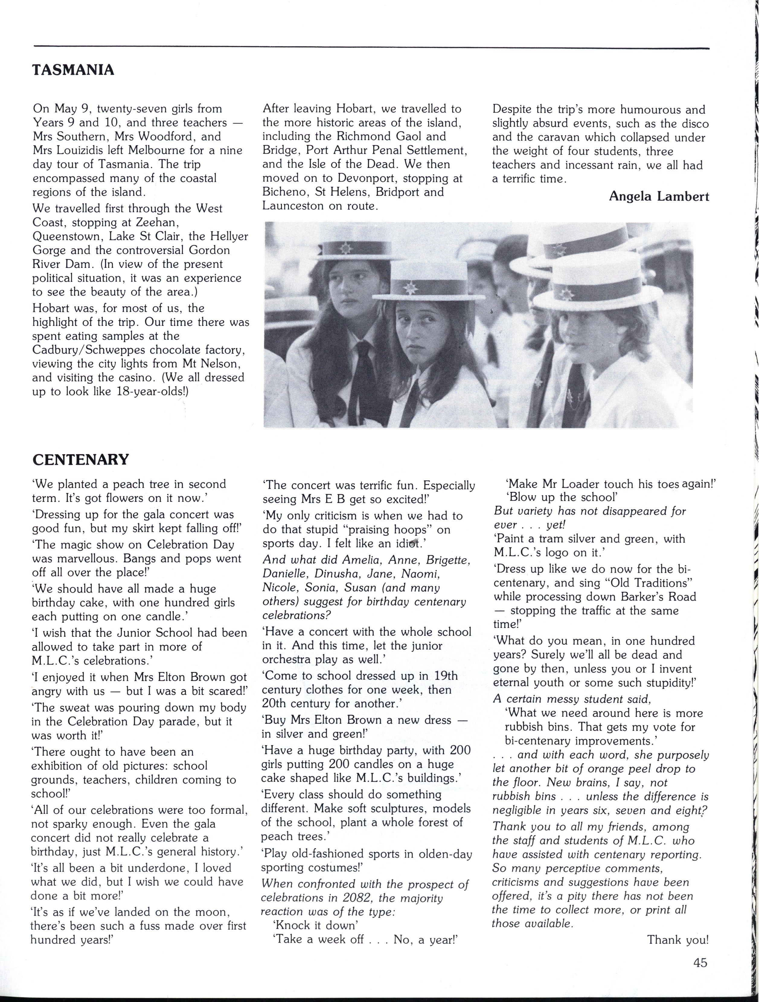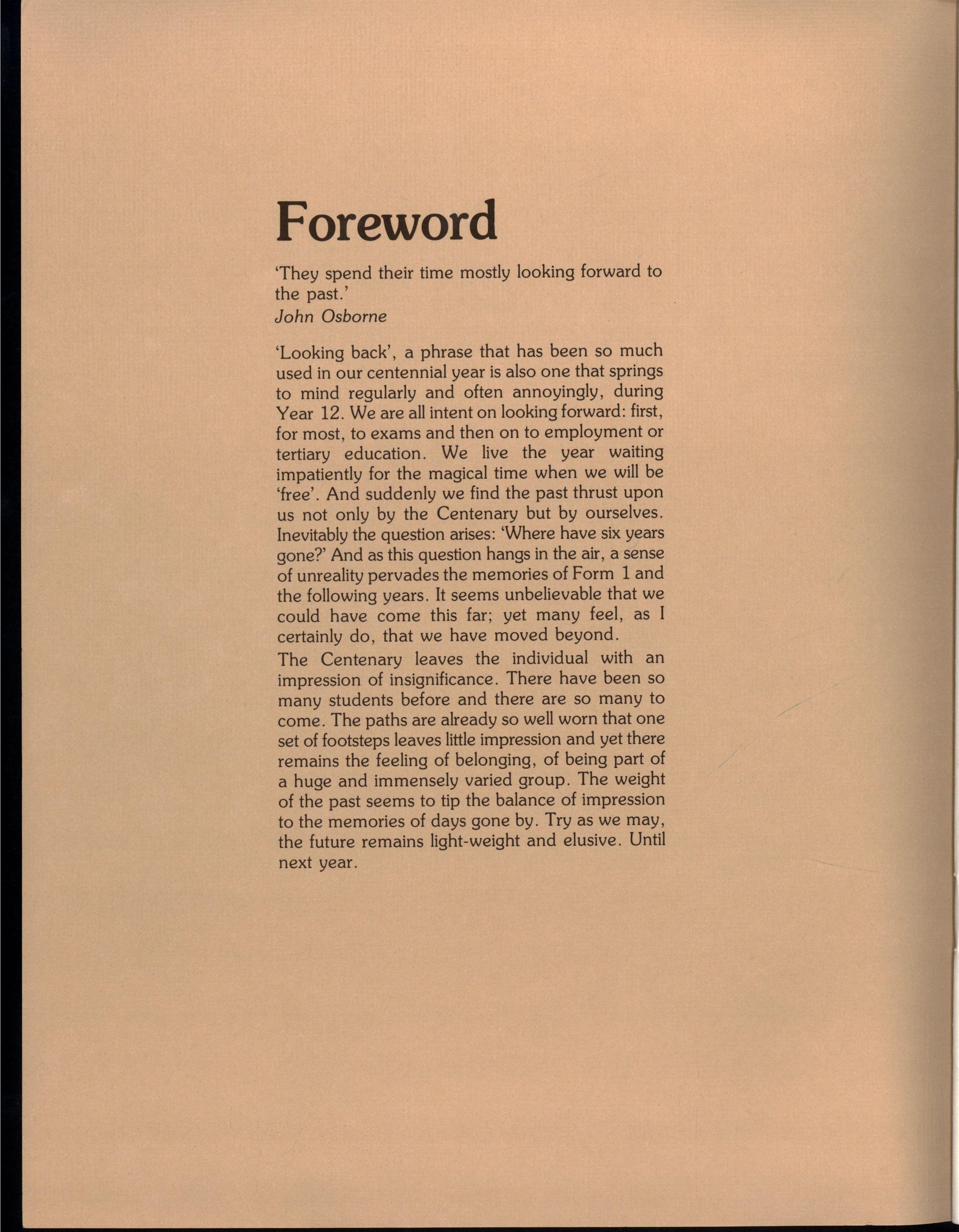 'Looking back', a phrase that has been so much used in our centennial year is also one that springs to mind regularly and often annoyingly, during Year 12 We are all intent on looking forward: first, for most, to exams and then on to employment or tertiary education We live the year waiting impatiently for the magical time when we will be 'free'. And suddenly we find the past thrust upon us not only by the Centenary but by ourselves Inevitably the question arises: 'Where have six years gone?' And as this question hangs in the air, a sense of unreality pervades the memories of Form 1 and the following years It seems unbelievable that we could have come this far; yet many feel, as I certainly do, that we have moved beyond. The Centenary leaves the individual with an impression of insignificance. There have been so many students before and there are so many to come. The paths are already so well worn that one set of footsteps leaves little impression and yet there remains the feeling of belonging, of being part of a huge and immensely varied group. The weight of the past seems to tip the balance of impression to the memories of days gone by. Try as we may, the future remains light-weight and elusive Until next year.