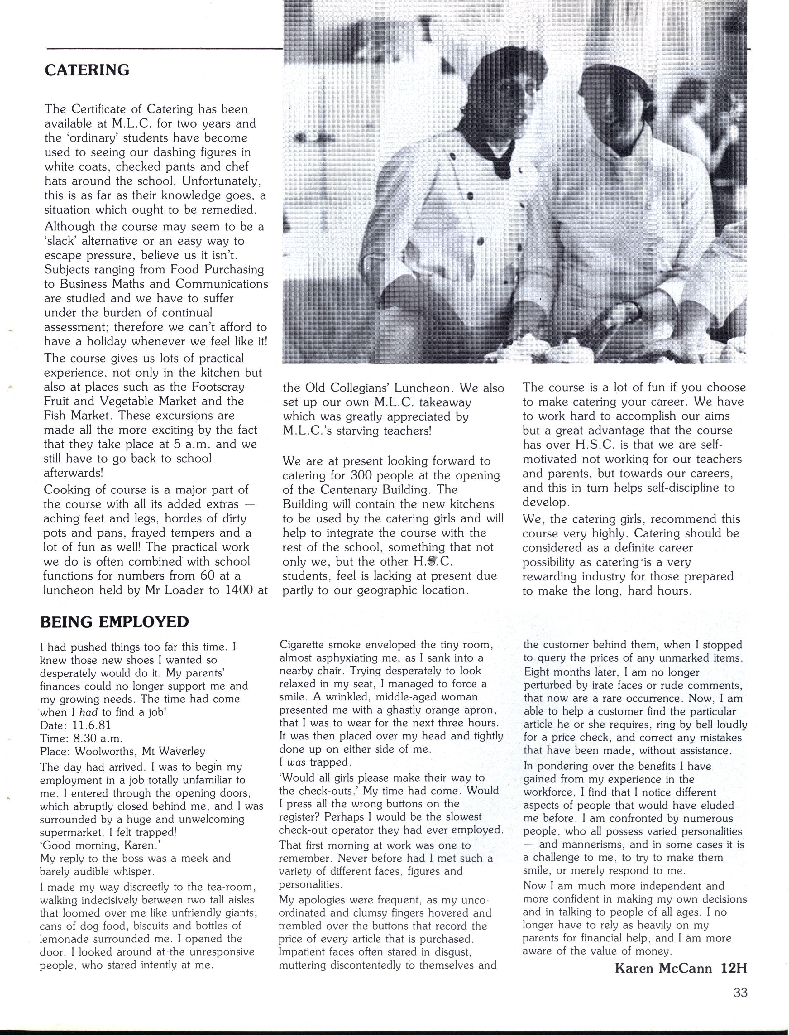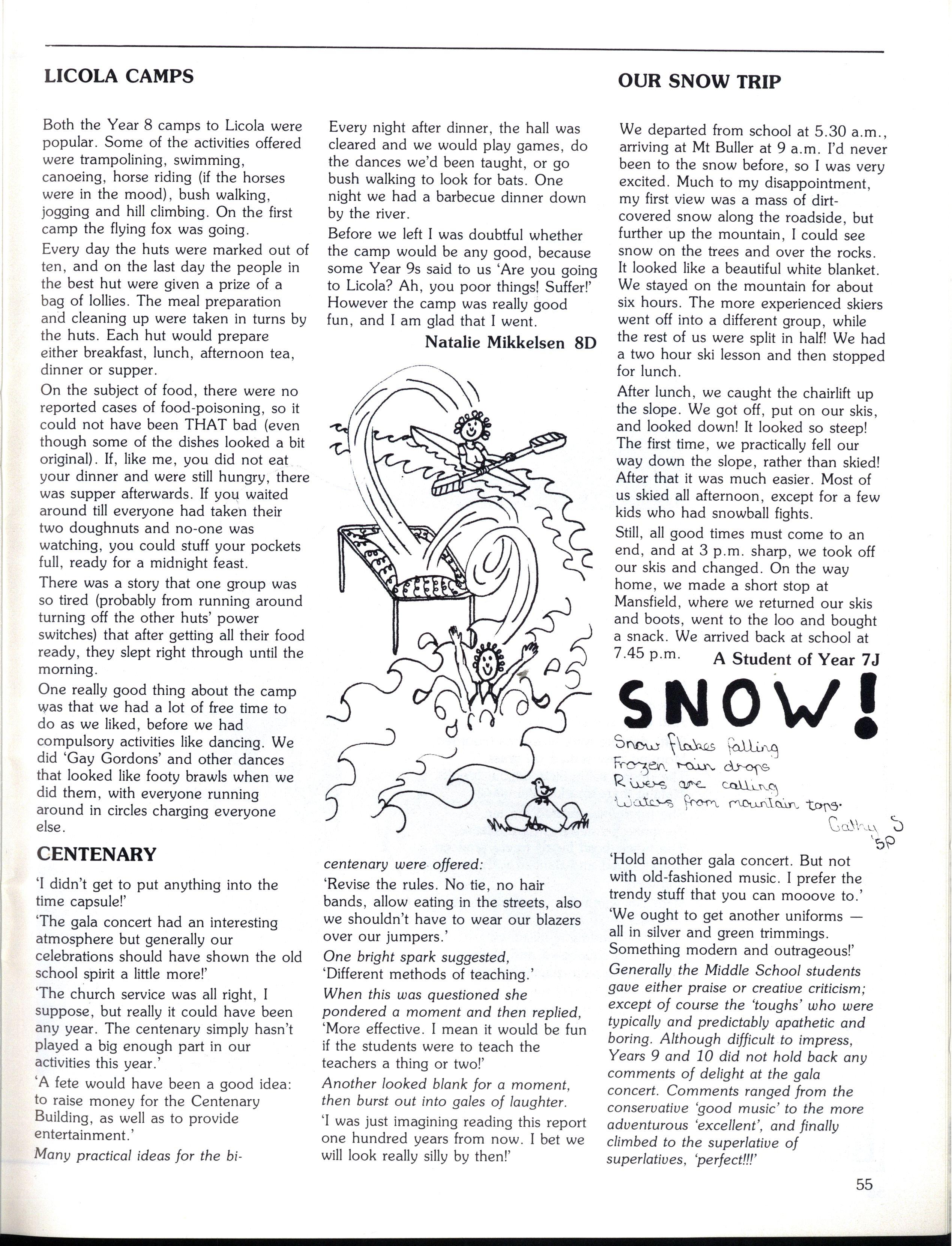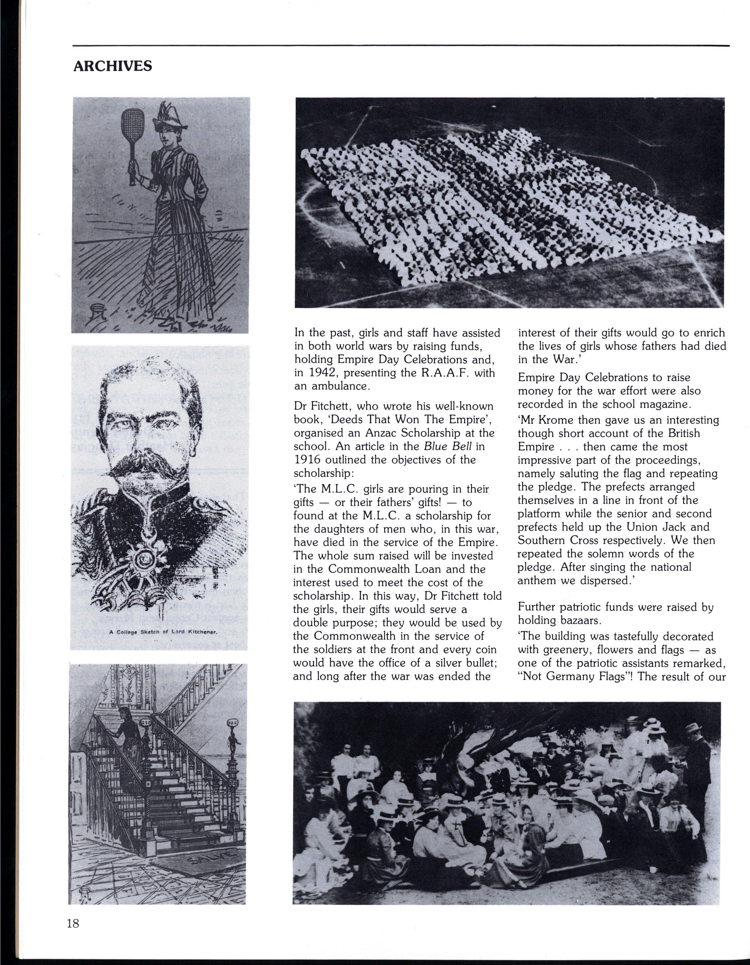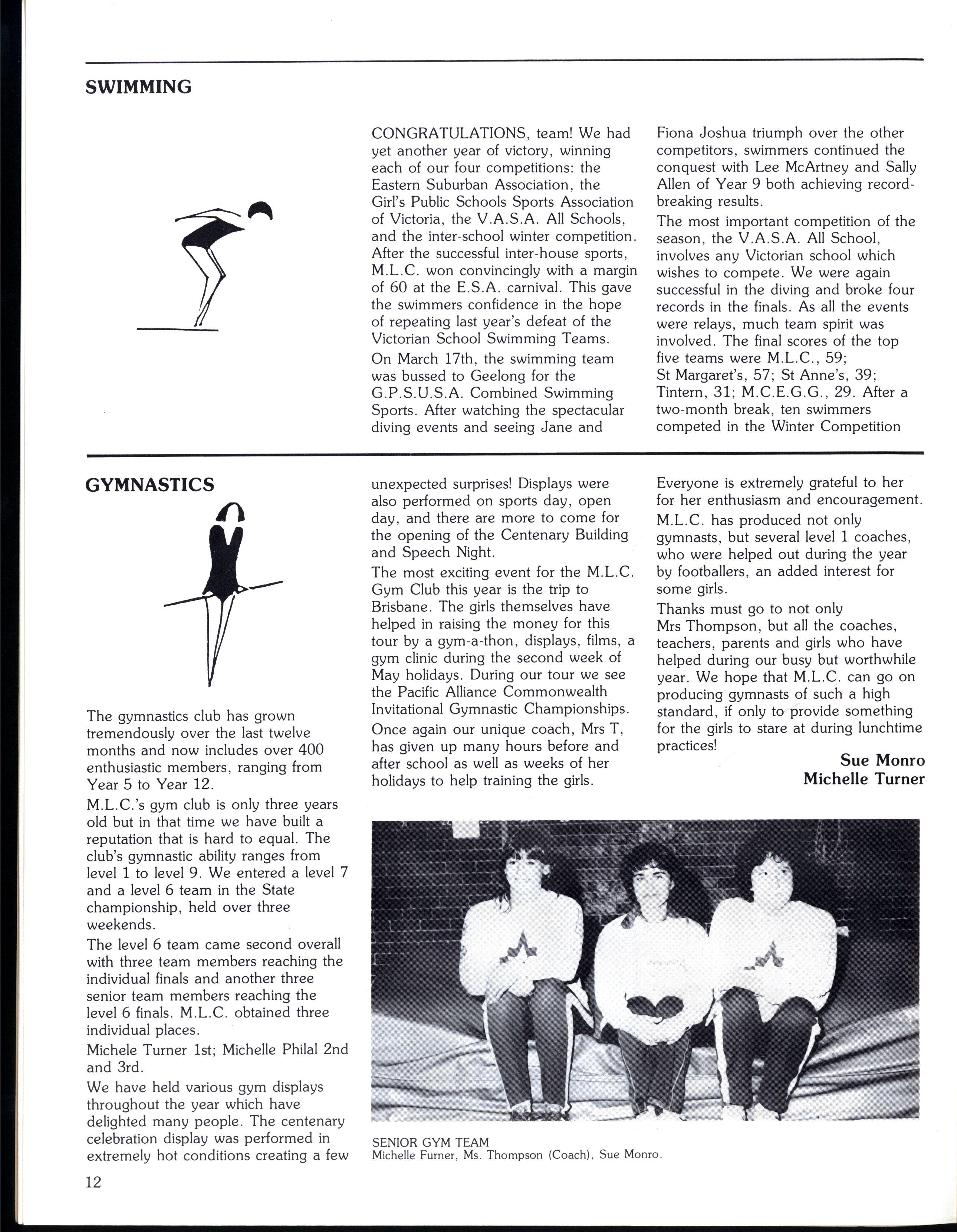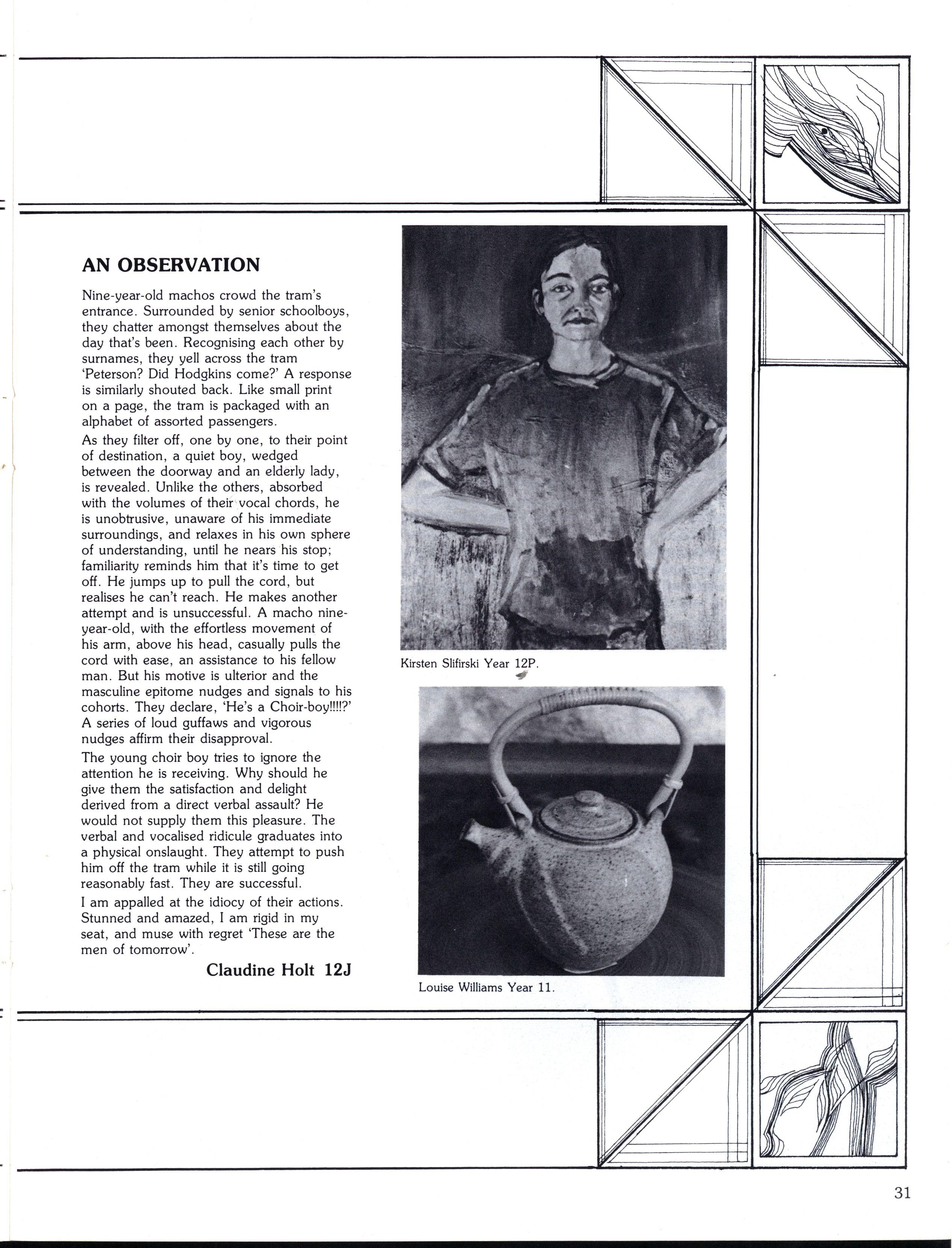 'Looking back', a phrase that has been so much used in our centennial year is also one that springs to mind regularly and often annoyingly, during Year 12 We are all intent on looking forward: first, for most, to exams and then on to employment or tertiary education We live the year waiting impatiently for the magical time when we will be 'free'. And suddenly we find the past thrust upon us not only by the Centenary but by ourselves Inevitably the question arises: 'Where have six years gone?' And as this question hangs in the air, a sense of unreality pervades the memories of Form 1 and the following years It seems unbelievable that we could have come this far; yet many feel, as I certainly do, that we have moved beyond. The Centenary leaves the individual with an impression of insignificance. There have been so many students before and there are so many to come. The paths are already so well worn that one set of footsteps leaves little impression and yet there remains the feeling of belonging, of being part of a huge and immensely varied group. The weight of the past seems to tip the balance of impression to the memories of days gone by. Try as we may, the future remains light-weight and elusive Until next year.