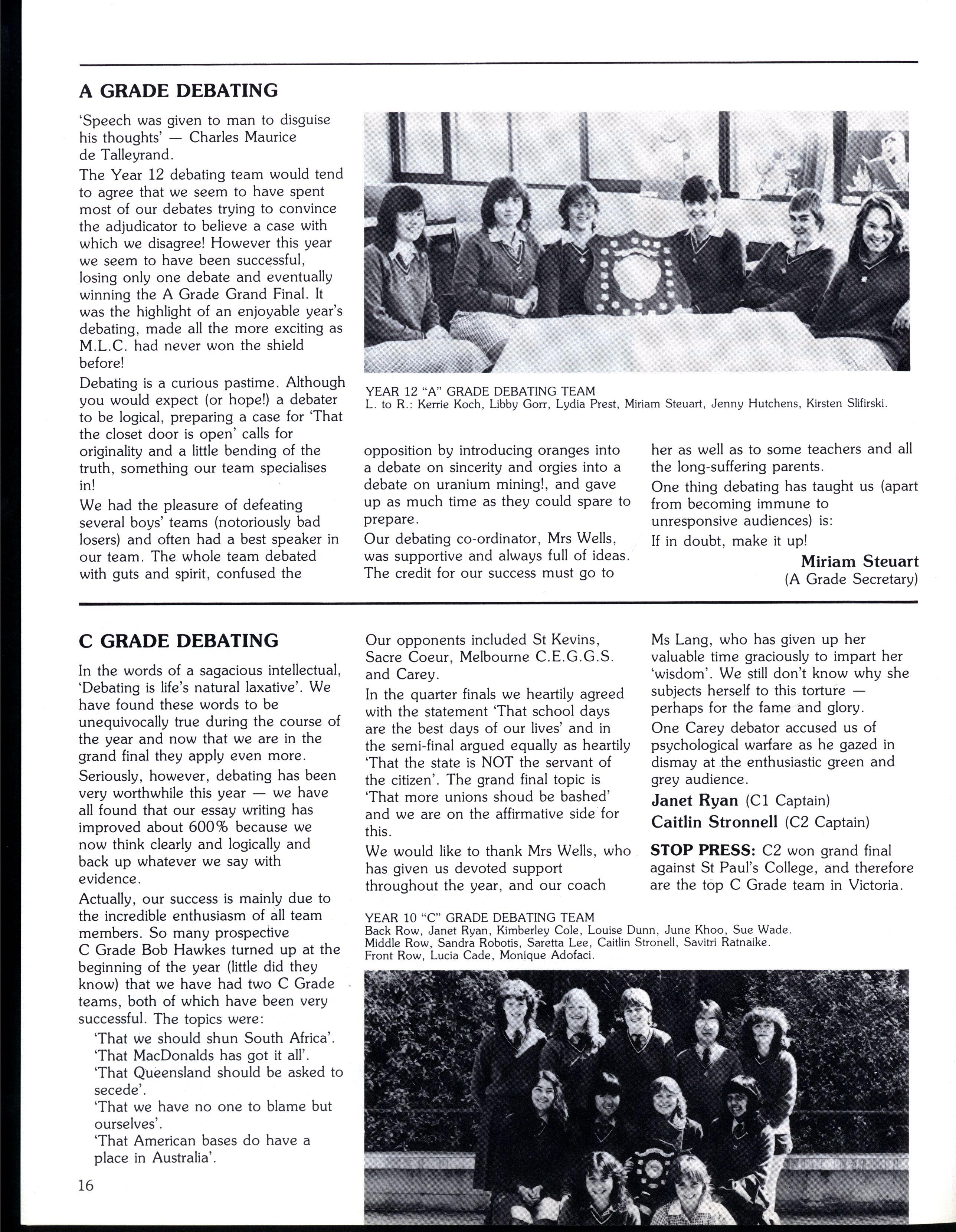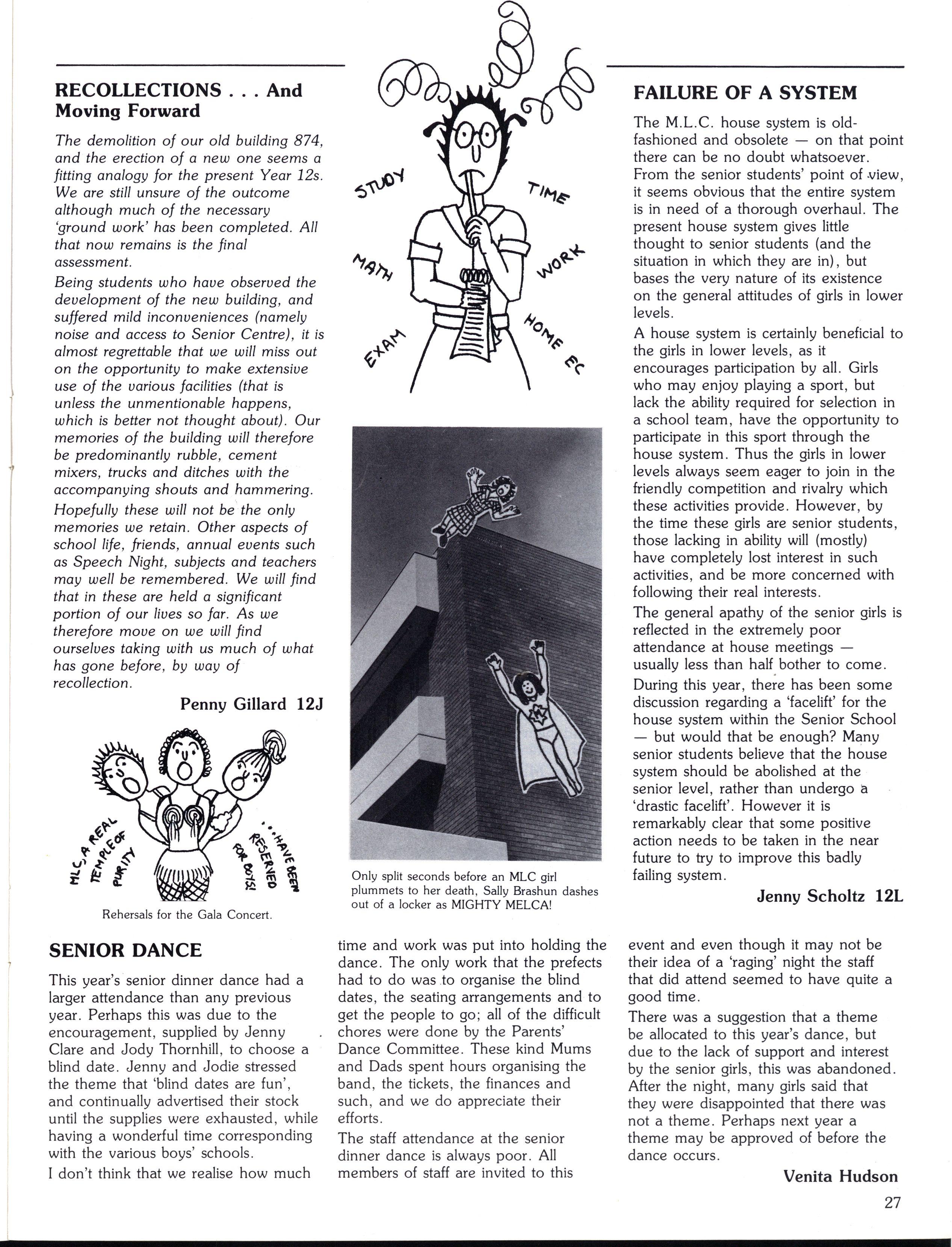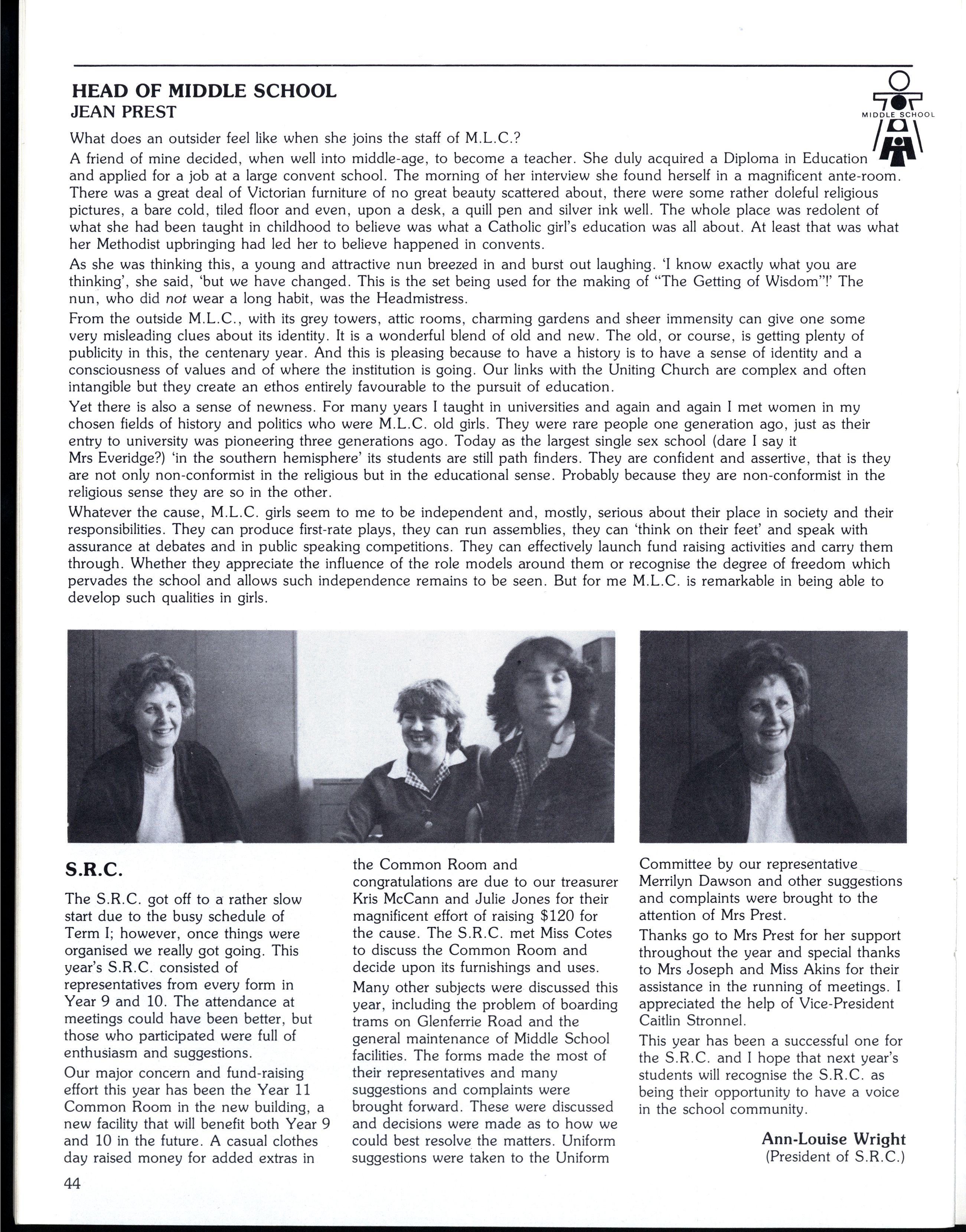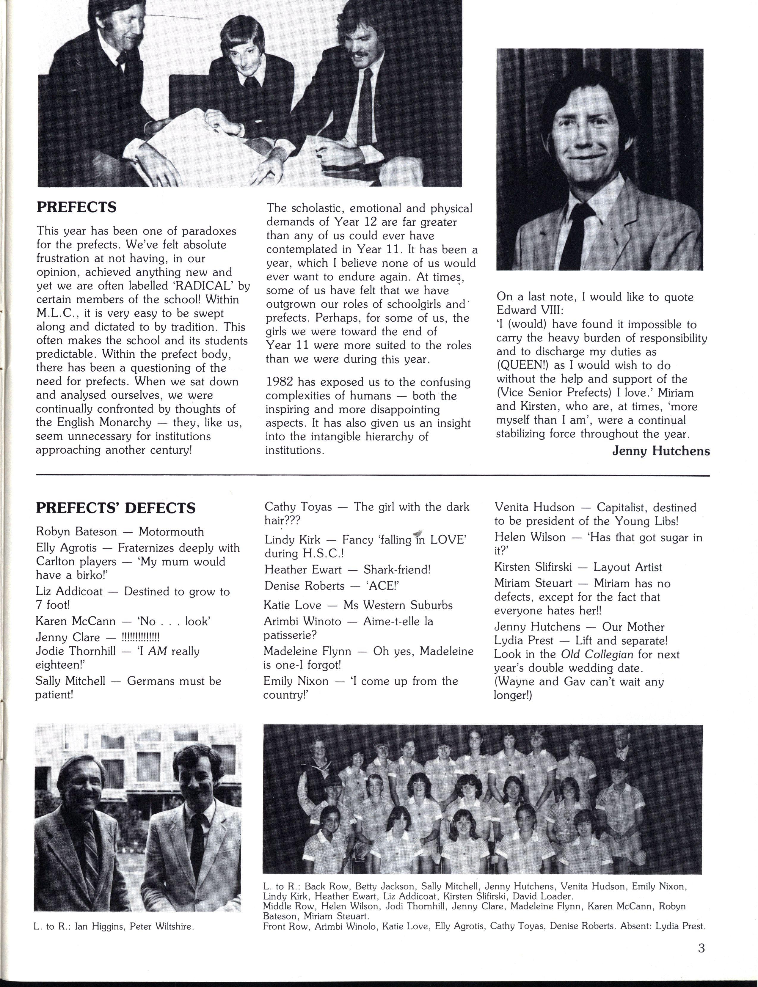 This year has been one of paradoxes for the prefects. We've felt absolute frustration at not having, in our opinion, achieved anything new and yet we are often labelled 'RADICAL' by certain members of the school! Within M.L.C., it is very easy to be swept along and dictated to by tradition. This often makes the school and its students predictable. Within the prefect body, there has been a questioning of the need for prefects. When we sat down and analysed ourselves, we were continually confronted by thoughts of the English Monarchy — they, like us, seem unnecessary for institutions approaching another century!