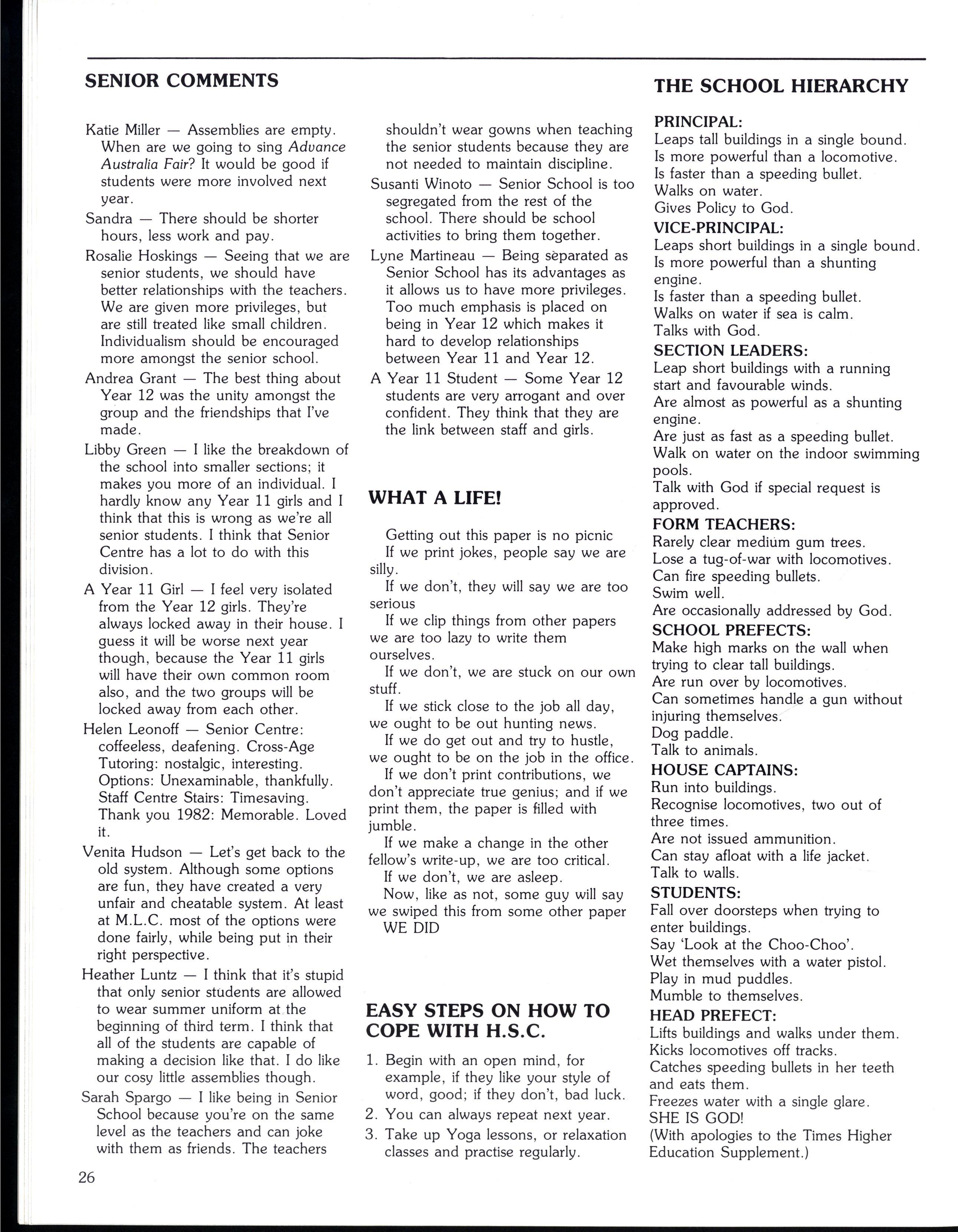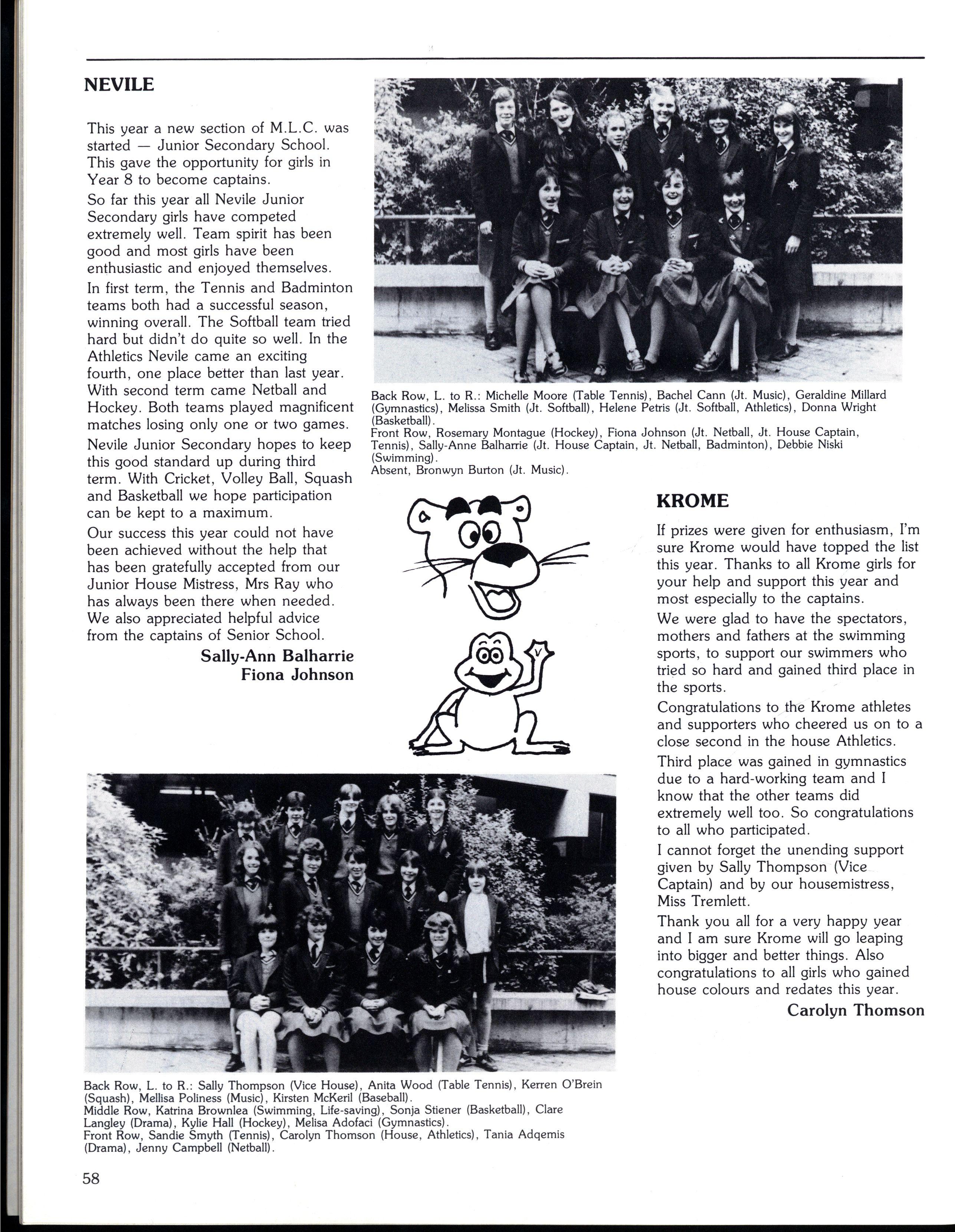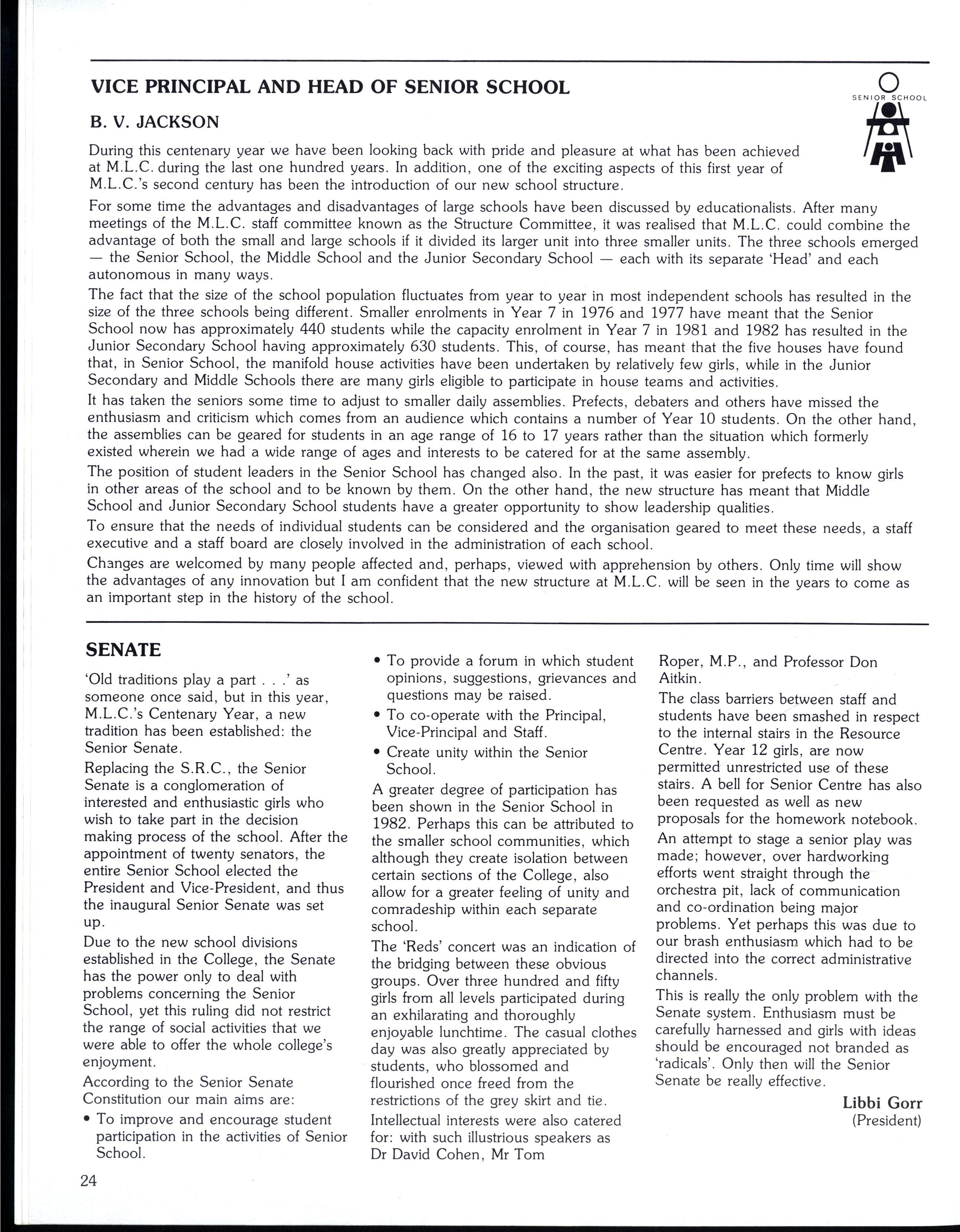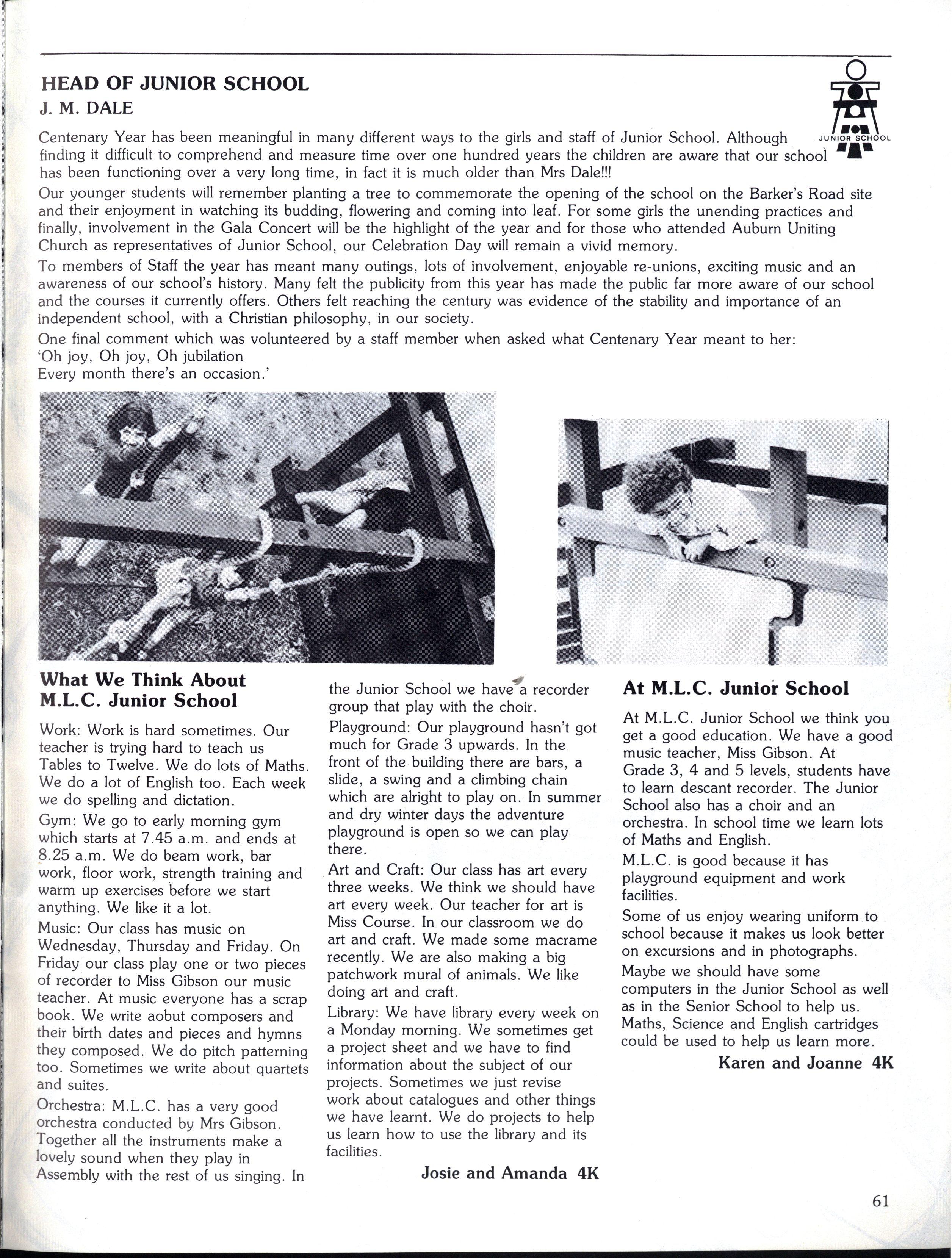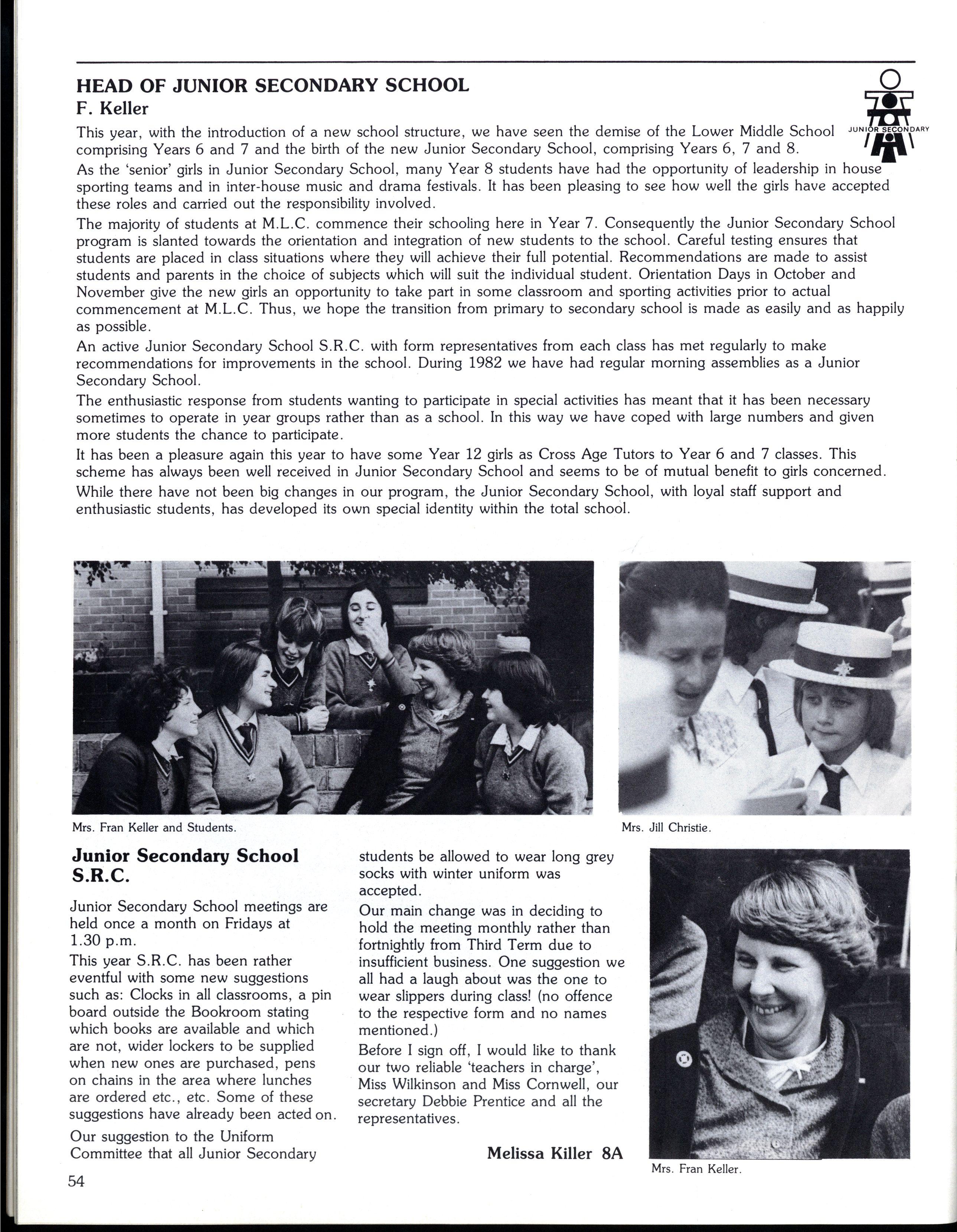 This year has been one of paradoxes for the prefects. We've felt absolute frustration at not having, in our opinion, achieved anything new and yet we are often labelled 'RADICAL' by certain members of the school! Within M.L.C., it is very easy to be swept along and dictated to by tradition. This often makes the school and its students predictable. Within the prefect body, there has been a questioning of the need for prefects. When we sat down and analysed ourselves, we were continually confronted by thoughts of the English Monarchy — they, like us, seem unnecessary for institutions approaching another century!
