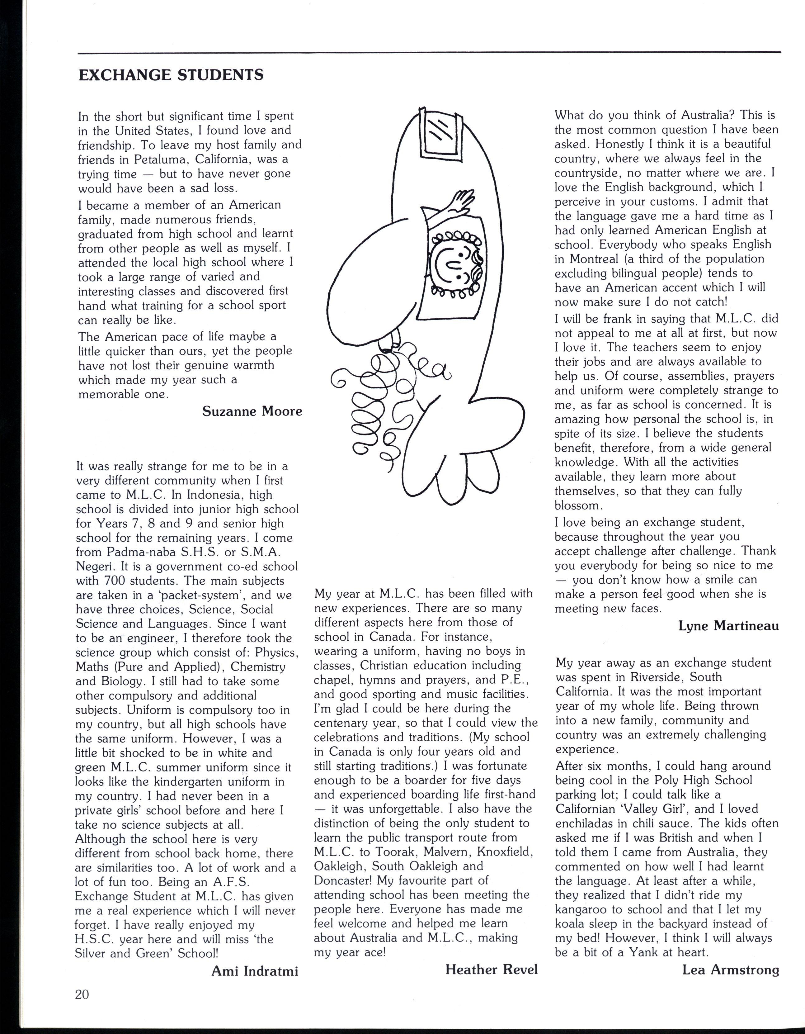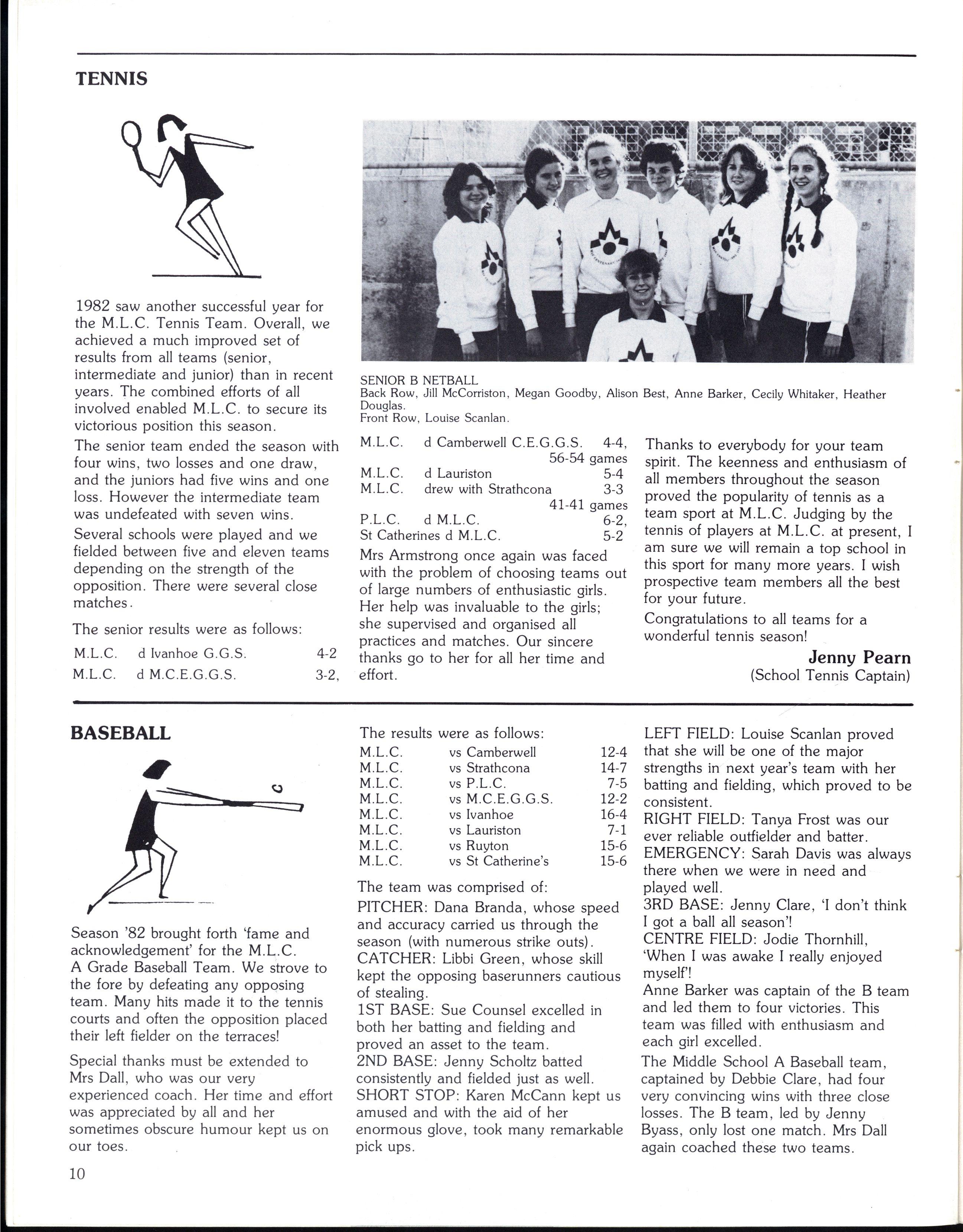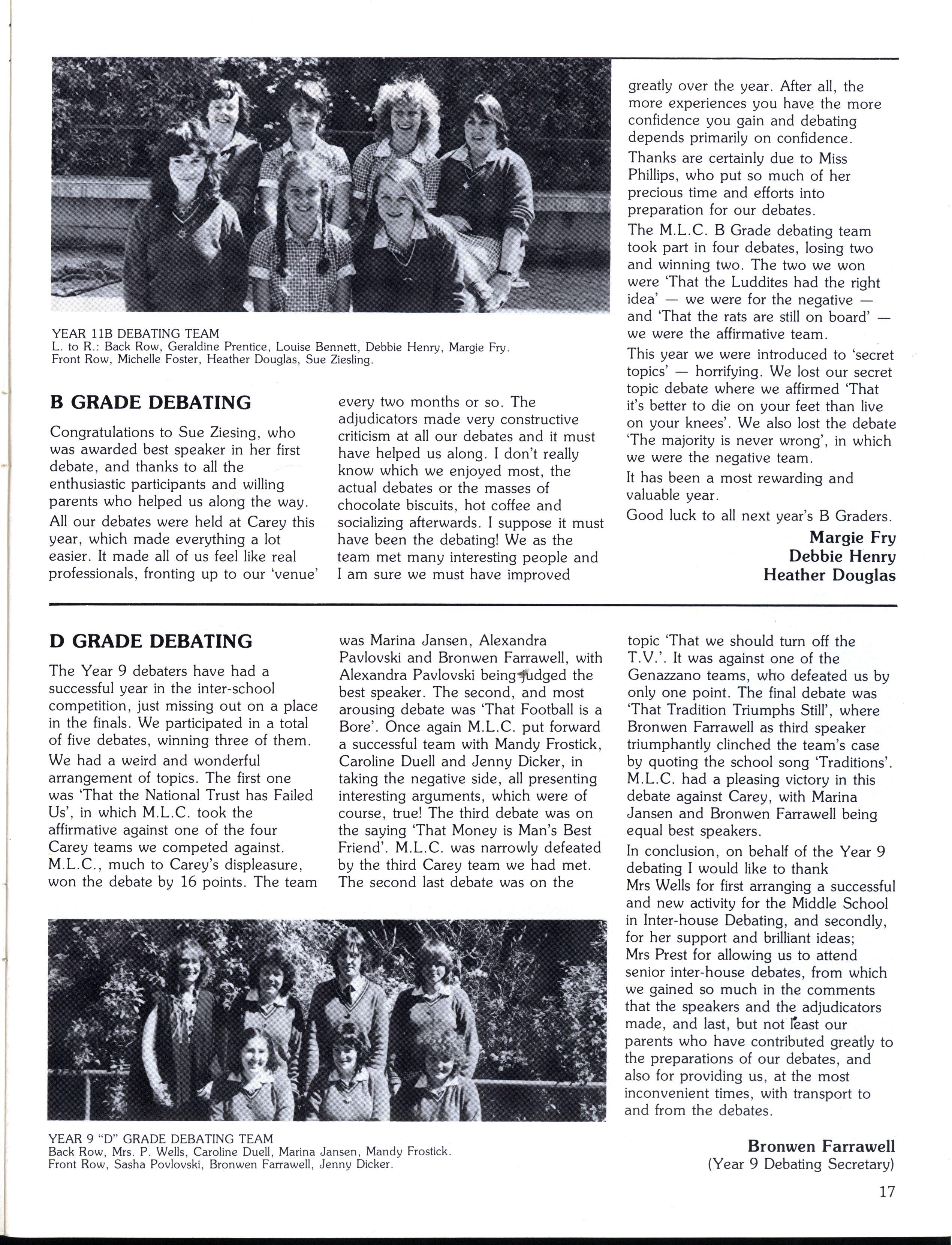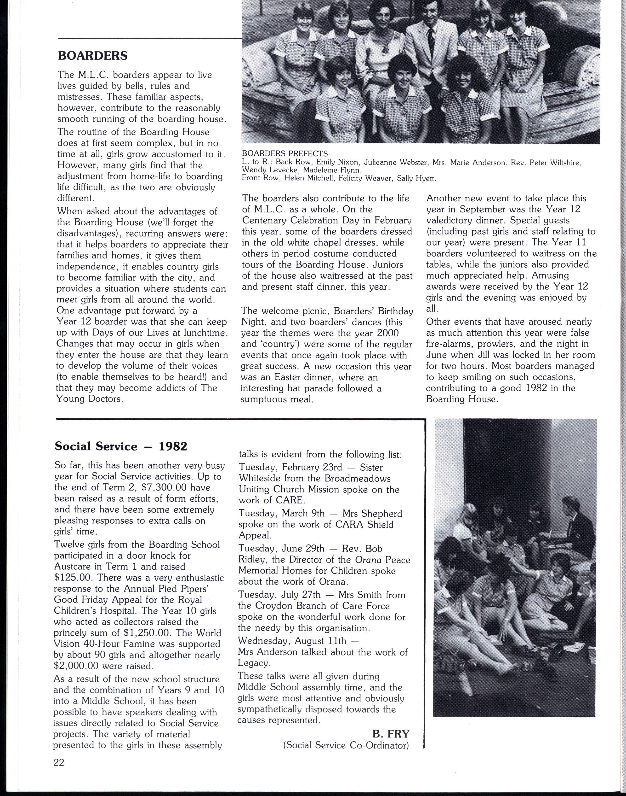This year has been one of paradoxes for the prefects. We've felt absolute frustration at not having, in our opinion, achieved anything new and yet we are often labelled 'RADICAL' by certain members of the school! Within M.L.C., it is very easy to be swept along and dictated to by tradition. This often makes the school and its students predictable. Within the prefect body, there has been a questioning of the need for prefects. When we sat down and analysed ourselves, we were continually confronted by thoughts of the English Monarchy — they, like us, seem unnecessary for institutions approaching another century!