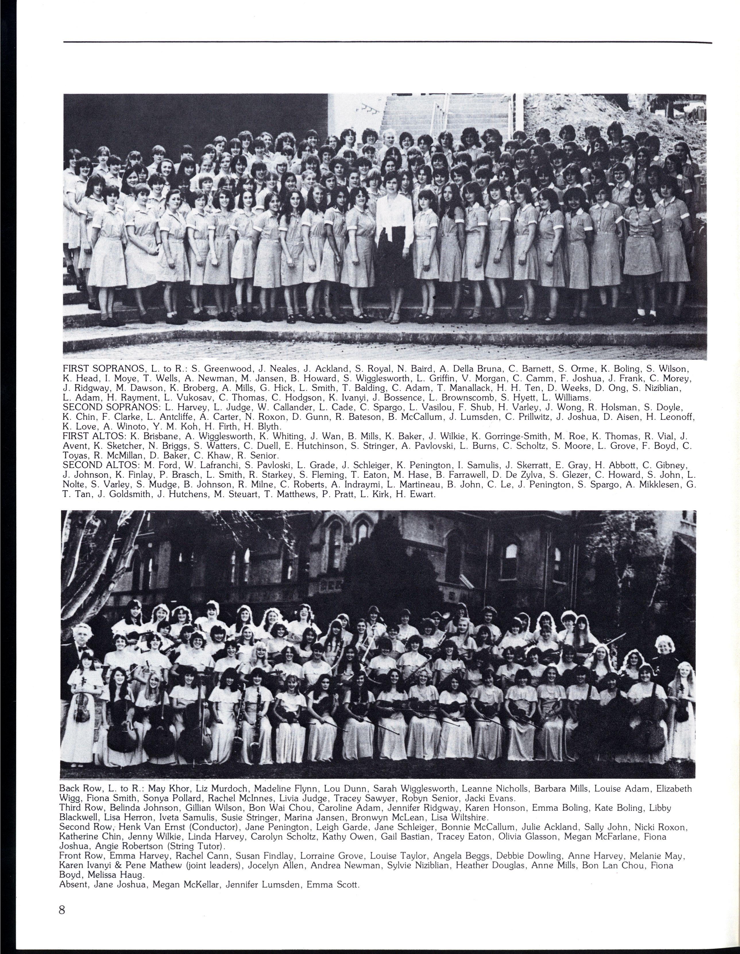 with special emphasis on keyboard musicianship and recorder playing. Thanks are extended to Christine Le (School Pianist and Joint Leader of Madrigals), to Lyndal Williams (Joint Leader of Madrigals), Pene Mathew and Karen Ivanyi (Joint Orchestra Leaders), to Fiona Boyd and the many loyal and enthusiastic girls who supported the work of the music school during this exceptionally busy year. Always appreciated, of course, is the work of the talented music staff, Assistant Director (Mr Van Ernst) and Music Secretary (Mrs Calwell).