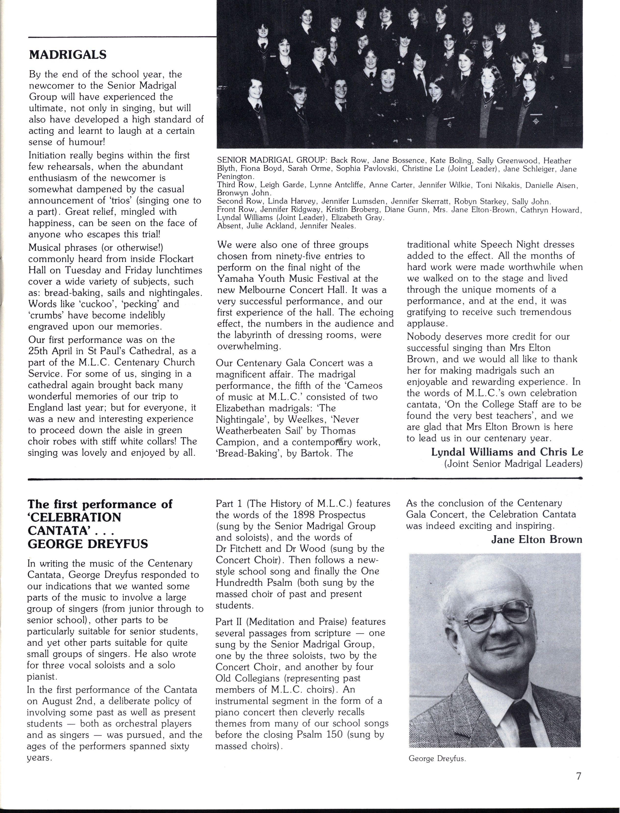Our Centenary Gala Concert was a magnificent affair. The madrigal performance, the fifth of the 'Cameos of music at M.L.C.' consisted of two Elizabethan madrigals: 'The Nightingale', by Weelkes, 'Never Weatherbeaten Sail' by Thomas Campion, and a contempof&ry work, 'Bread-Baking', by Bartok. The