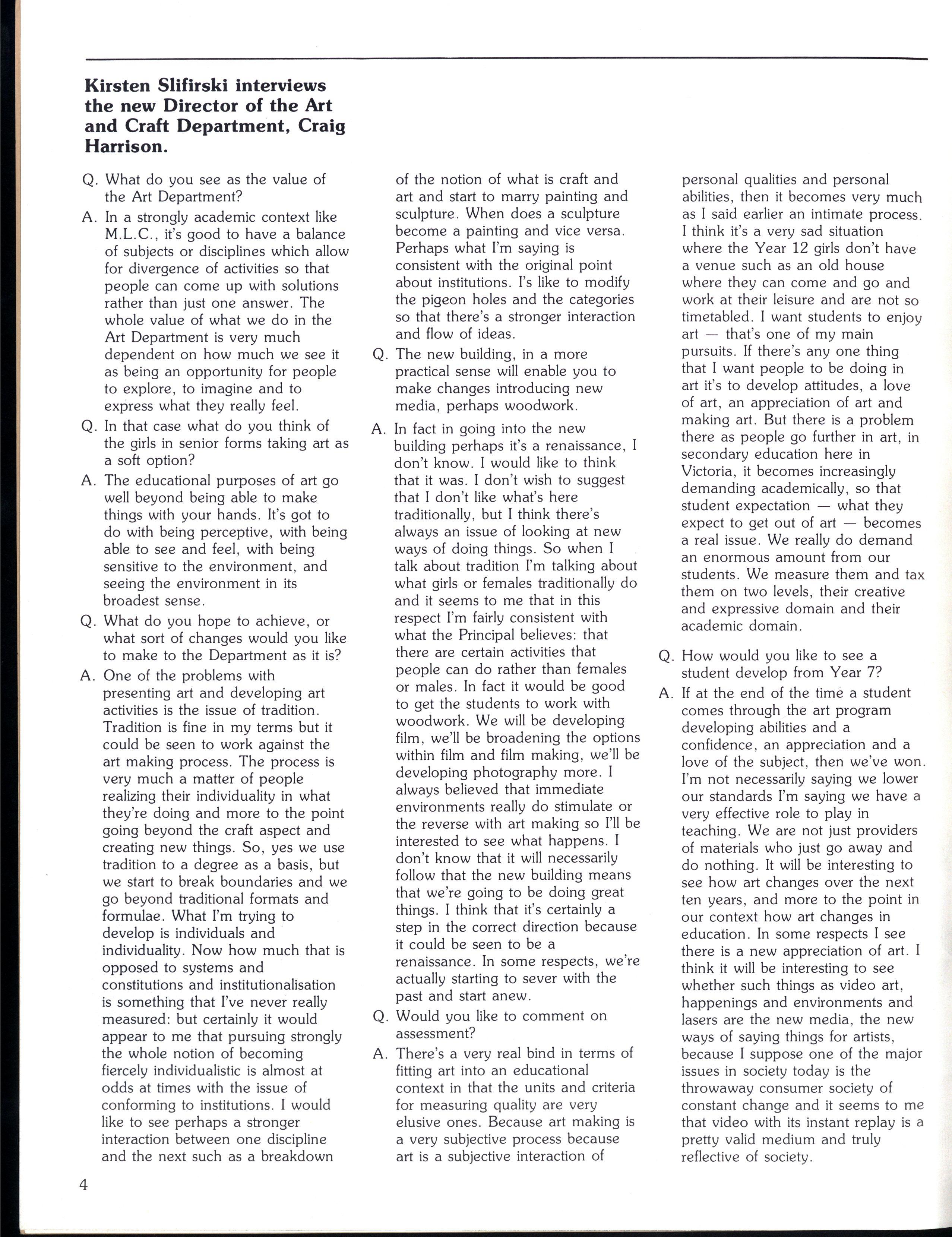 A. In fact in going into the new building perhaps it's a renaissance, I don't know. I would like to think that it was. I don't wish to suggest that I don't like what's here traditionally, but I think there's always an issue of looking at new ways of doing things. So when I talk about tradition I'm talking about what girls or females traditionally do and it seems to me that in this respect I'm fairly consistent with what the Principal believes: that there are certain activities that people can do rather than females or males. In fact it would be good to get the students to work with woodwork. We will be developing film, we'll be broadening the options within film and film making, we'll be developing photography more. I always believed that immediate environments really do stimulate or the reverse with art making so I'll be interested to see what happens. I don't know that it will necessarily follow that the new building means that we're going to be doing great things. I think that it's certainly a step in the correct direction because it could be seen to be a renaissance. In some respects, we're actually starting to sever with the past and start anew.