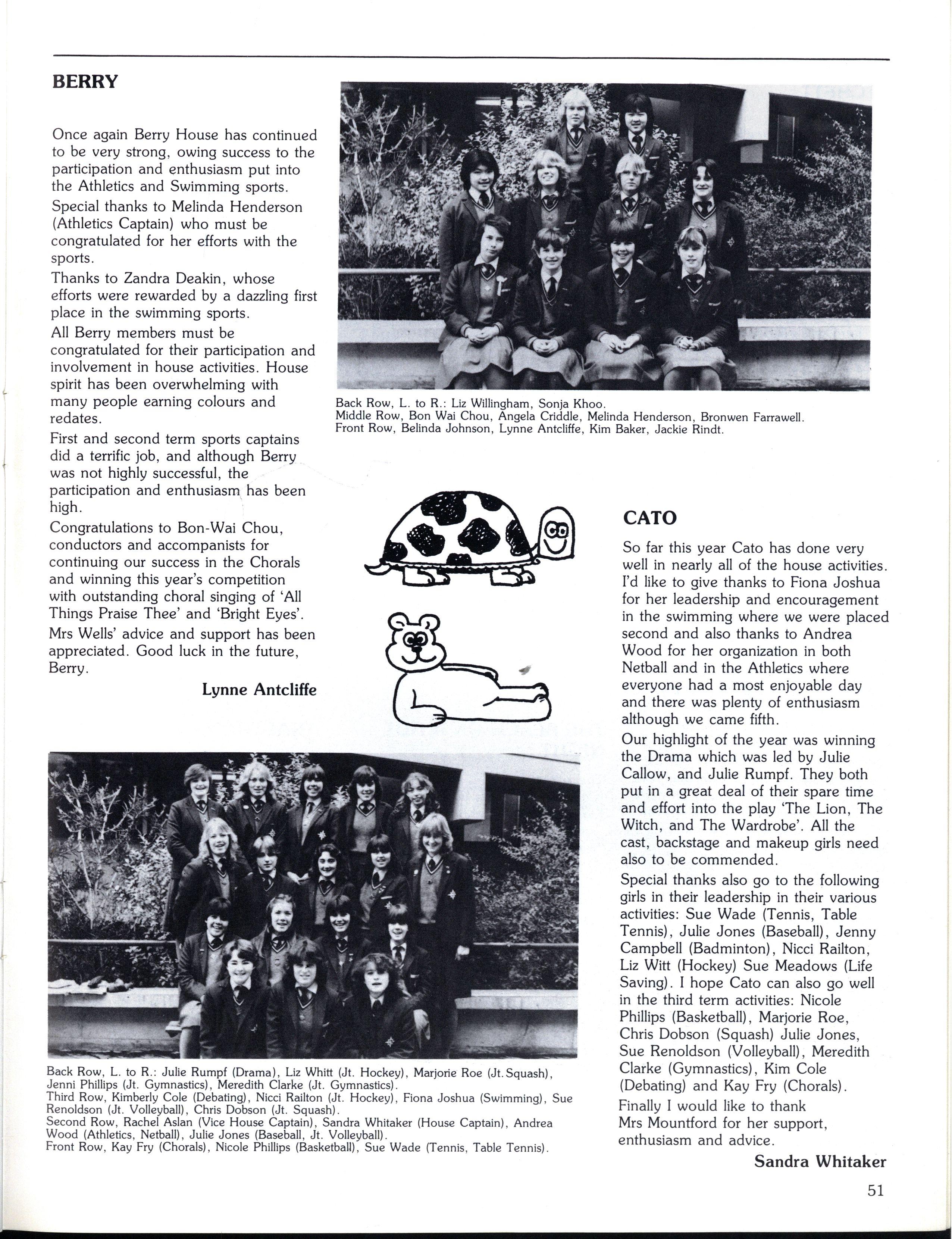 Second Row, Linda Harvey, Jennifer Lumsden, Jennifer Skerratt, Robyn Starkey, Sally John Front Row, Jennifer Ridgway, Kristin Broberg, Diane Gunn, Mrs Jane Elton-Brown, Cathryn Howard, Lyndal Williams (Joint Leader), Elizabeth Gray Absent, Julie Ackland, Jennifer Neales