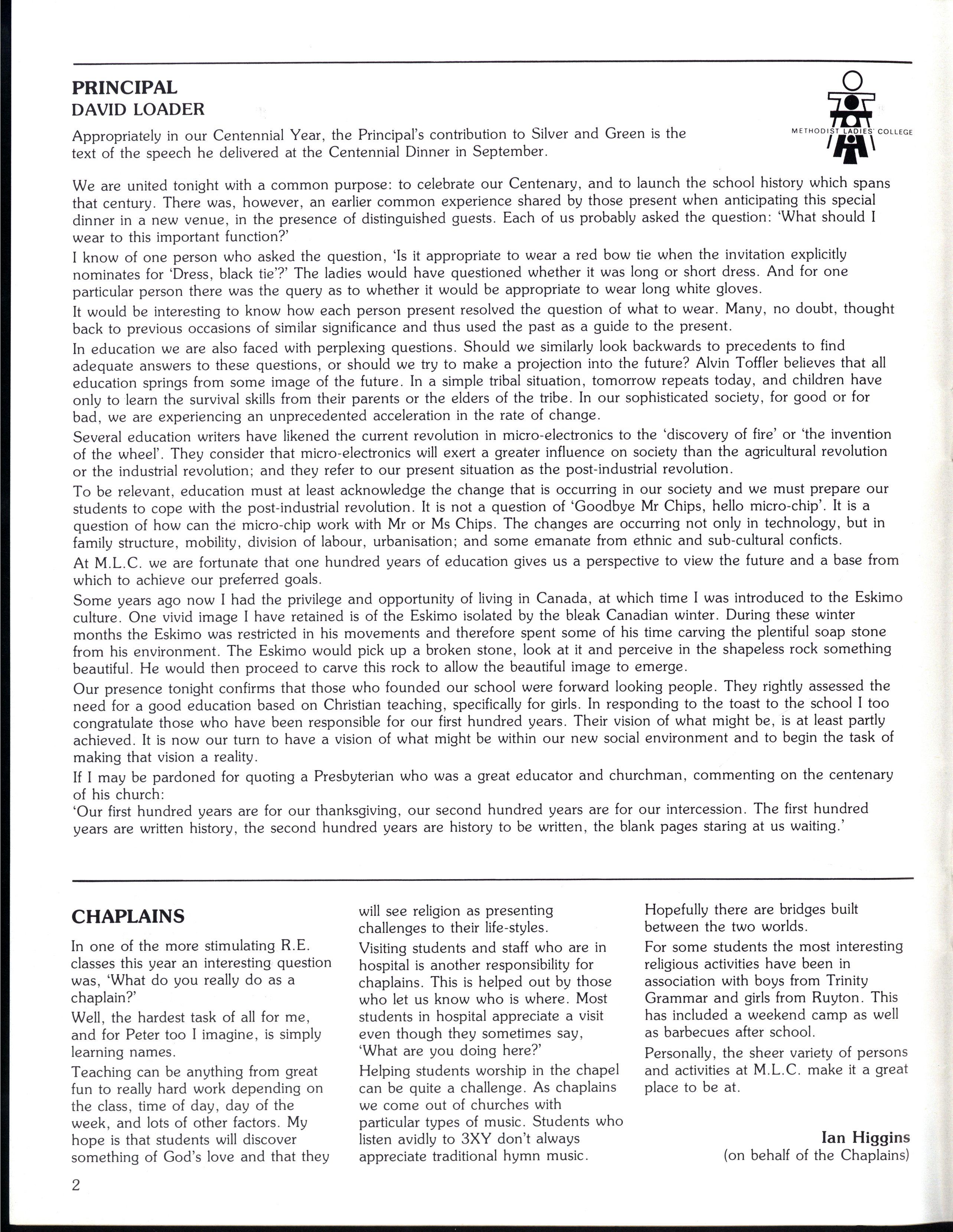 Appropriately in our Centennial Year, the Principal's contribution to Silver and Green is the text of the speech he delivered at the Centennial Dinner in September.
