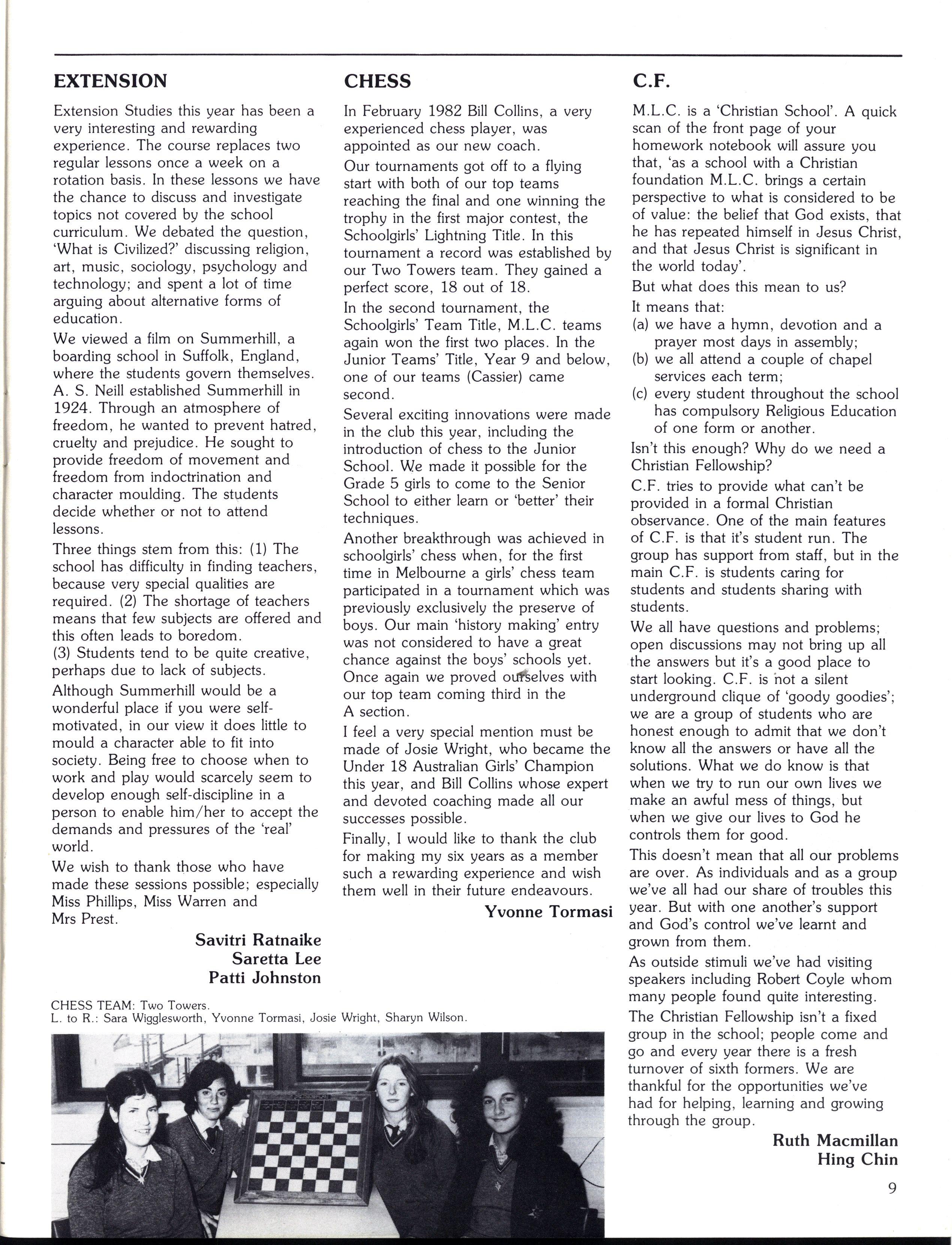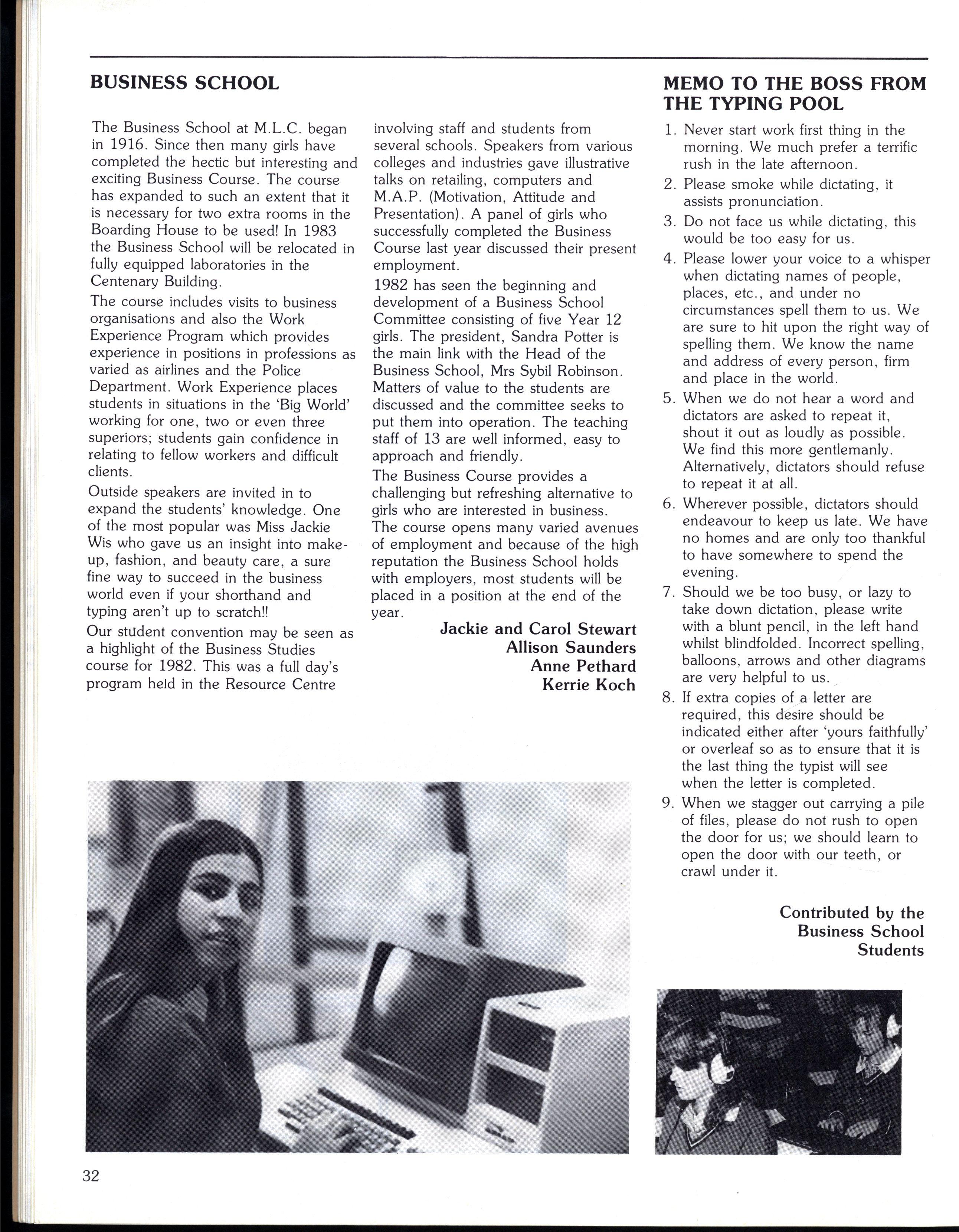 1. In 1982, a total of 636 girls have enrolled for special music tuition and very many of them have sat for A.M.E.B. examinations with success. We are indeed grateful to our staff of forty-one visiting and full-time teachers.
