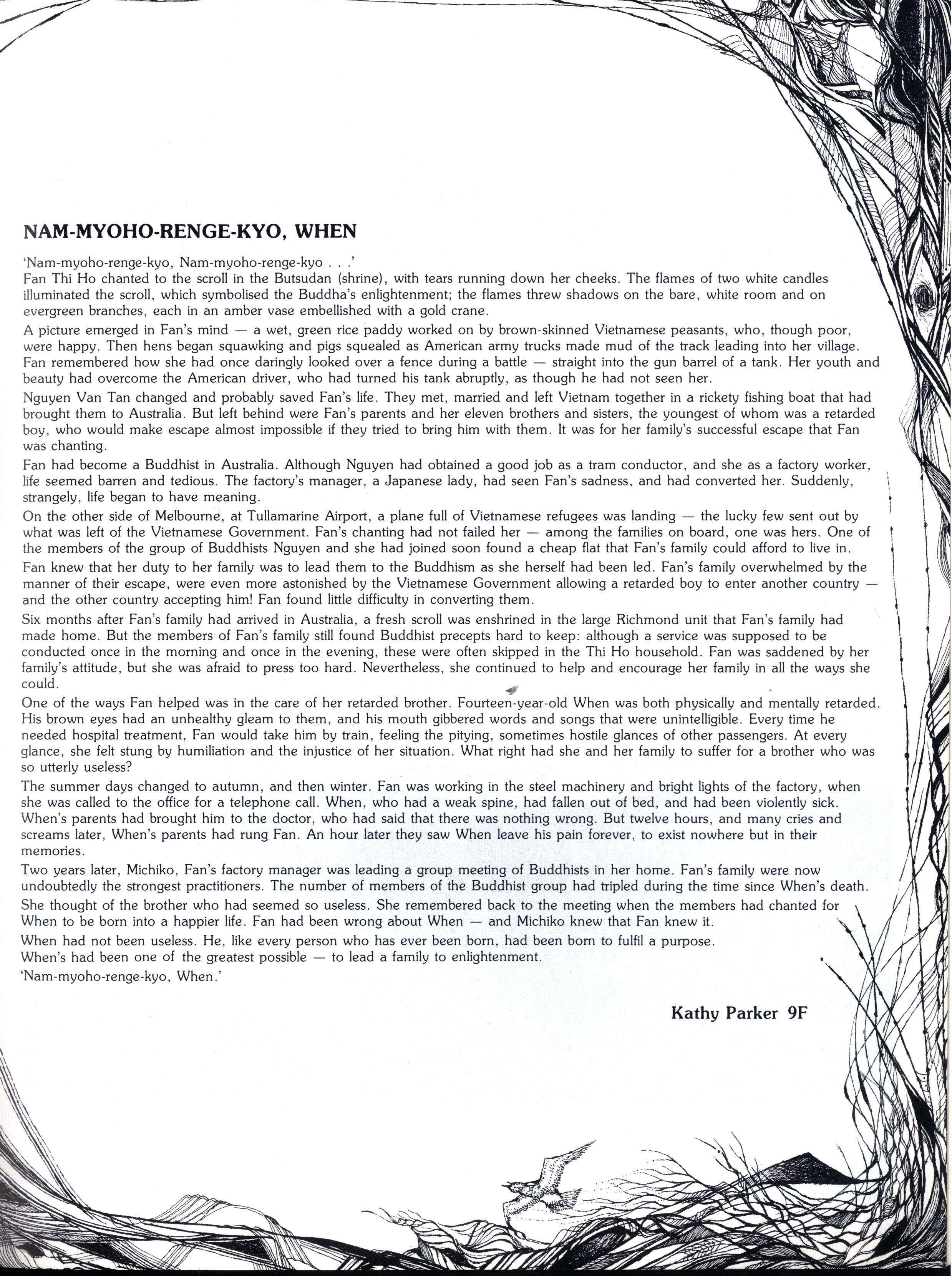 personal qualities and personal abilities, then it becomes very much as I said earlier an intimate process. I think it's a very sad situation where the Year 12 girls don't have a venue such as an old house where they can come and go and work at their leisure and are not so timetabled. I want students to enjoy art — that's one of my main pursuits. If there's any one thing that I want people to be doing in art it's to develop attitudes, a love of art, an appreciation of art and making art. But there is a problem there as people go further in art, in secondary education here in Victoria, it becomes increasingly demanding academically, so that student expectation — what they expect to get out of art — becomes a real issue. We really do demand an enormous amount from our students. We measure them and tax them on two levels, their creative and expressive domain and their academic domain.