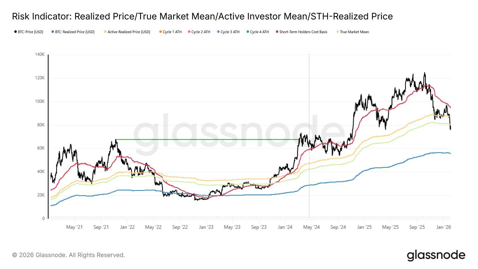 從鏈上結構來看,市場所承受的損傷更為深層。BTC 已明確跌破多項關鍵結構性支撐,其 中最具代表性的是 TrueMarketMean(真實市場均值),目前約位於 78,500 美元,且價 格在日線與週線層級皆收於該水準之下。過去在盤整階段曾作為需求錨點的指標,如今已 轉化為上方壓力,進一步強化整體偏空的市場結構。