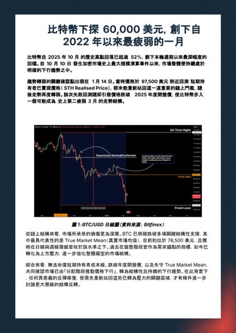 比特幣回落至 60,000 美元關卡,標誌著本輪週期以來最深幅度的修正。相較於 2025 年 10 月創下的歷史高點,跌幅已超過 52%,而 1 月亦成為自 2022 年以來表現最疲弱的月 份。從結構面來看,市場已明確跌破多項關鍵支撐,包括短期持有者成本線(STHCost Basis)、年度開盤價與真實市場均值,顯示市場已由分配階段正式轉入持續性下行趨勢。與 過往由強制清算主導的急跌不同,本輪下行主要由持續且對價格不敏感的現貨賣壓所推 動。最終引發比特幣史上單日市值最大跌幅,價格一度下探至 60,100 美元,隨後出現明顯 的反射性反彈。