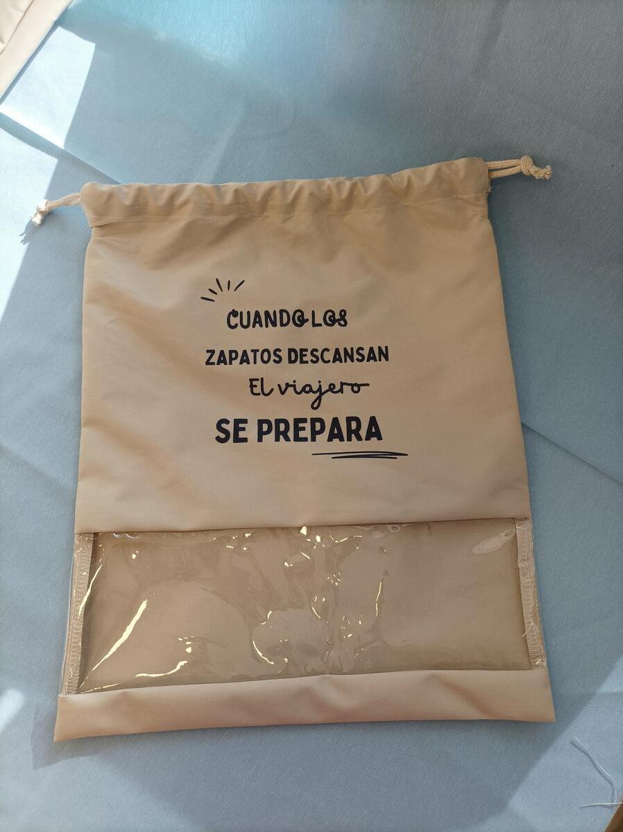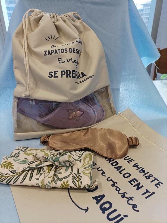 morral + bolsas con cierre + estuche para joyas + antifaz + pantuflas