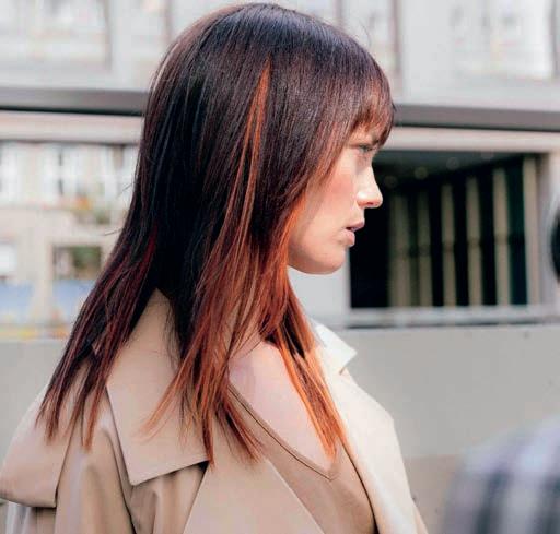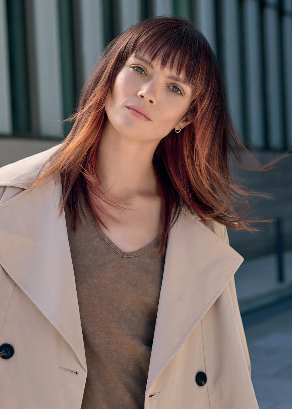 Šis įvaizdis – tai vizualinis preciziškumo efektas. Ryškaus vario atspalvio sruogos aplink veidą ir sodrios spalvos plaukai akimirksniu suteikia erdvumo ir kontūruoja – nereikia naudoti sudėtingos dažymo su folija technikos. Greitas, sumanus spalvų išdėstymas, užtikrinantis didžiausią klientų pasitenkinimą.