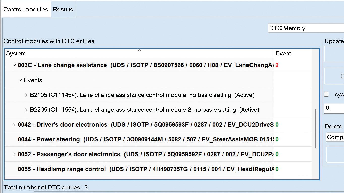 After completing these initial steps, the technician developed a hypothesis. Because the vehicle had recently undergone repairs in which the driver-side lane-change assist module was replaced and the passenger-side lanechange assist module was retained, he suspected a version mismatch between these two modules could be the root of the issue. This seemed logical based on his past experiences with other brands and how the problem was presenting in the Audi.