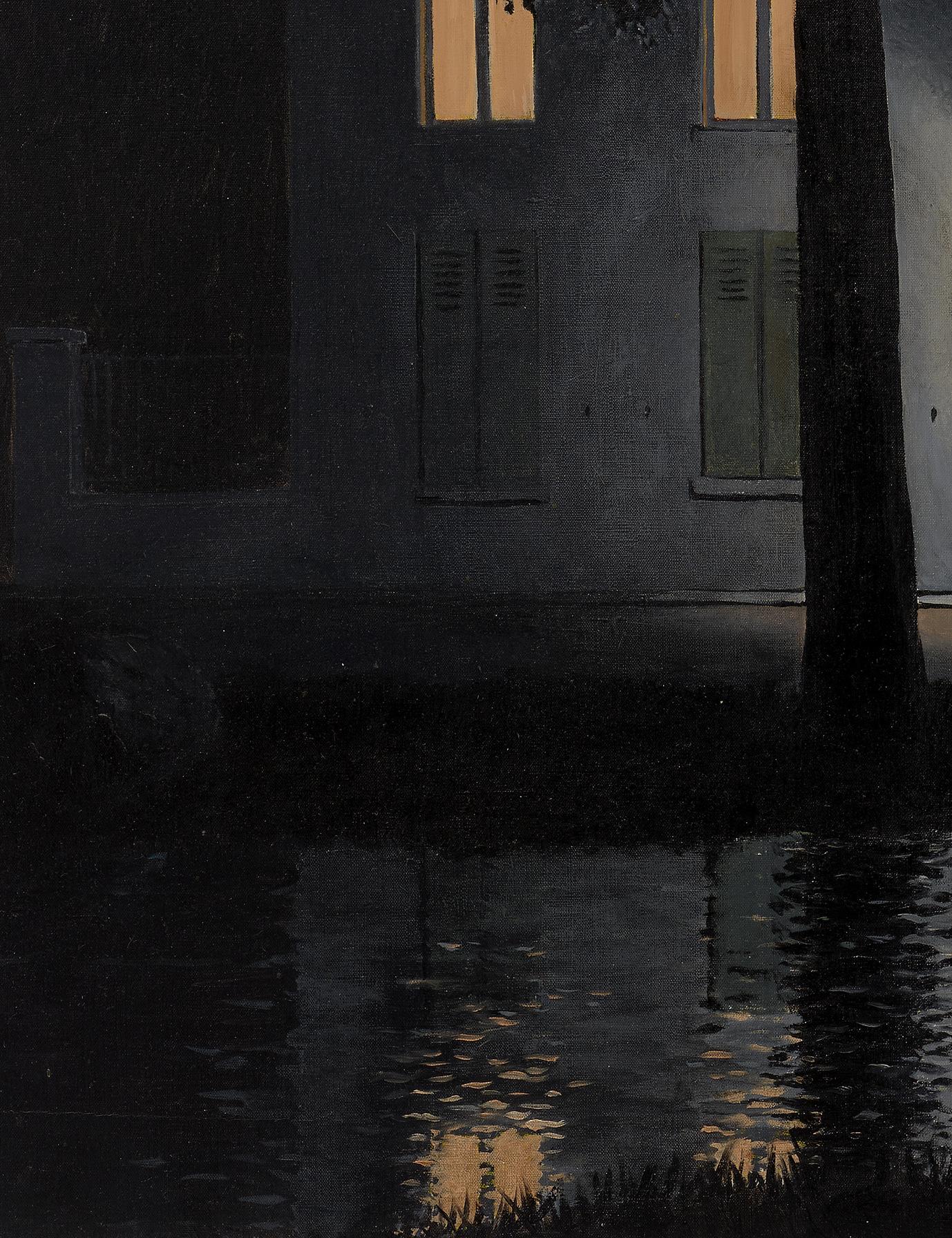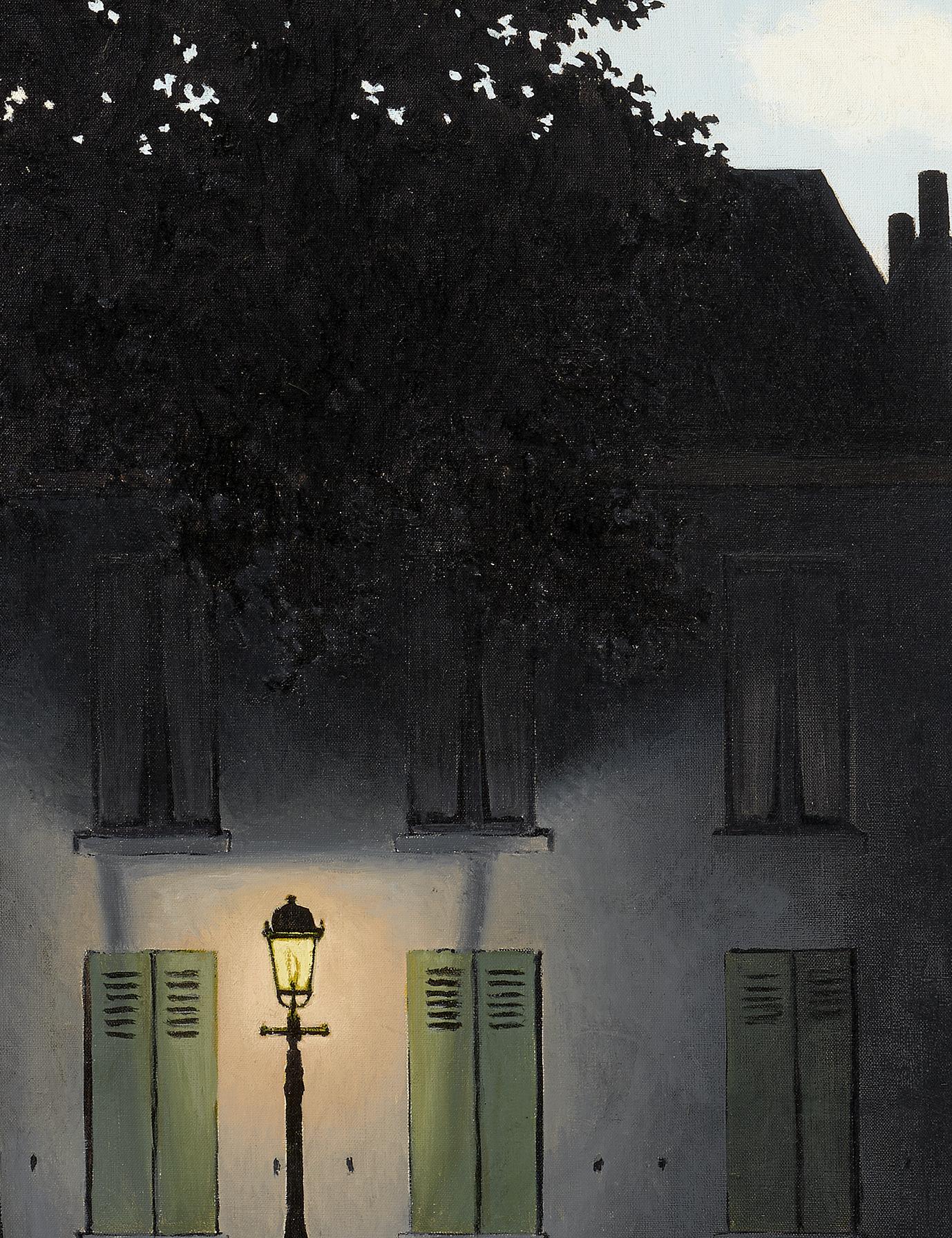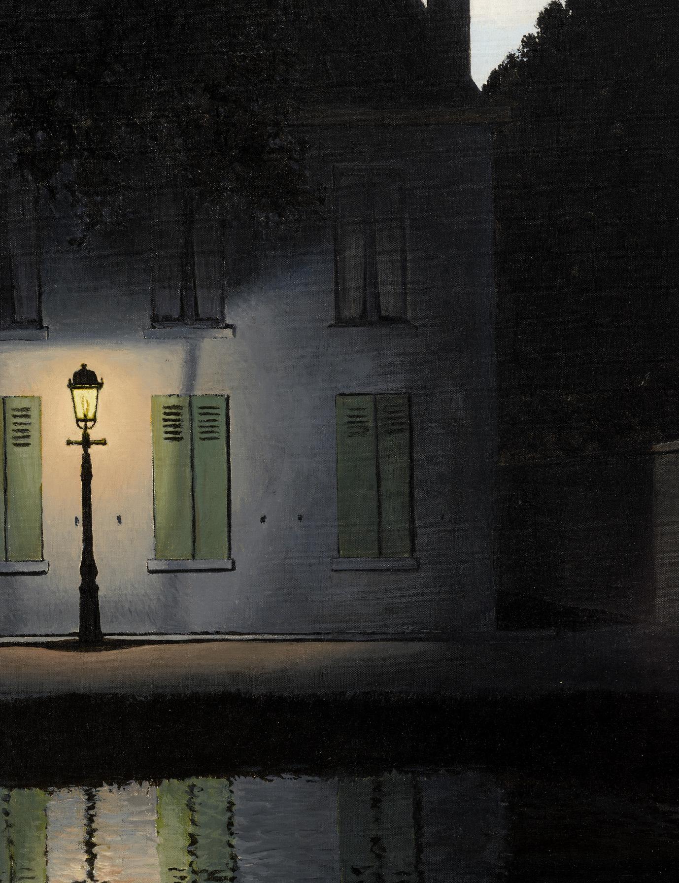 “You will see: in the evenings, it’s like being in the picture—L’empire des lumières… surrounded by gardens, and the houses looking directly on to the Boulevard Lambermont stand out against a wide sky” (quoted in D. Sylvester, op. cit., 1993, vol. III, p. 63). In the present work, the glow from the singular lamppost is softened, granting the composition a greater sense of warmth, which is echoed in the subtle illumination from the windows in the upper story of the house. As a result, the reflections in the water are more clearly discernible to the viewer, the outlines of the lamppost and the windows crisper as they appear mirrored in the water’s surface, creating the impression that perhaps another world hovers on the very edge of our own.